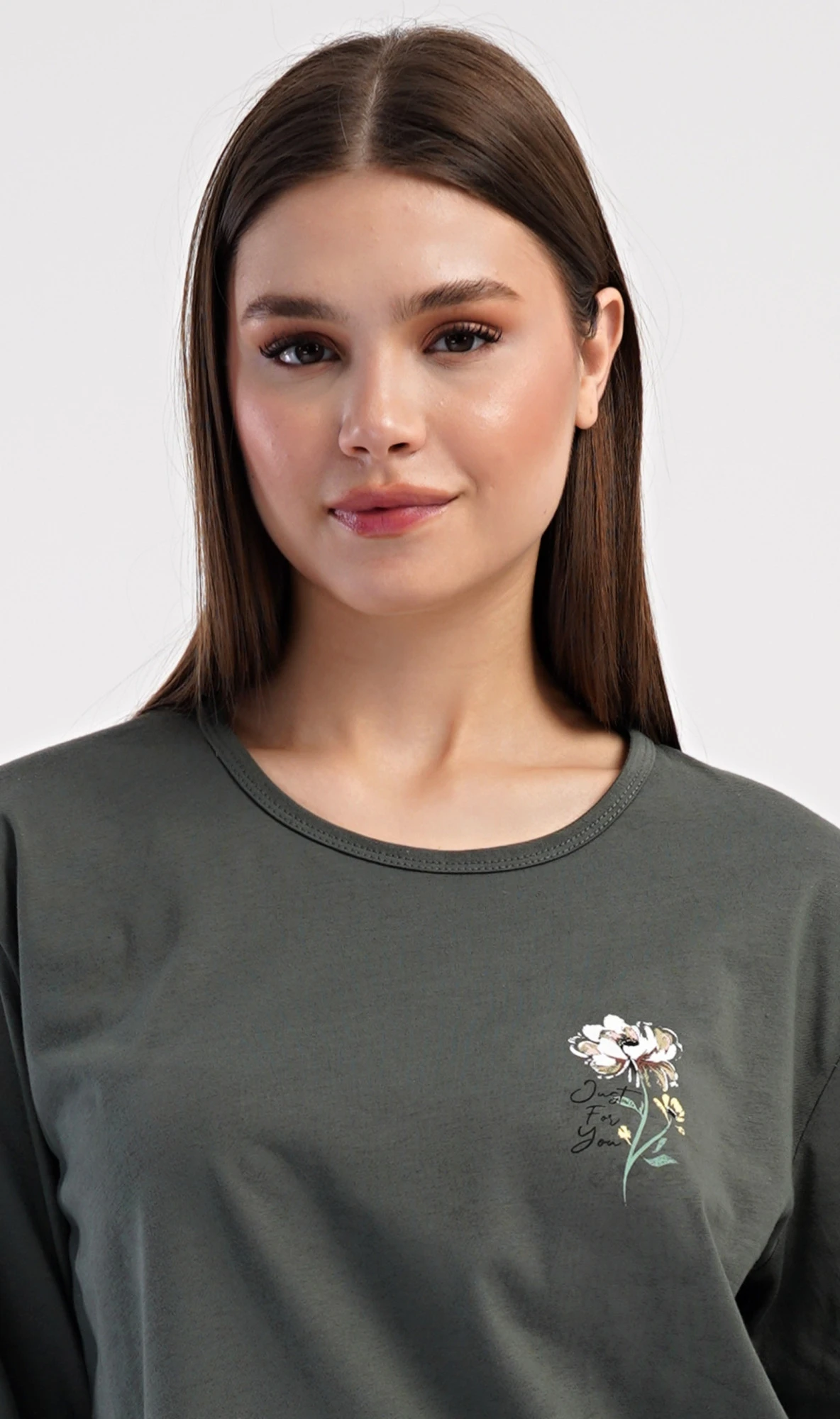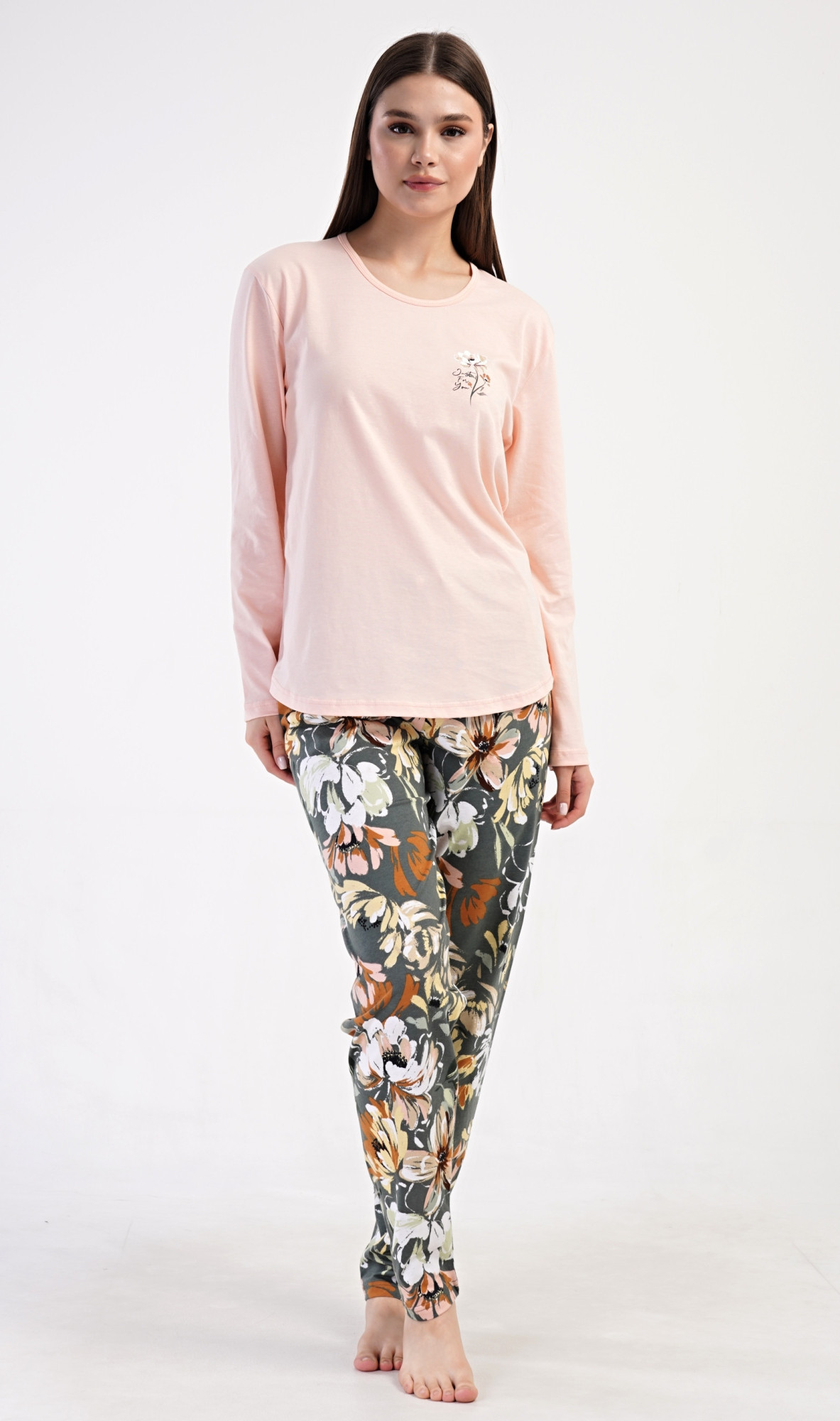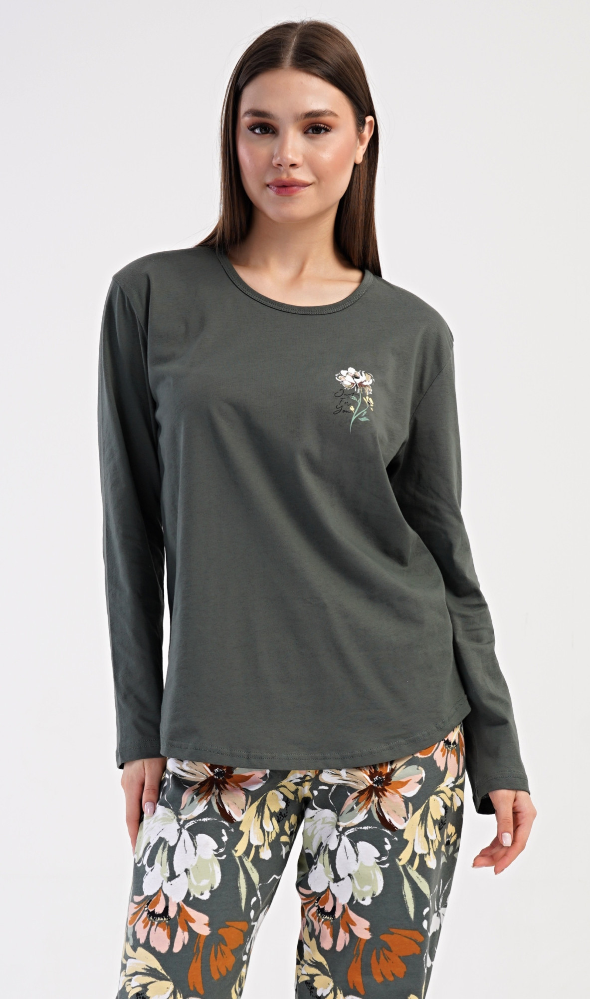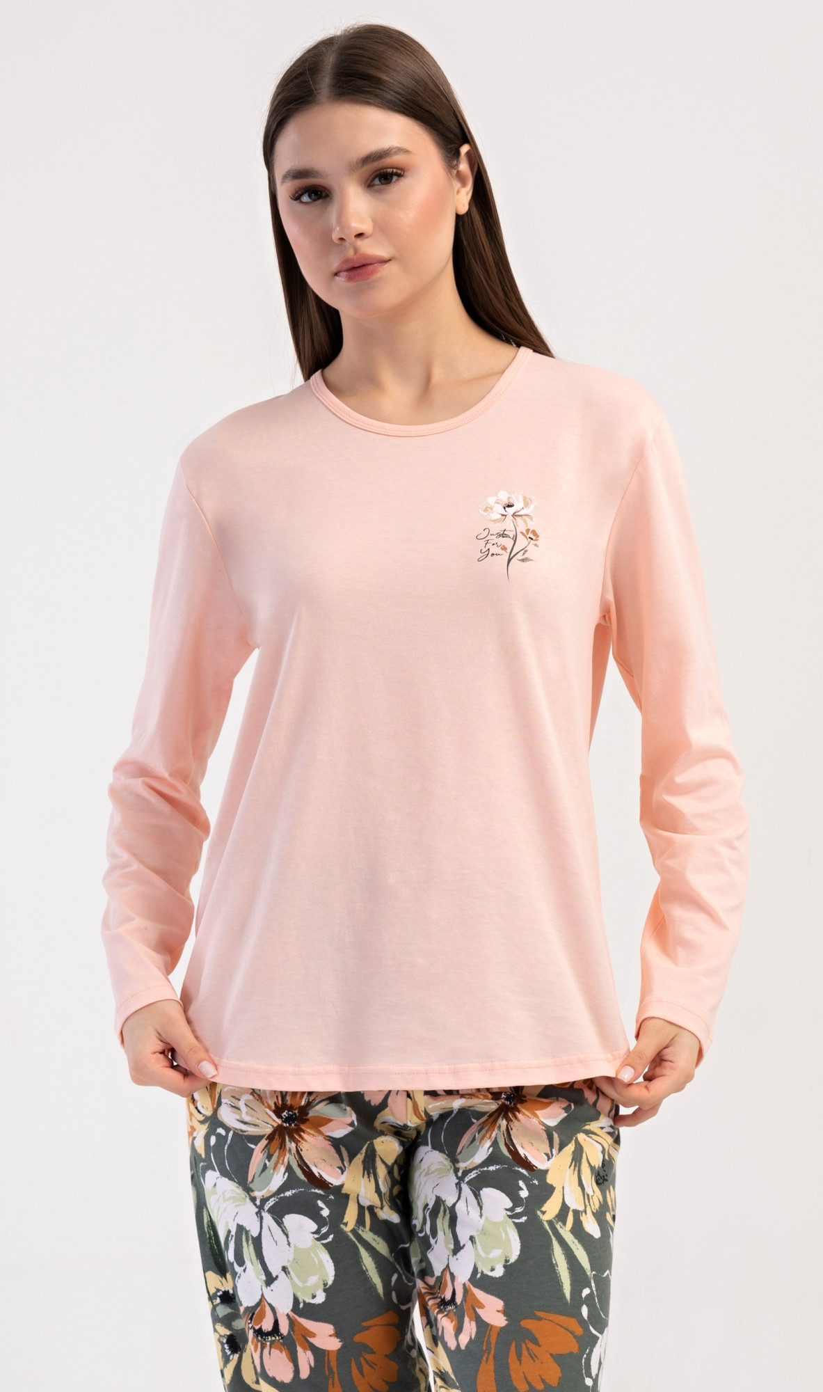 Dámské bavlněné dlouhé pyžamo Mariana. Dámské pyžamo se skládá z trika s dlouhým rukávem a dlouhých kalhot. Jednobarevné triko je ozdobeno obrázkem květiny. Tento motiv se opakuje i na kalhotách, které mají v pase gumu a šňůrku na stažení, nemají kapsy. Použitý bavlněný materiál je poddajný a příjemný na dotek.