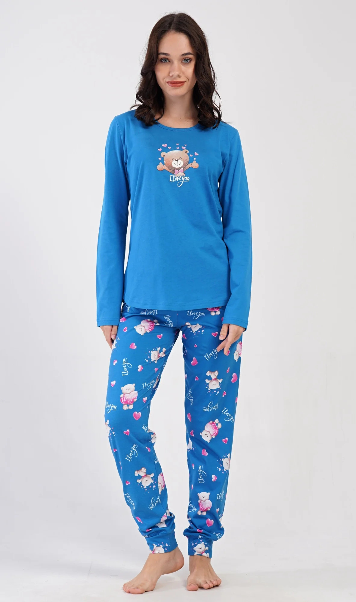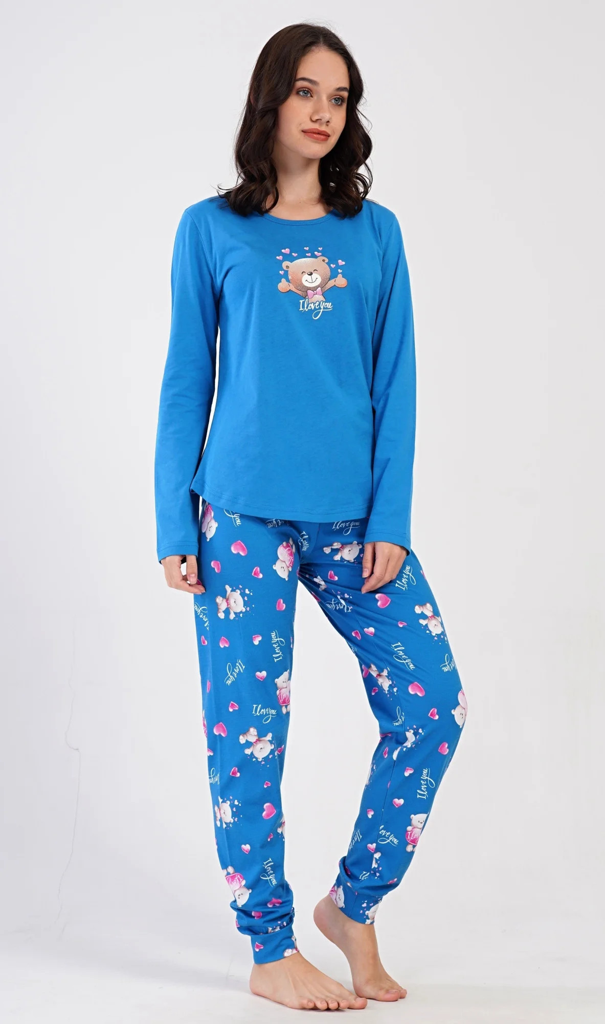 Dámské bavlněné dlouhé pyžamo Méďa I love you. Dámské pyžamo se skládá z trika s dlouhým rukávem a dlouhých kalhot. Triko je jednobarevné, zdobené obrázkem medvídka a nápisem I LOVE YOU. Obrázky medvídků se opakují i na kalhotách, které mají v pase gumu a šňůrku na stažení, nemají kapsy. Použitý bavlněný materiál je poddajný a příjemný na dotek.