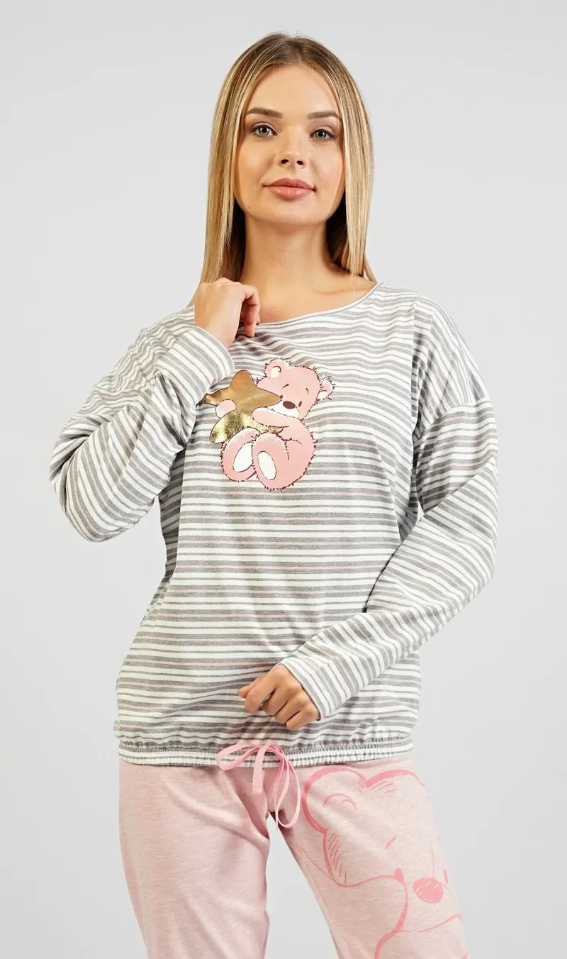 Dámské pyžamo dlouhé Méďa s hvězdou. Dámské pyžamo dlouhé se skládá z trika s dlouhým rukávem a dlouhých kalhot. Na pruhovaném triku je medvídek s pozlacenou hvězdou.Triko má šňůrku na stažení. Motiv medvídka se opakuje i na kalhotách. Kalhoty mají v pase gumu a šňůrku na stažení, jsou bez kapes. Použitý materiál s obsahem bavlny 70% je příjemný a poddajný na dotek.