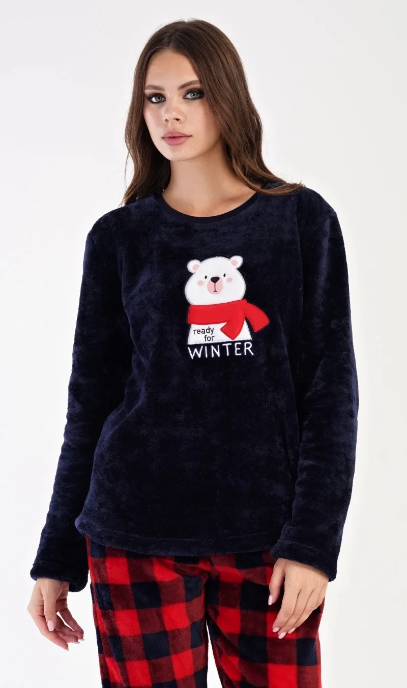 Dámské softové pyžamo dlouhé Méďa se šálou. Dámské pyžamo se skládá z trika s dlouhým rukávem a dlouhých kalhot. Triko s kulatým výstřihem je ozdobené aplikací medvídka a nápisem READY FOR WINTER. Kostkované kalhoty jsou zakončeny panty, mají praktické kapsy a ke stažení slouží guma a šňůrka. Použitý softový materiál je hebký a poddajný na dotek. Pyžamo je vhodné i jako domácí oblečení, obzvlášť ho oceníte v chladných dnech.