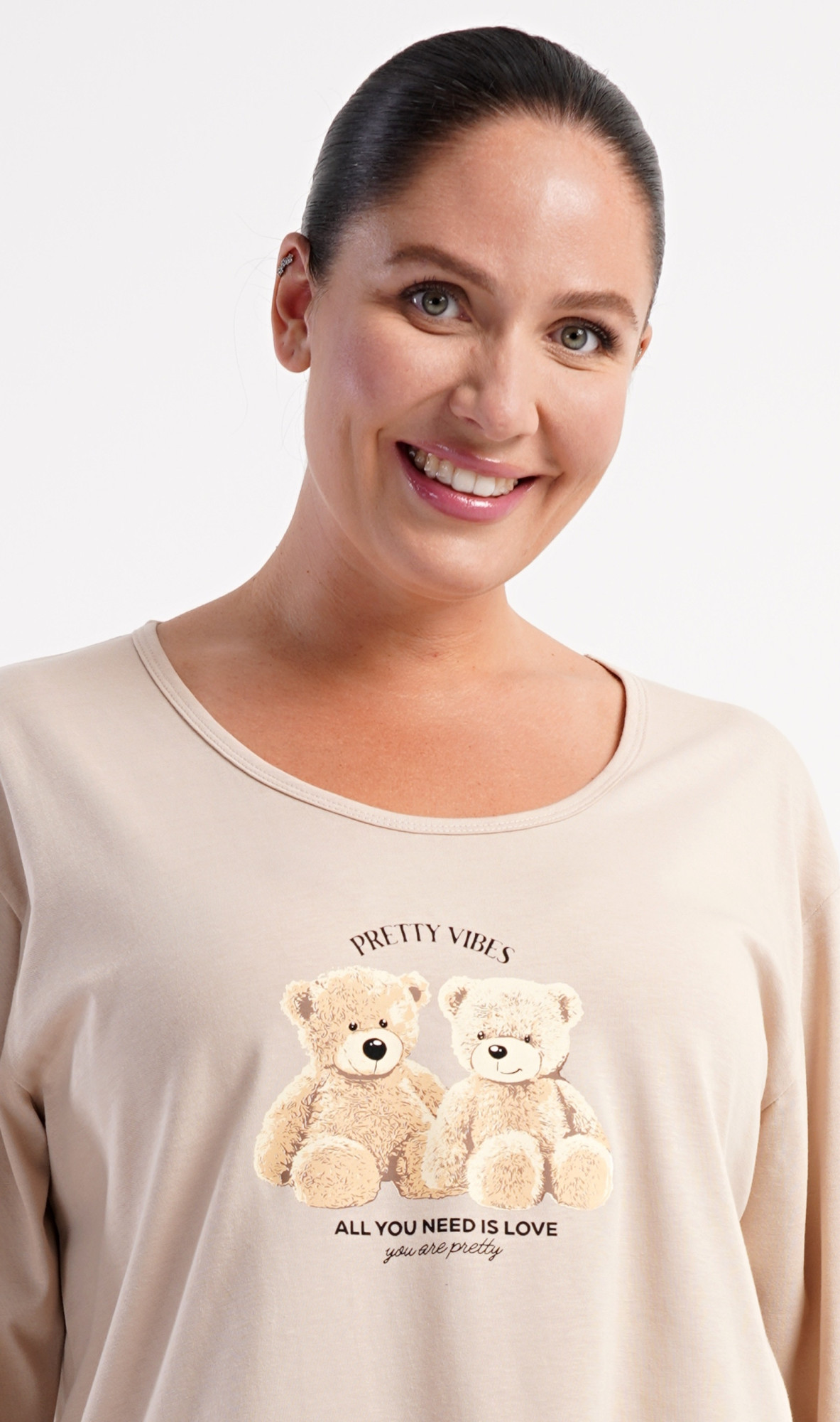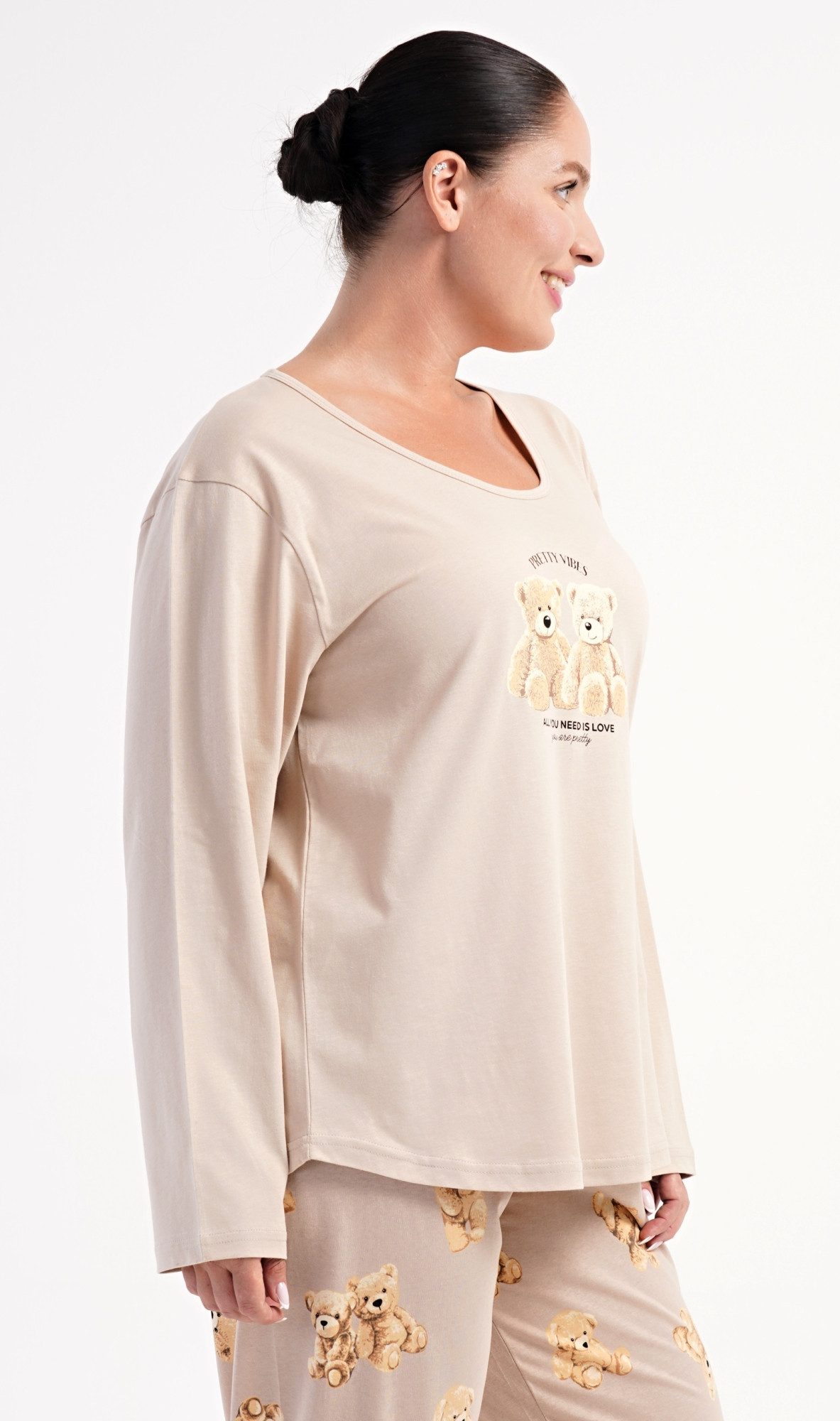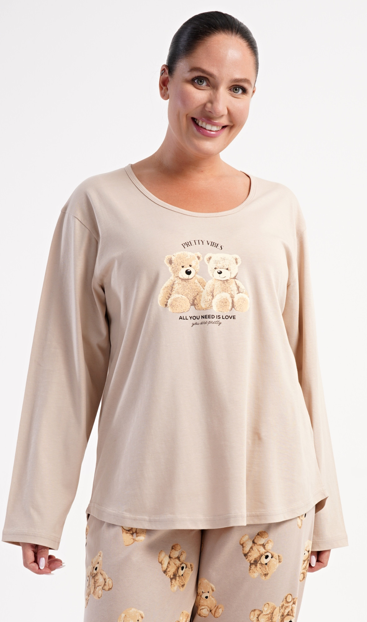 Dámské bavlněné dlouhé pyžamo Méďové. Dámské pyžamo se skládá z trika s dlouhým rukávem a dlouhých kalhot. Triko s kulatým výstřihem je na hrudi zdobeno obrázkem plyšových medvědů. Tento motiv se opakuje i na kalhotách, které mají v pase gumu a šňůrku na stažení, nemají kapsy. Použitý bavlněný materiál je poddajný a příjemný na dotek.
