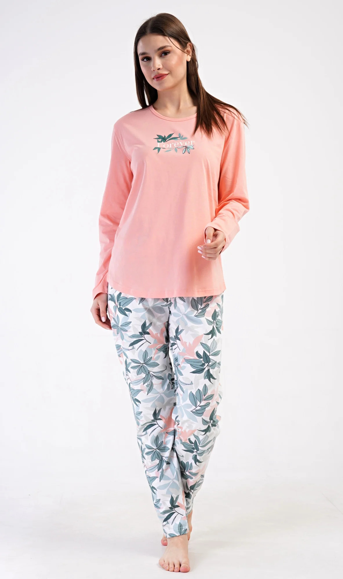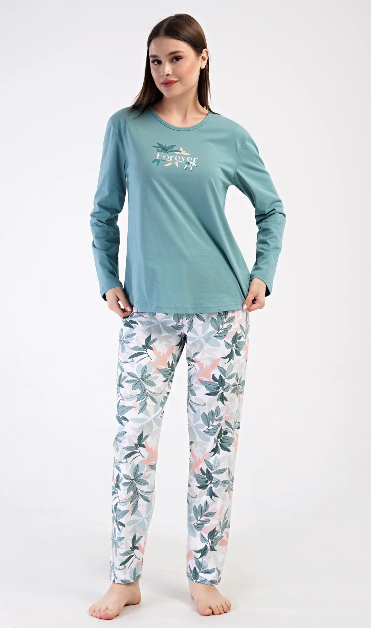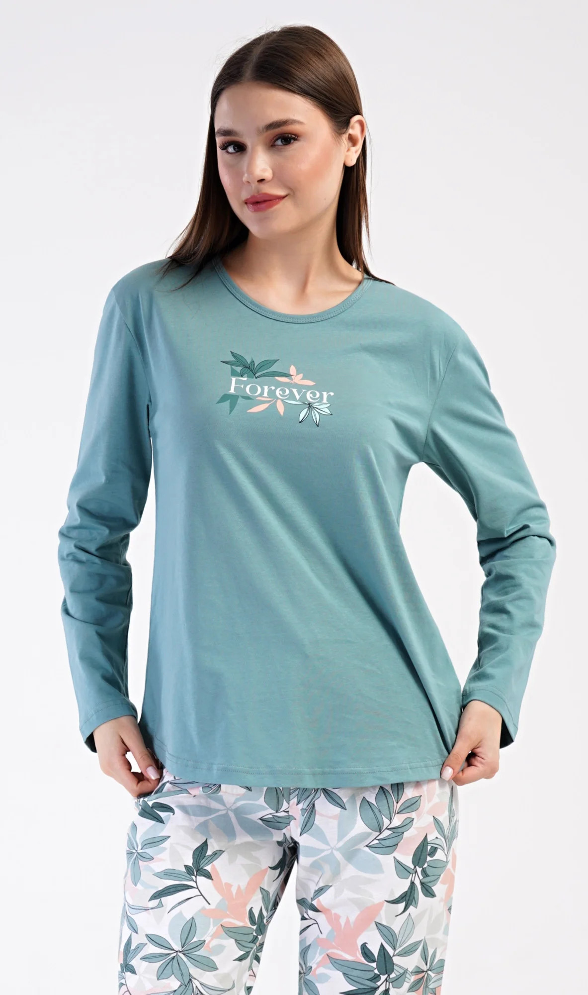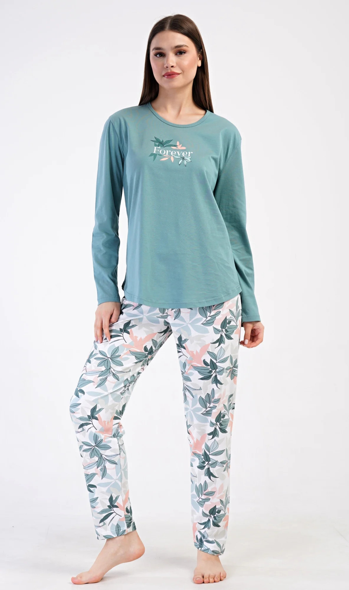 Dámské bavlněné dlouhé pyžamo Melinda. Dámské pyžamo se skládá z trika s dlouhým rukávem a dlouhých kalhot. Triko je jednobarevné, zdobené na hrudi drobným obrázkem větviček a nápis 'Forever'. Motiv větviček se opakuje i na kalhotách, které mají v pase gumu a šňůrku na stažení, nemají kapsy. Použitý bavlněný materiál je poddajný a příjemný na dotek.