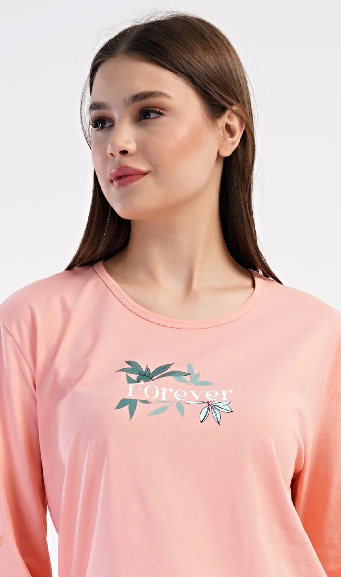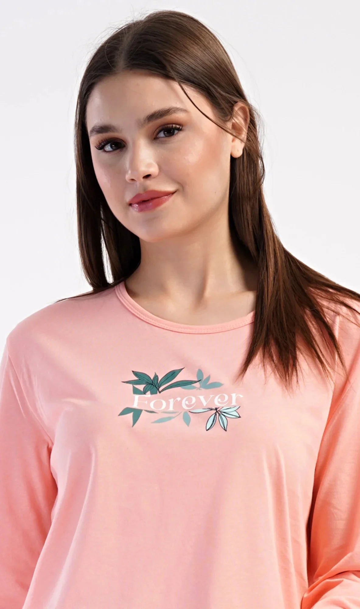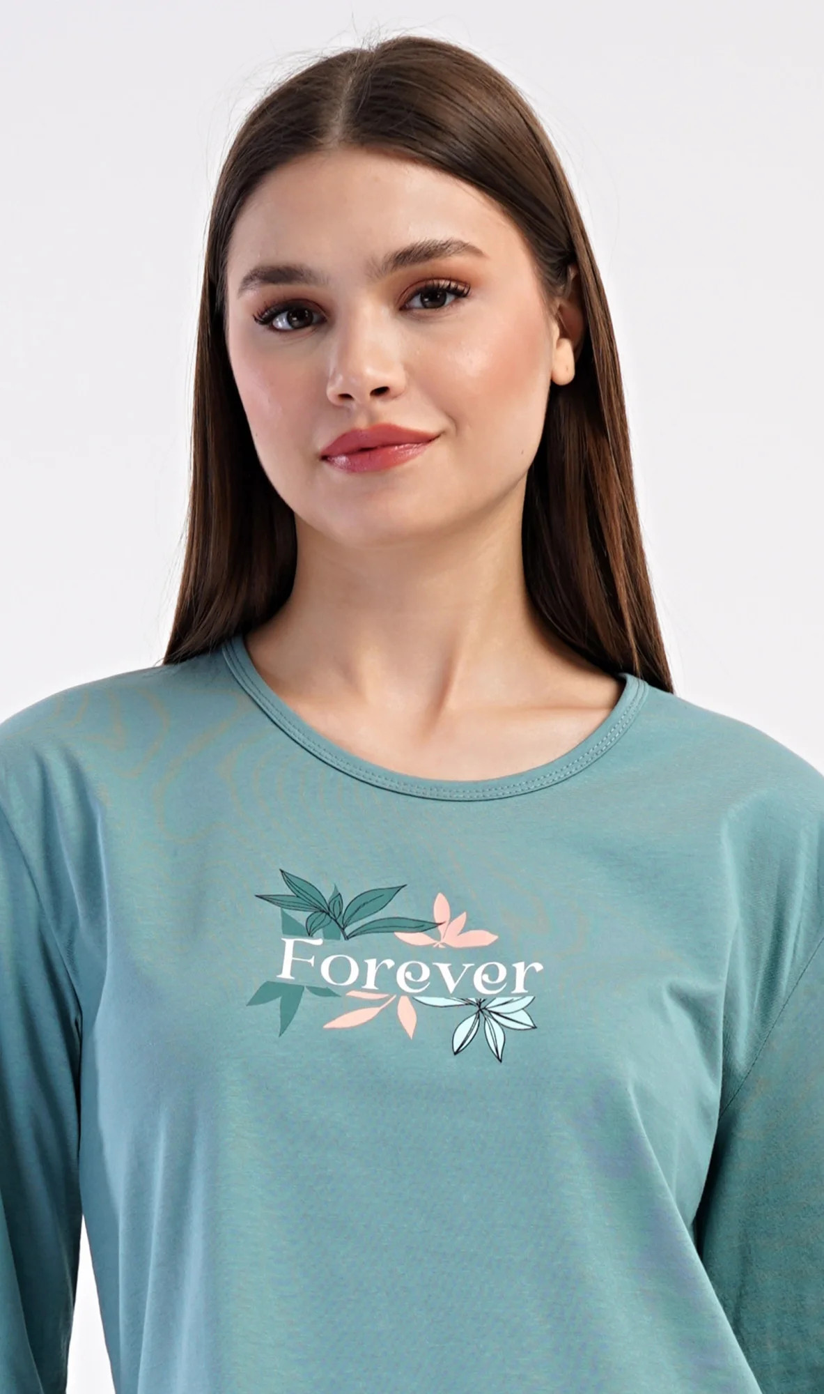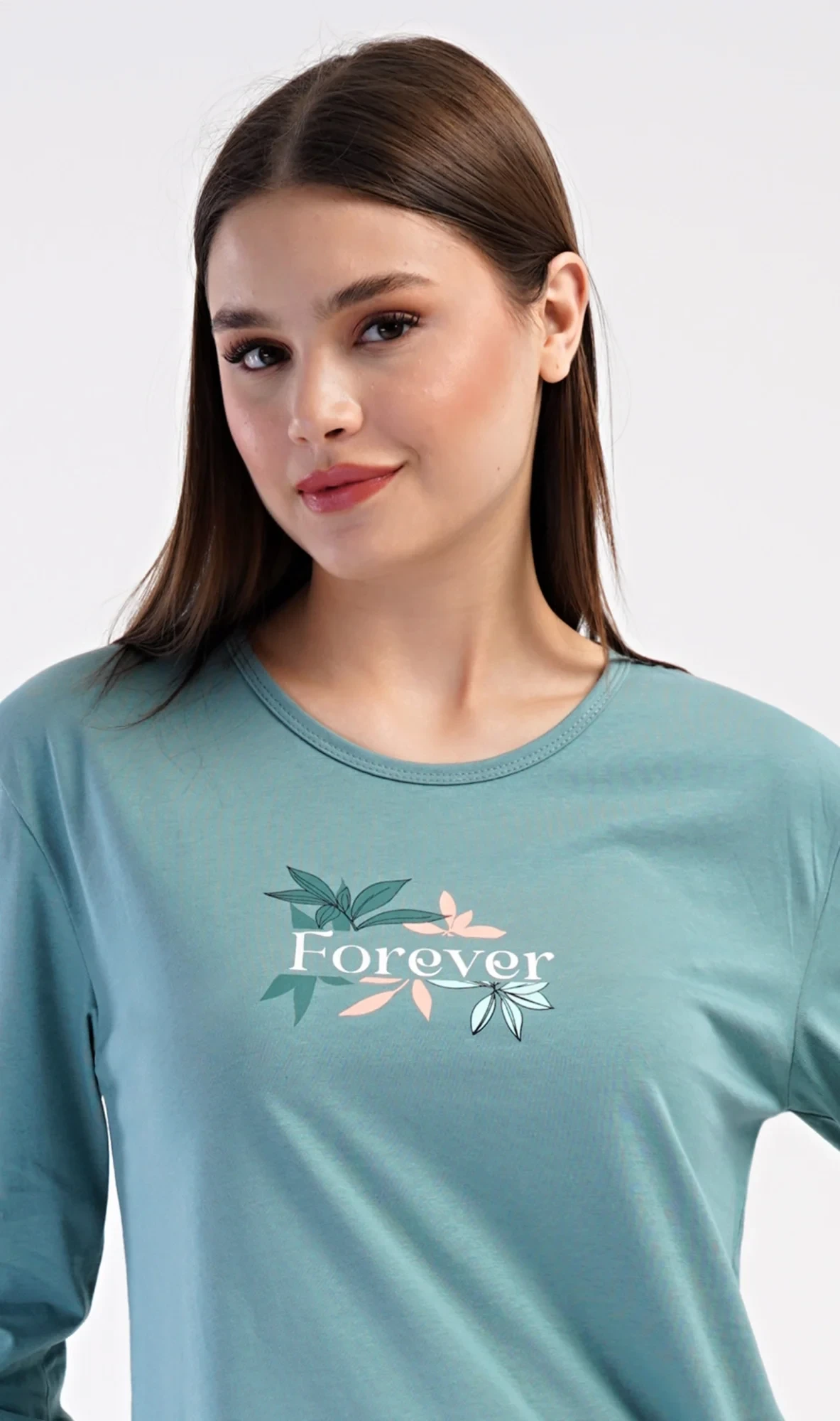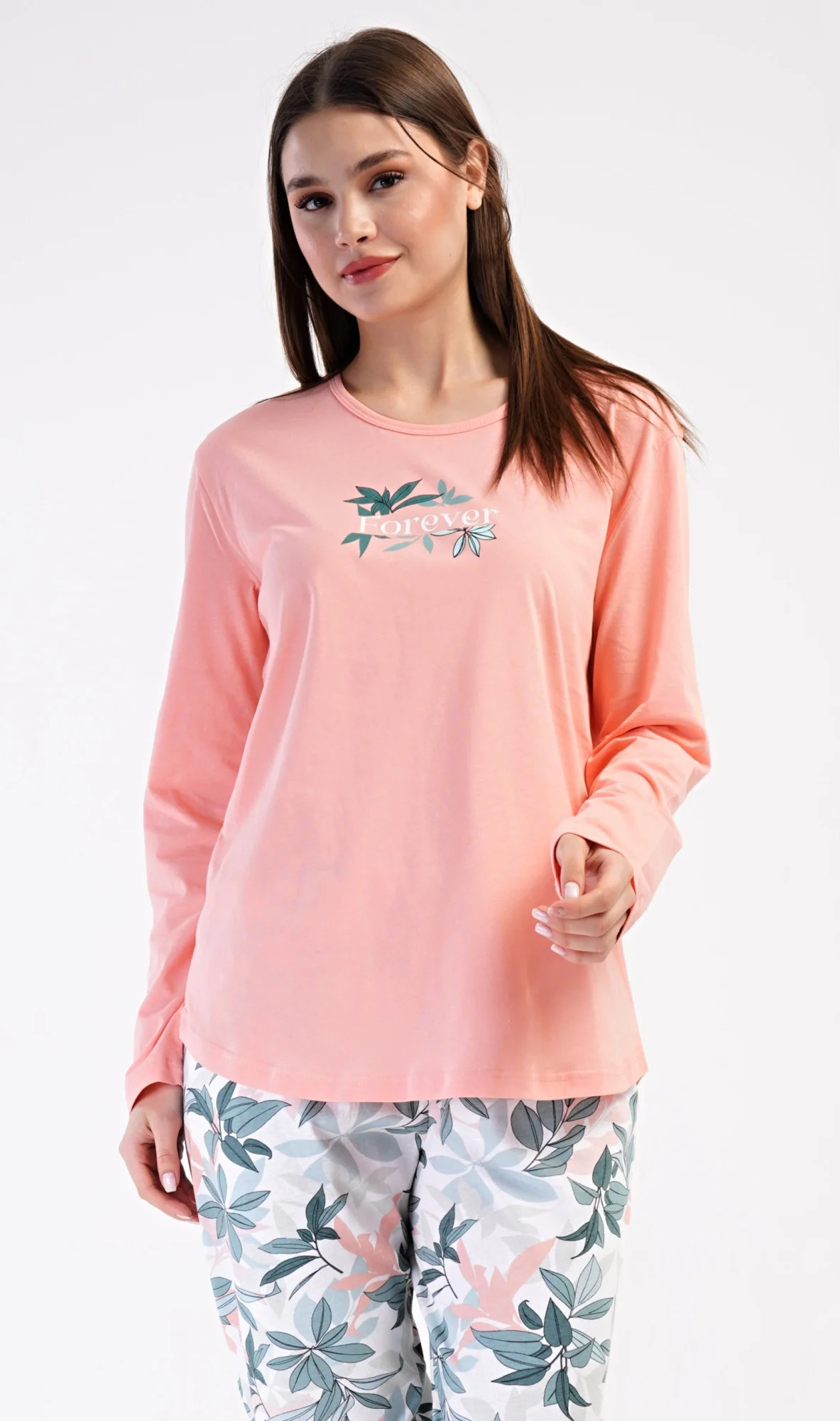 Dámské bavlněné dlouhé pyžamo Melinda. Dámské pyžamo se skládá z trika s dlouhým rukávem a dlouhých kalhot. Triko je jednobarevné, zdobené na hrudi drobným obrázkem větviček a nápis 'Forever'. Motiv větviček se opakuje i na kalhotách, které mají v pase gumu a šňůrku na stažení, nemají kapsy. Použitý bavlněný materiál je poddajný a příjemný na dotek.