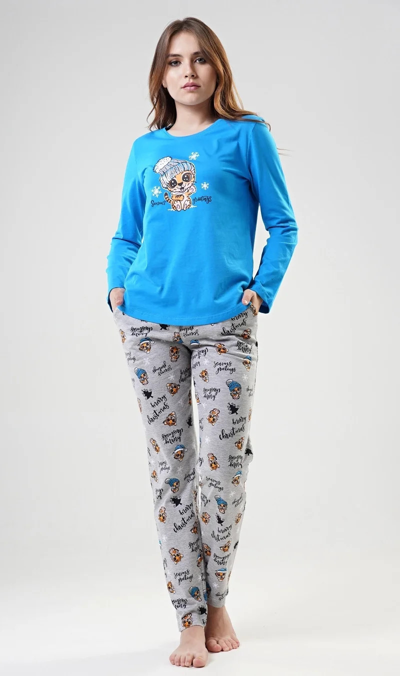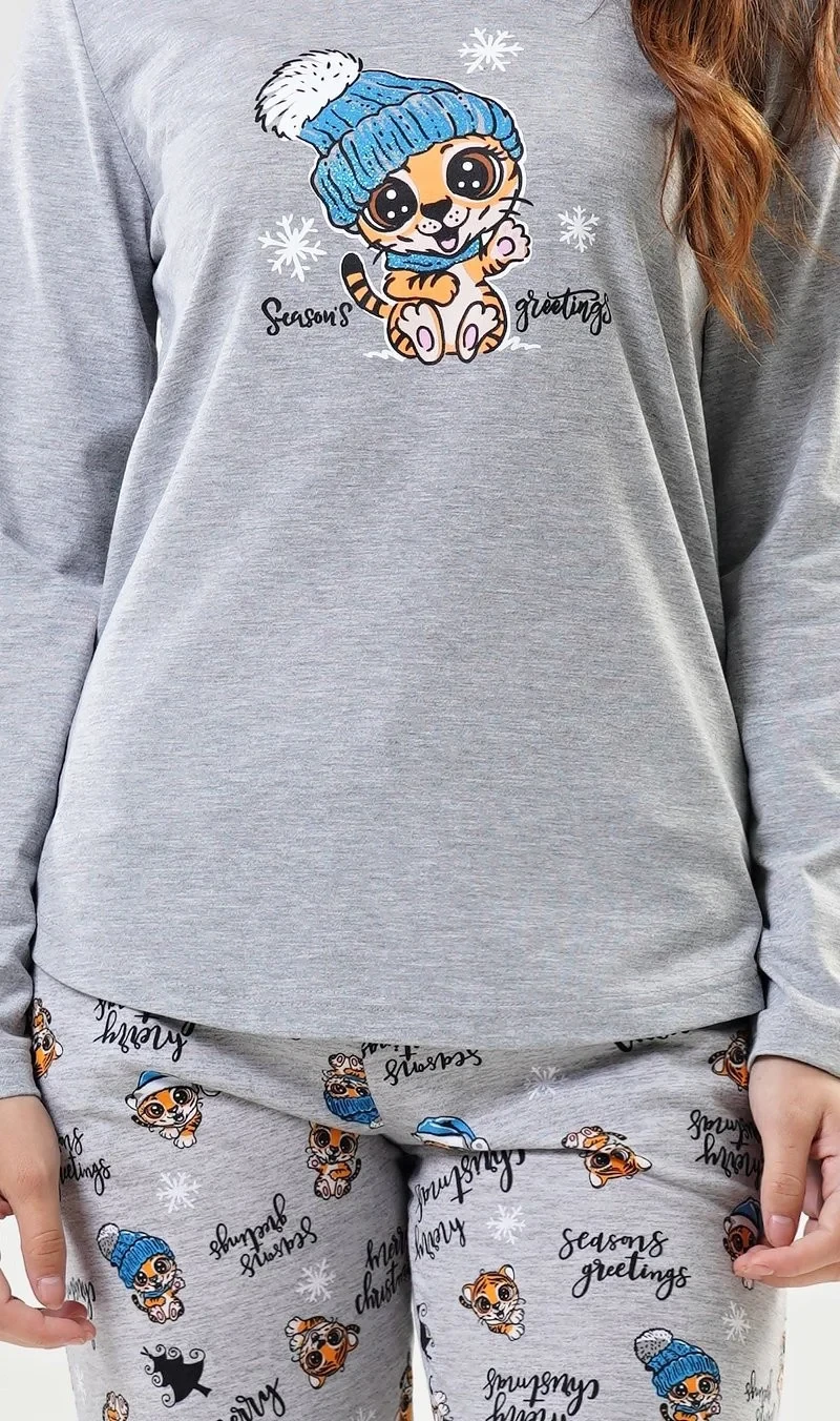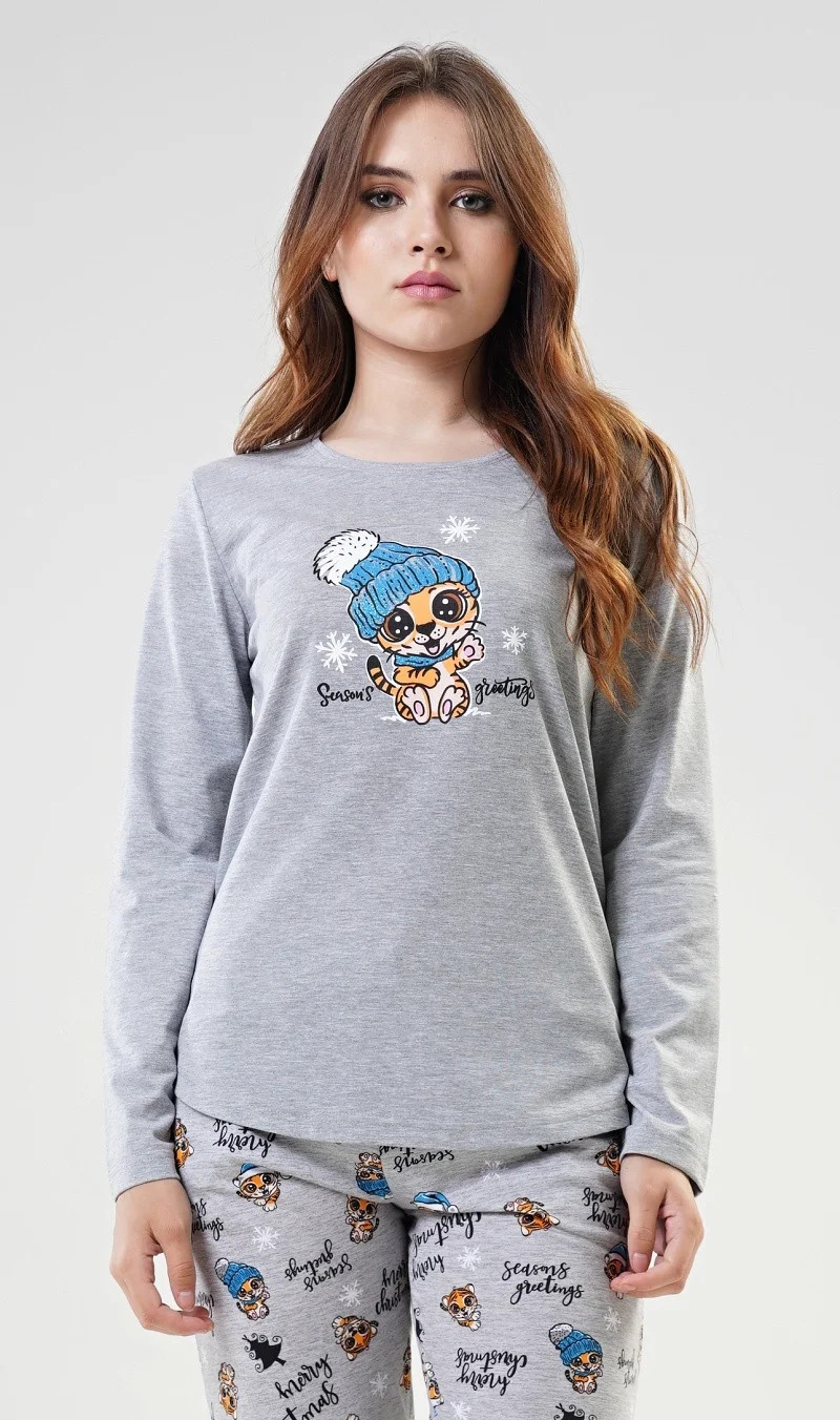 Dámské bavlněné pyžamo dlouhé Tygřík. Dámské pyžamo se skládá z trička s dlouhým rukávem a dlouhých kalhot. Triko je jednobarevné, zdobené potiskem roztomilého tygříka s čepicí. Kalhoty jsou šedé, potištěné malými tygry a nápisy. Kalhoty jsou do gumy, na stažení šňůrkou a mají kapsy. Použitý materiál je poddajný a jemný na dotek.