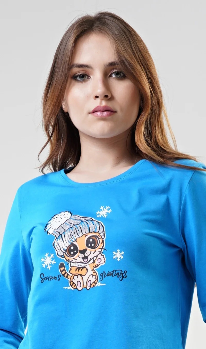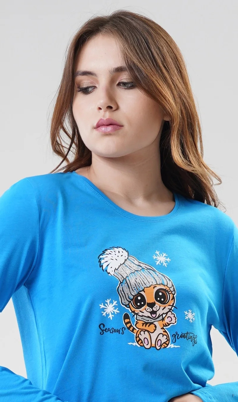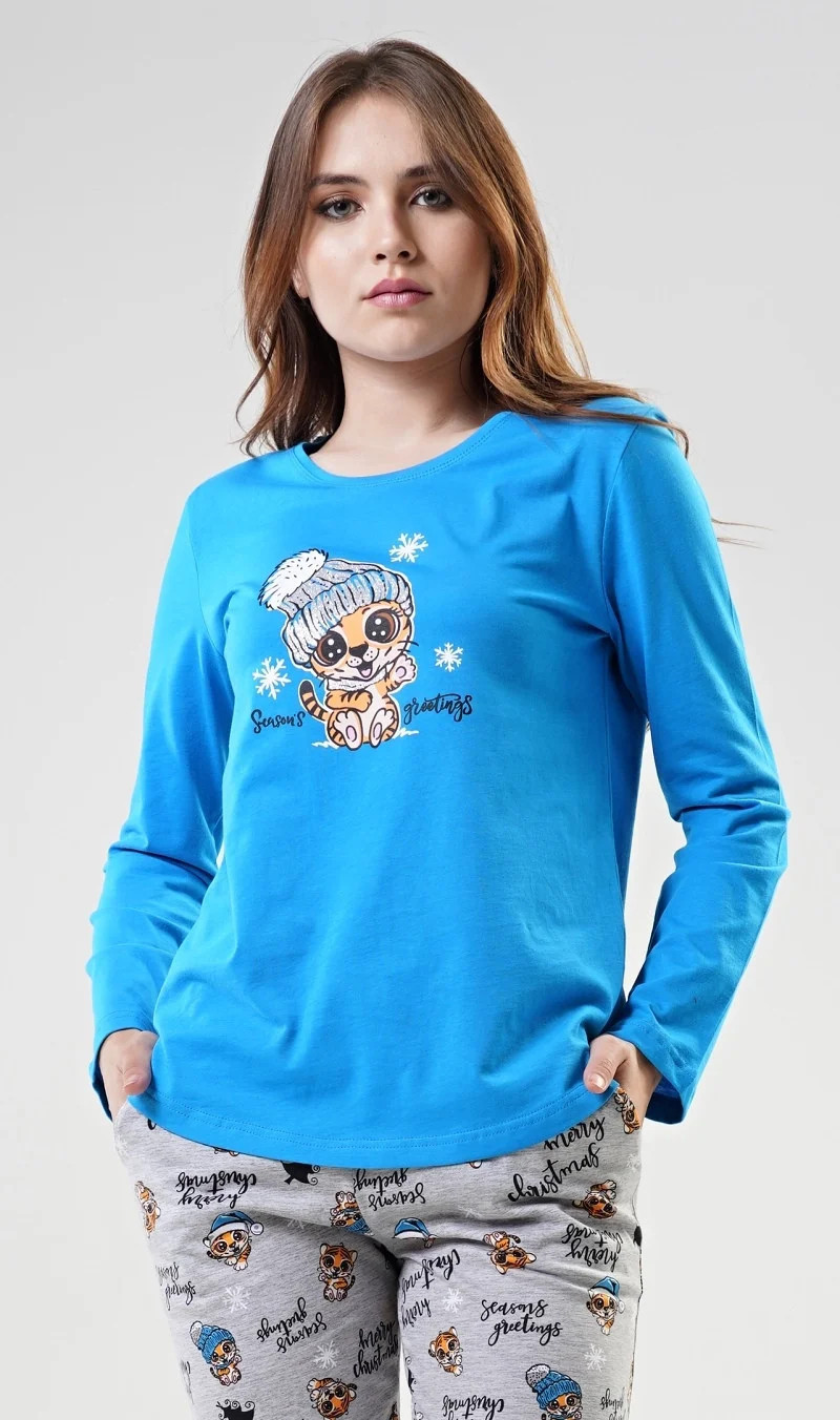 Dámské bavlněné pyžamo dlouhé Tygřík. Dámské pyžamo se skládá z trička s dlouhým rukávem a dlouhých kalhot. Triko je jednobarevné, zdobené potiskem roztomilého tygříka s čepicí. Kalhoty jsou šedé, potištěné malými tygry a nápisy. Kalhoty jsou do gumy, na stažení šňůrkou a mají kapsy. Použitý materiál je poddajný a jemný na dotek.