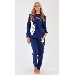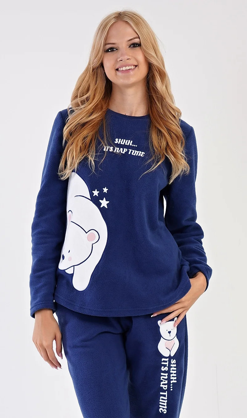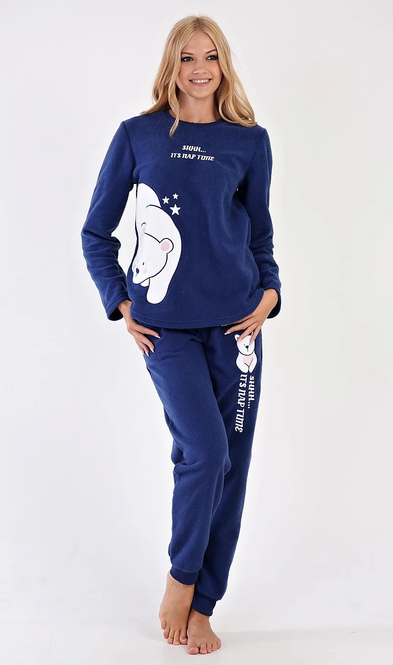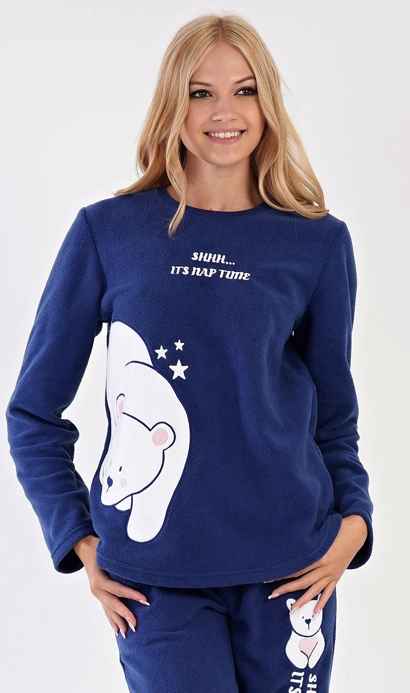 Dámské polarové dlouhé pyžamo Lední medvěd. Dámské pyžamo se skládá z trika s dlouhým rukávem a dlouhých kalhot. Triko je ozdobené aplikací - obrázkem ledního medvěda a nápisem SHHH... ITS NAP TIME. Polarový materiál je hřejivý a hebký na dotek. Vzorované kalhoty jsou do gumy, mají šňůrku na stažení a praktické kapsy, také jsou vyrobeny z polaru a ozdobené stejným motivem jako triko. Kalhoty jsou zakončené lemy. Toto pyžamko je díky hřejivosti vhodné i jako domácí oblečení pro chladné dny.