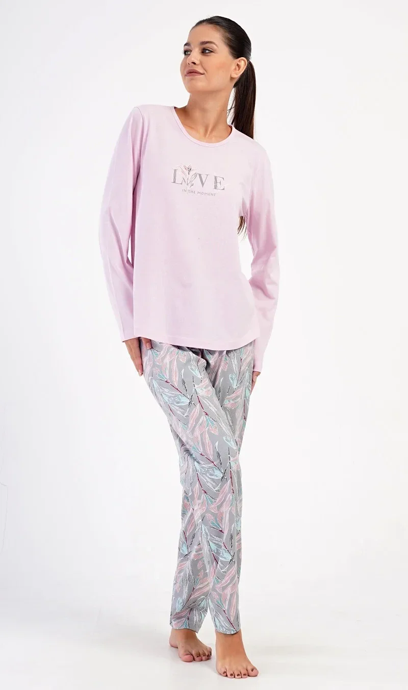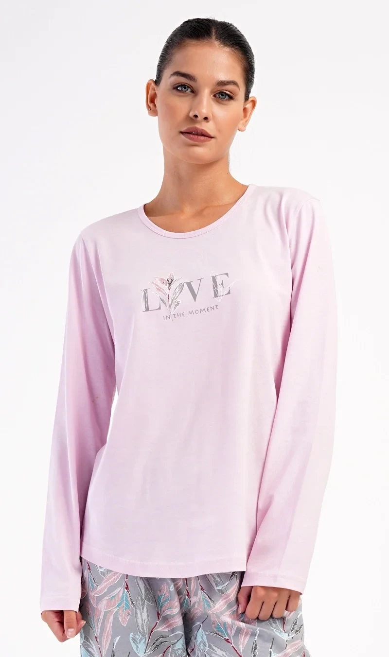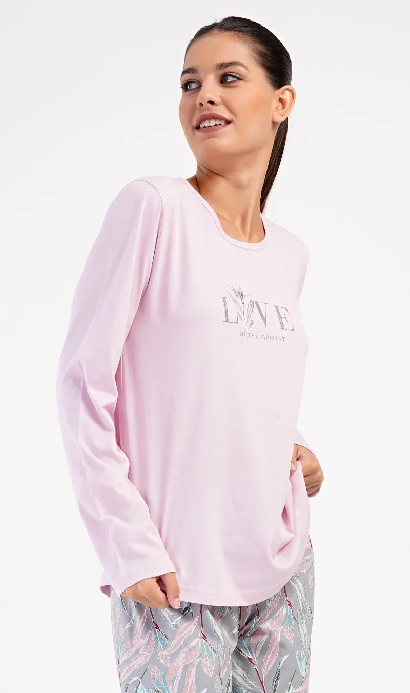 Dámské bavlněné dlouhé pyžamo Kika. Dámské pyžamo se skládá z trika s dlouhým rukávem a dlouhých kalhot. Triko je jednobarevné, zdobené obrázkem větvičky a nápisem 'Live in the moment'. Potisk větviček a listů se opakuje i na kalhotách, které mají v pase gumu a šňůrku na stažení, nemají kapsy. Použitý bavlněný materiál je poddajný a příjemný na dotek.