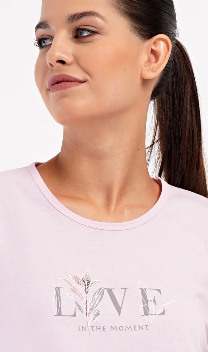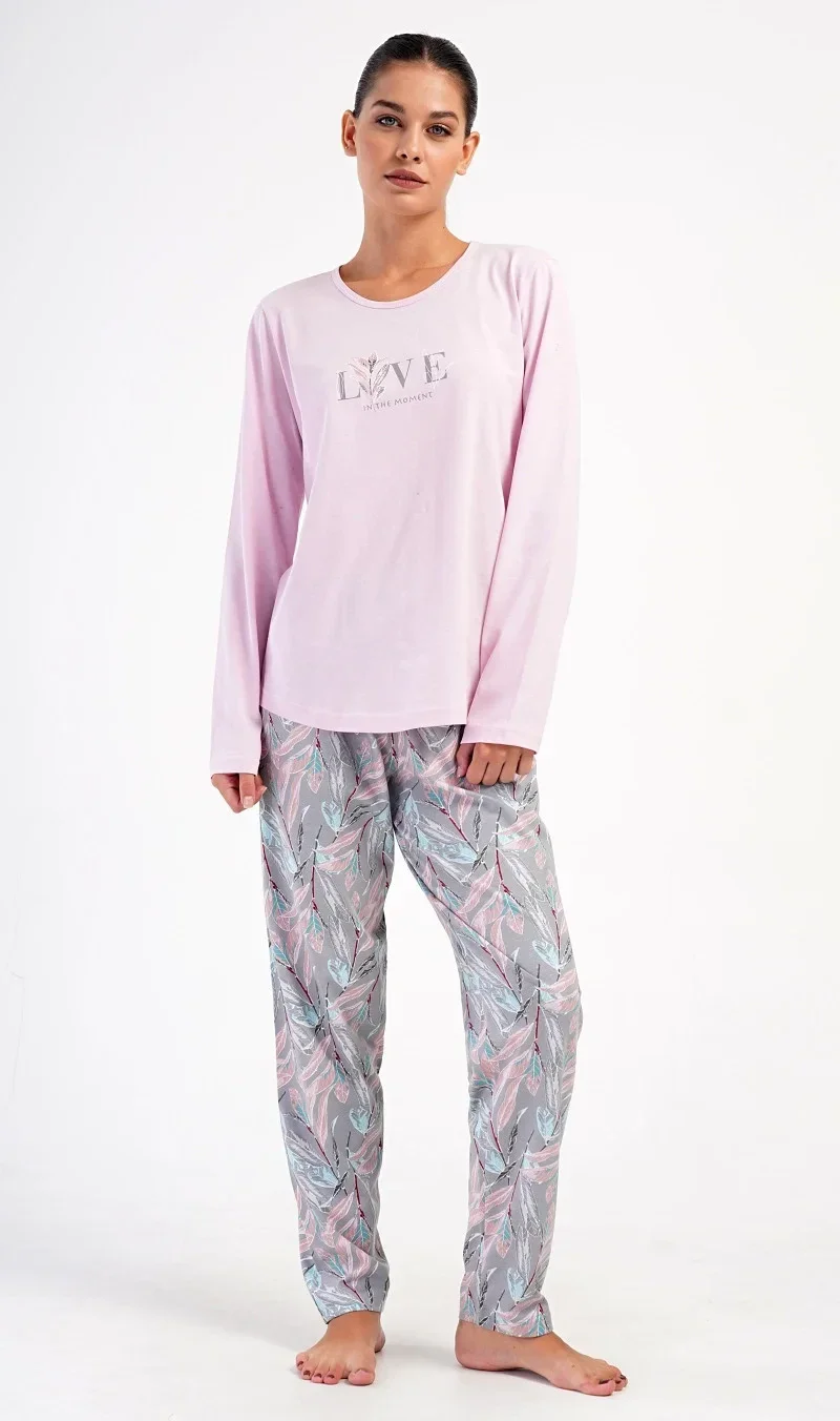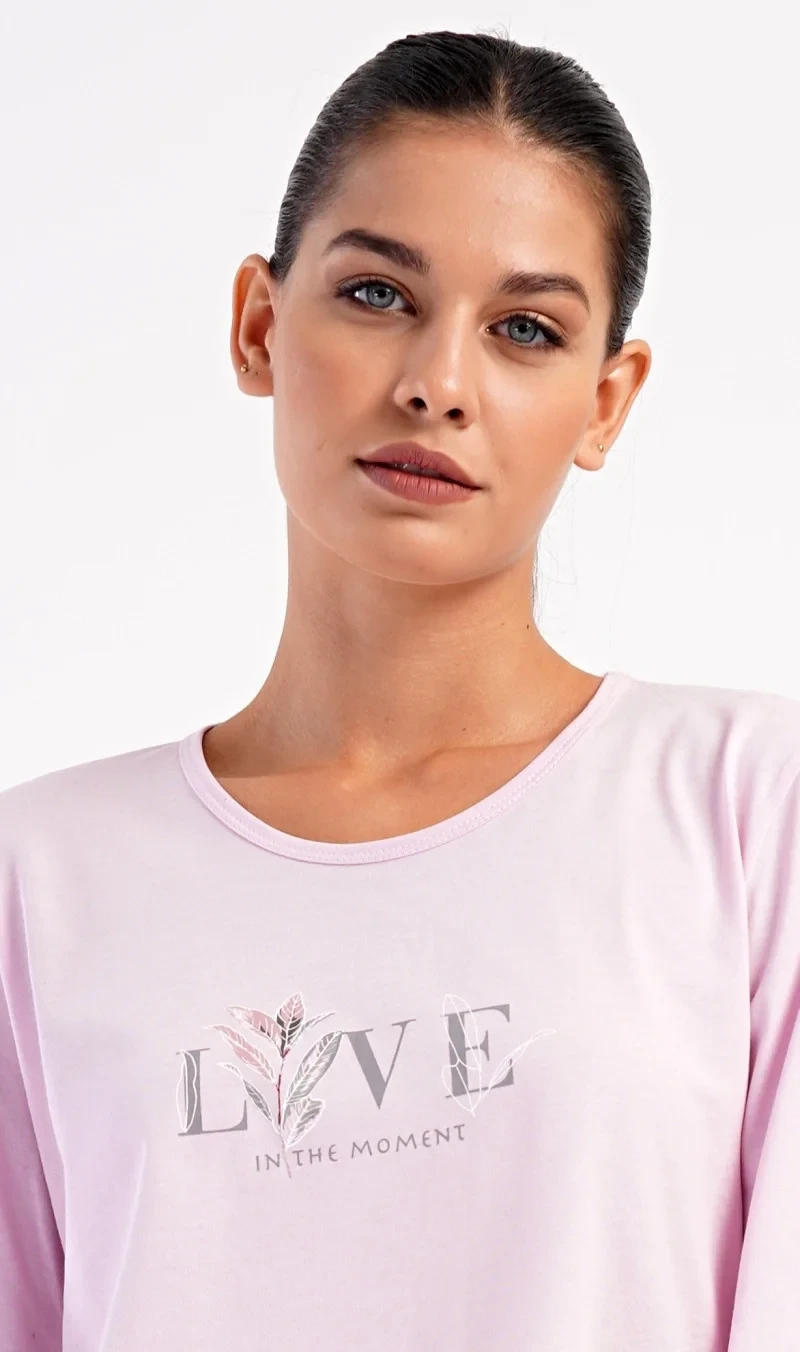 Dámské bavlněné dlouhé pyžamo Kika. Dámské pyžamo se skládá z trika s dlouhým rukávem a dlouhých kalhot. Triko je jednobarevné, zdobené obrázkem větvičky a nápisem 'Live in the moment'. Potisk větviček a listů se opakuje i na kalhotách, které mají v pase gumu a šňůrku na stažení, nemají kapsy. Použitý bavlněný materiál je poddajný a příjemný na dotek.