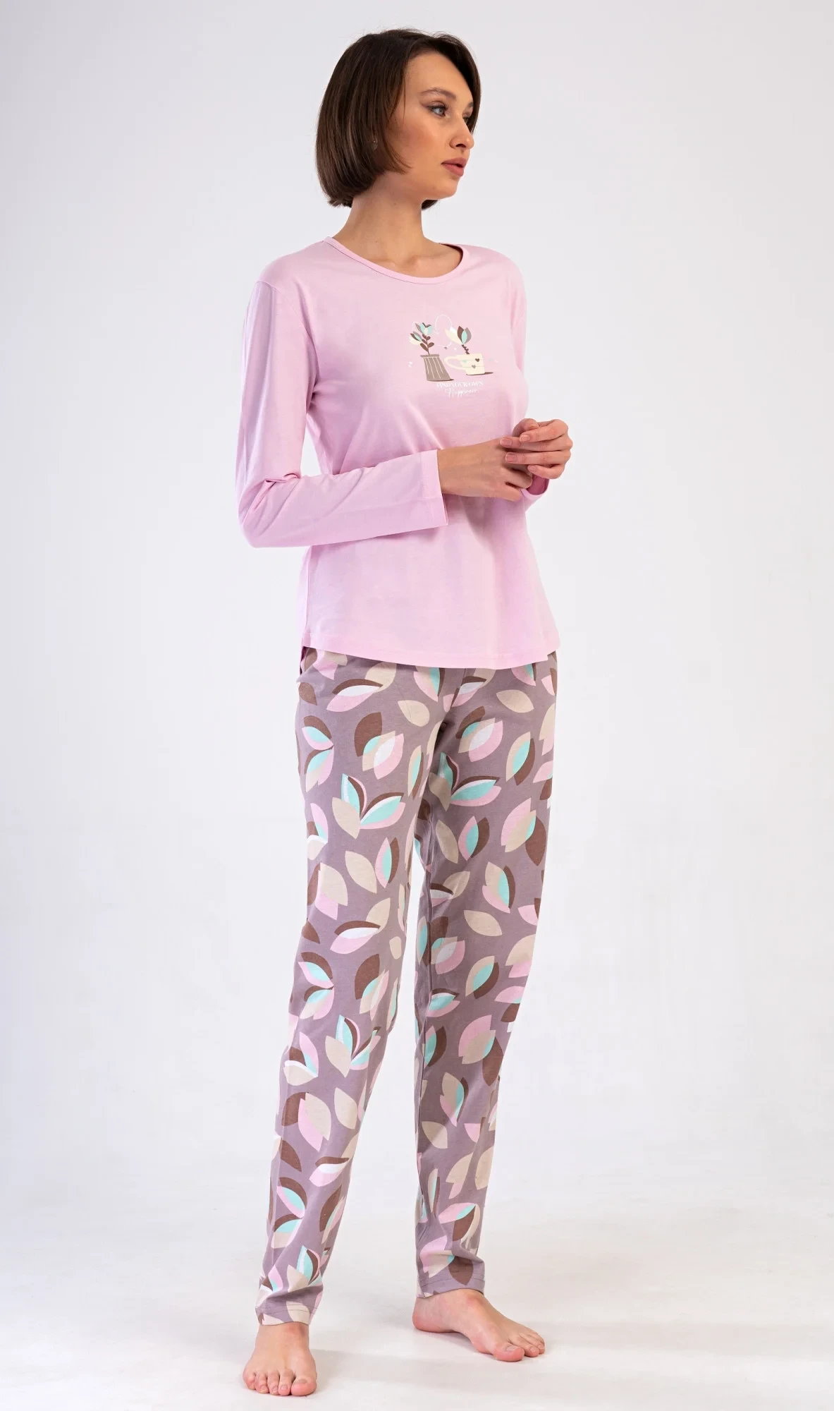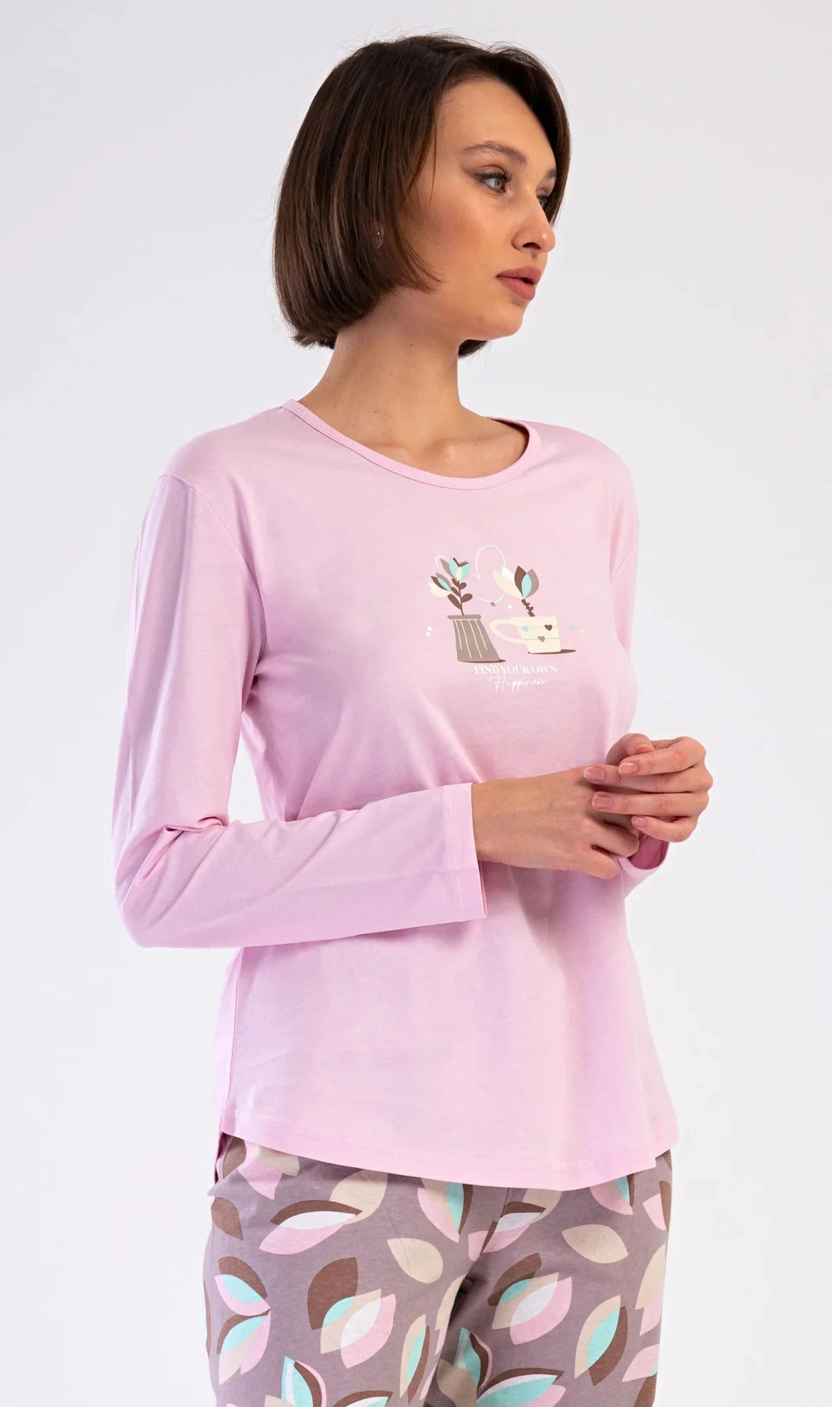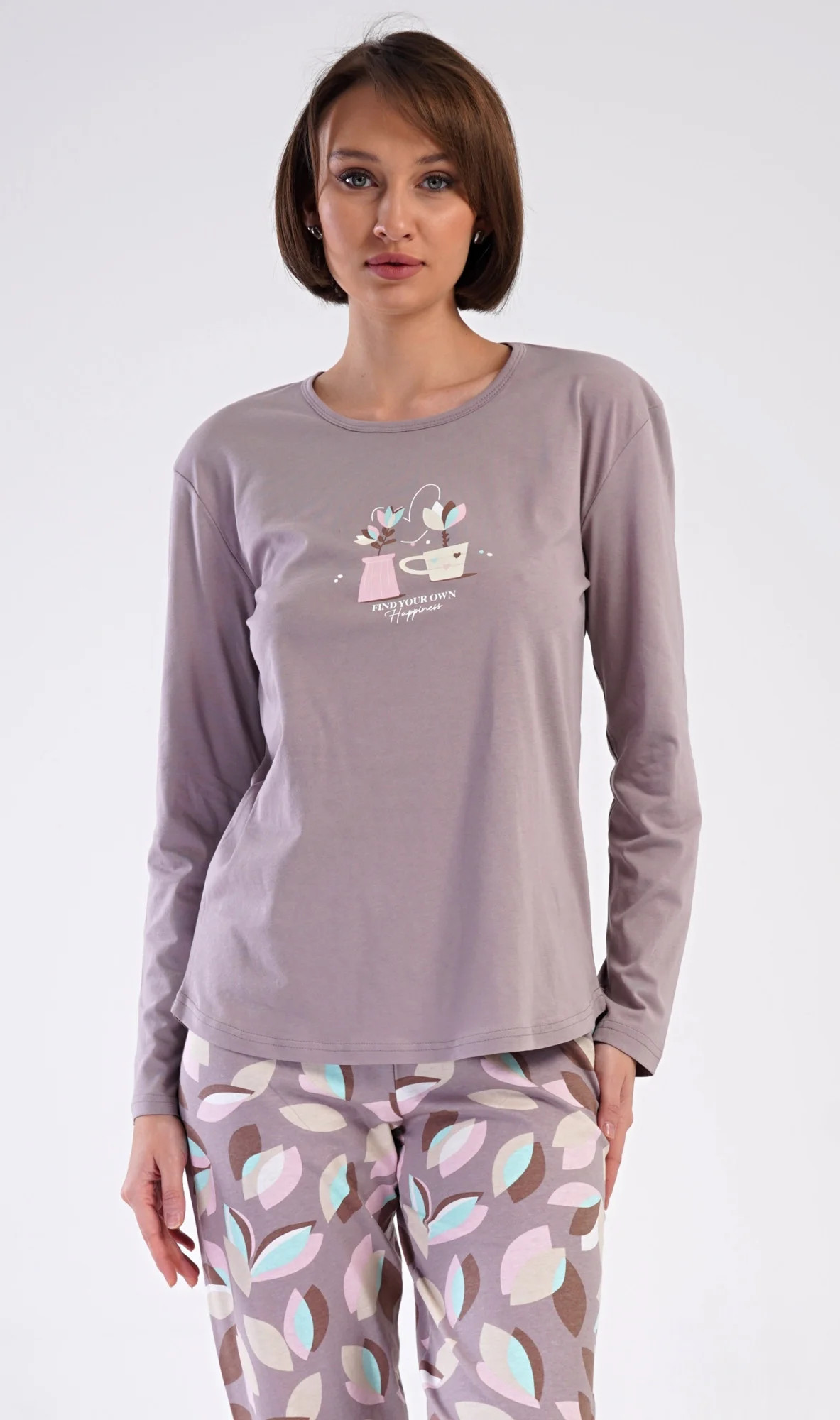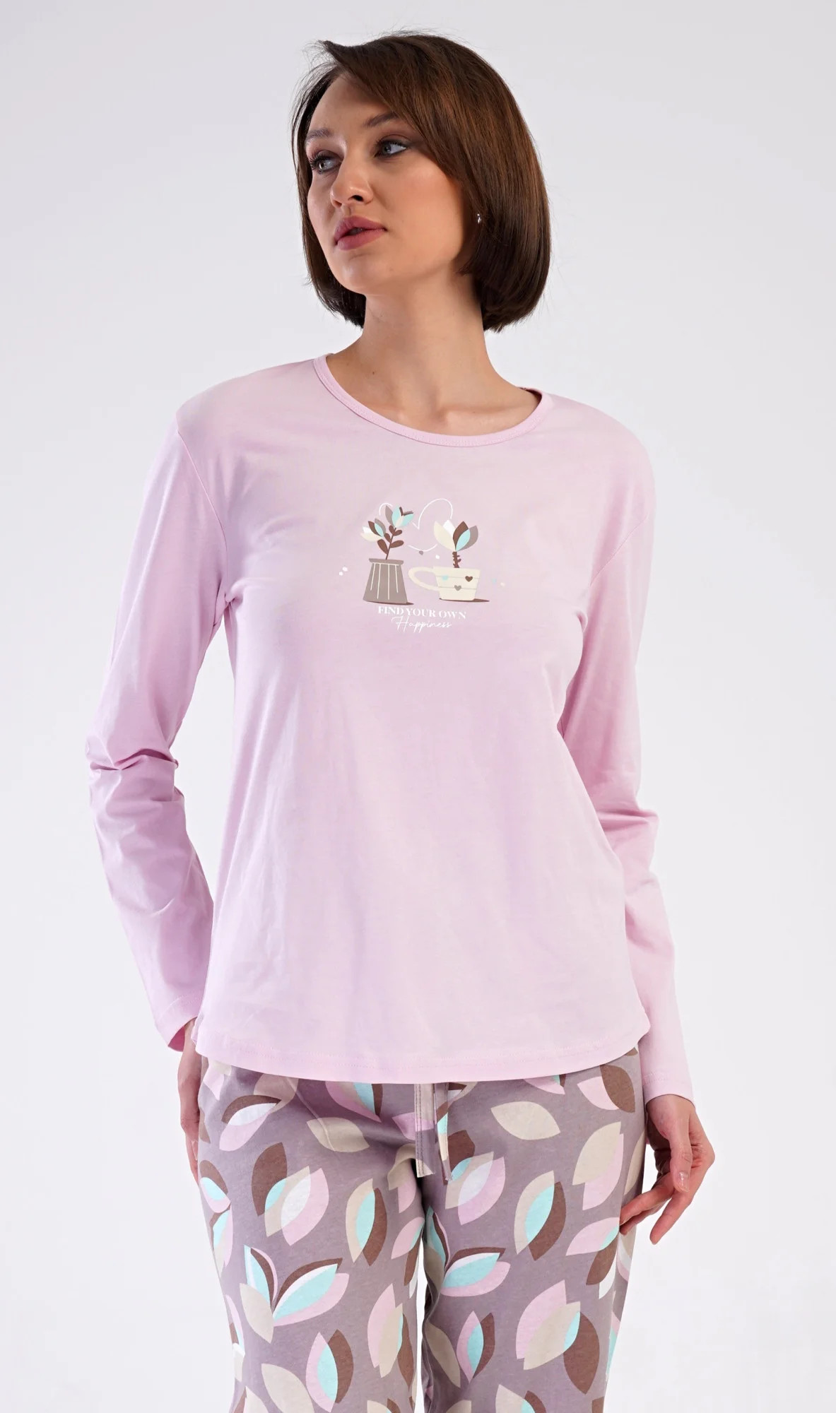 Dámské bavlněné dlouhé pyžamo Klárka. Dámské pyžamo se skládá z trika s dlouhým rukávem a dlouhých kalhot. Triko je jednobarevné, zdobené obrázkem květin v květináči. Květinový motiv se opakuje i na kalhotách, které mají v pase gumu a šňůrku na stažení, nemají kapsy. Použitý bavlněný materiál je poddajný a příjemný na dotek.