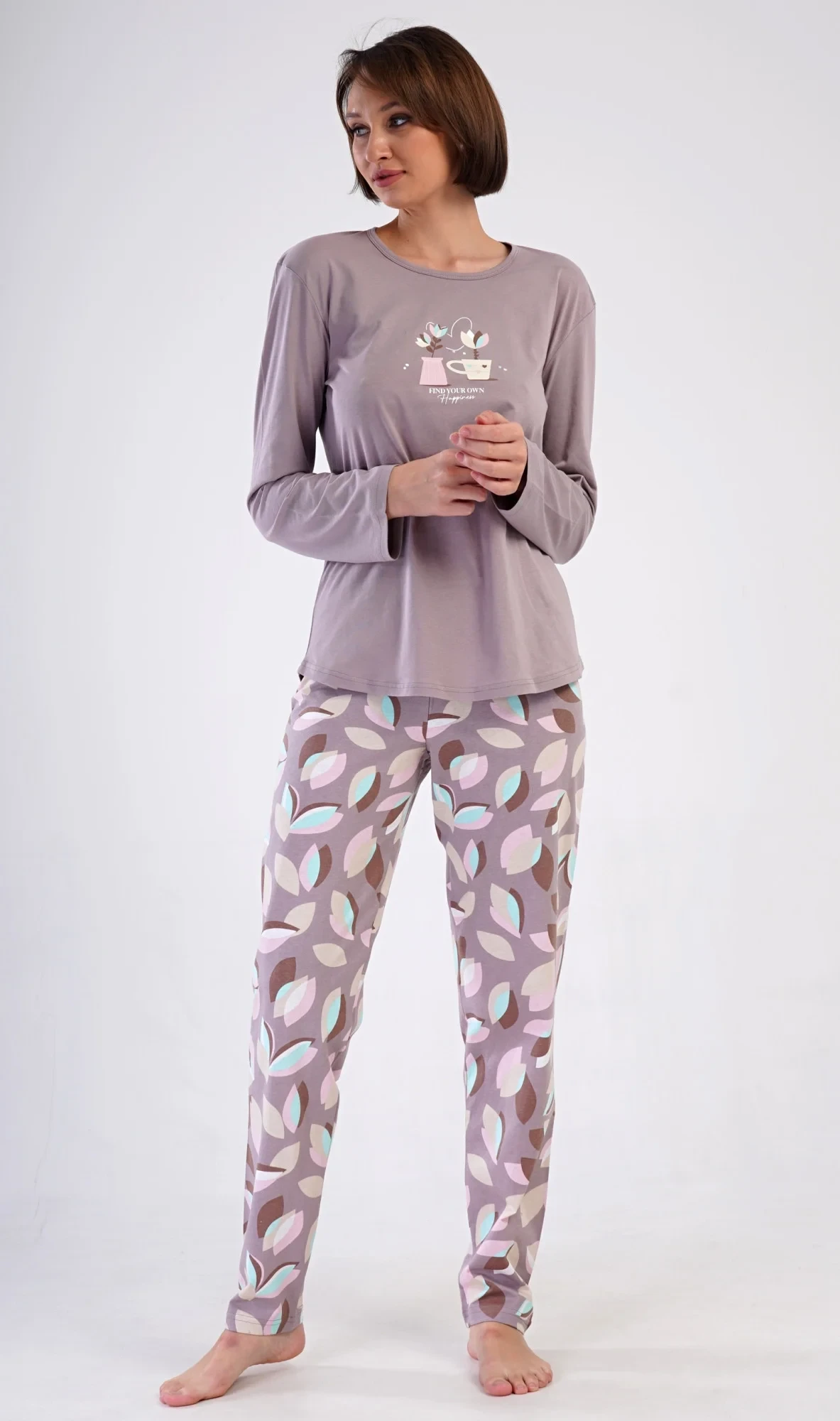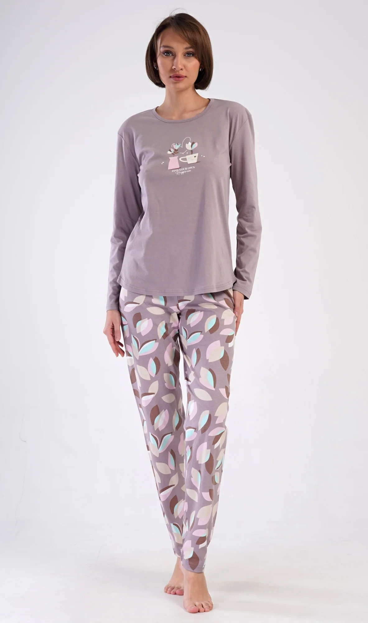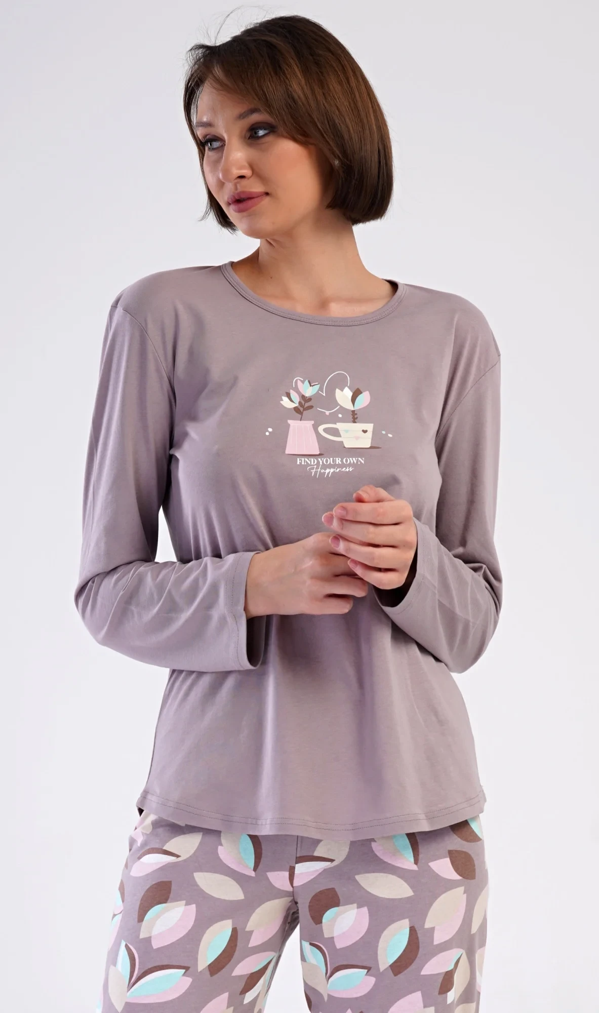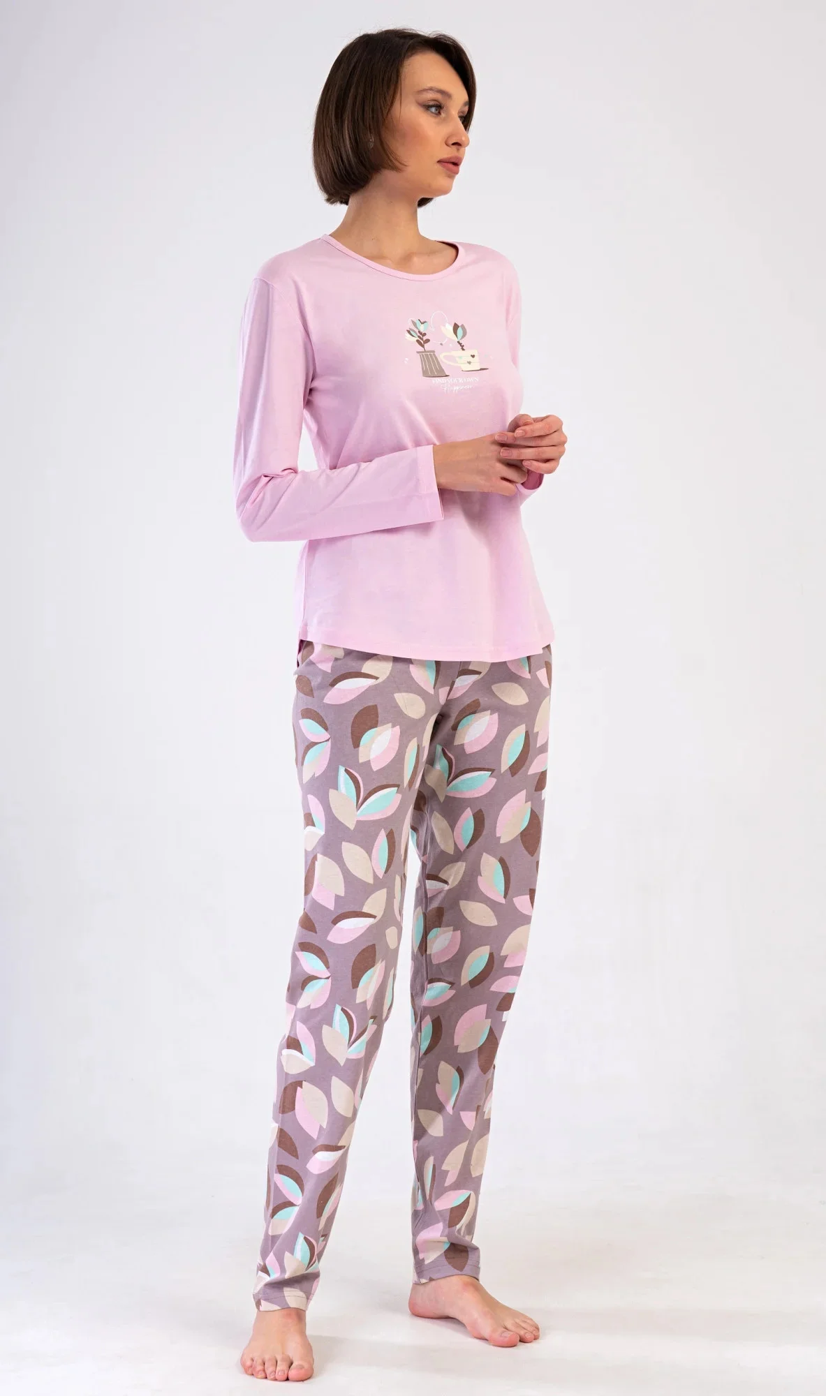 Dámské bavlněné dlouhé pyžamo Klárka. Dámské pyžamo se skládá z trika s dlouhým rukávem a dlouhých kalhot. Triko je jednobarevné, zdobené obrázkem květin v květináči. Květinový motiv se opakuje i na kalhotách, které mají v pase gumu a šňůrku na stažení, nemají kapsy. Použitý bavlněný materiál je poddajný a příjemný na dotek.