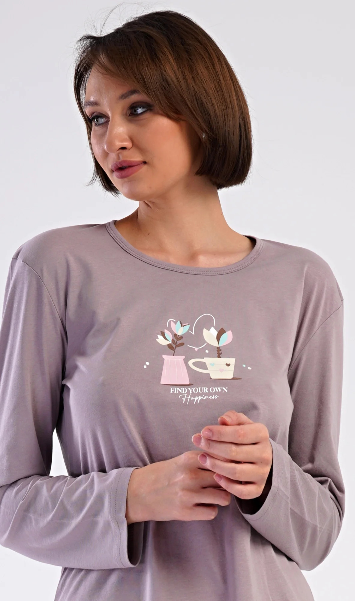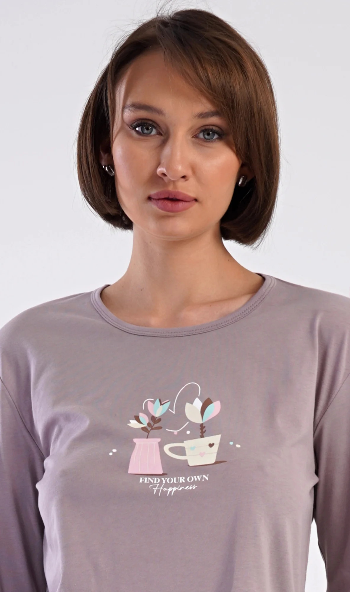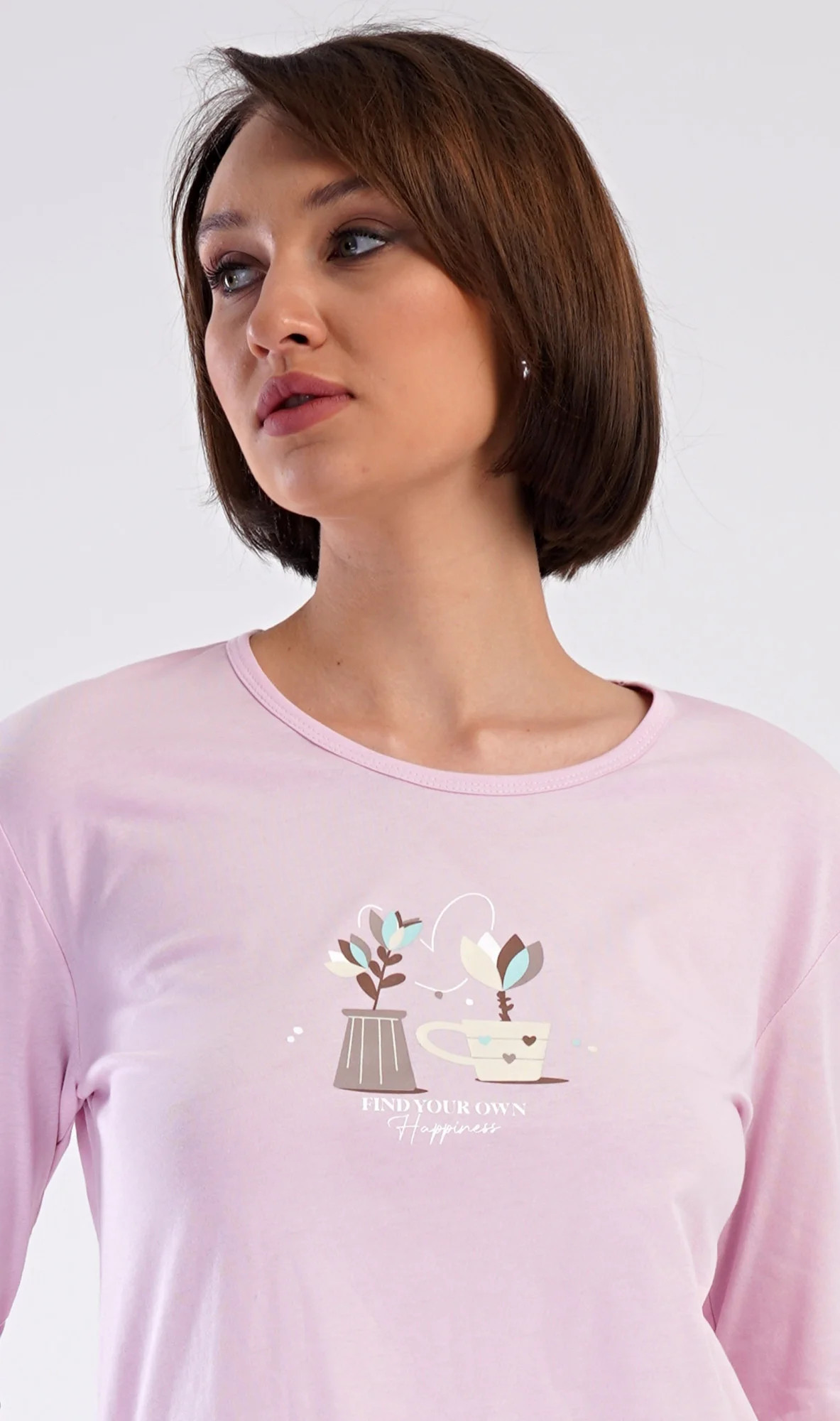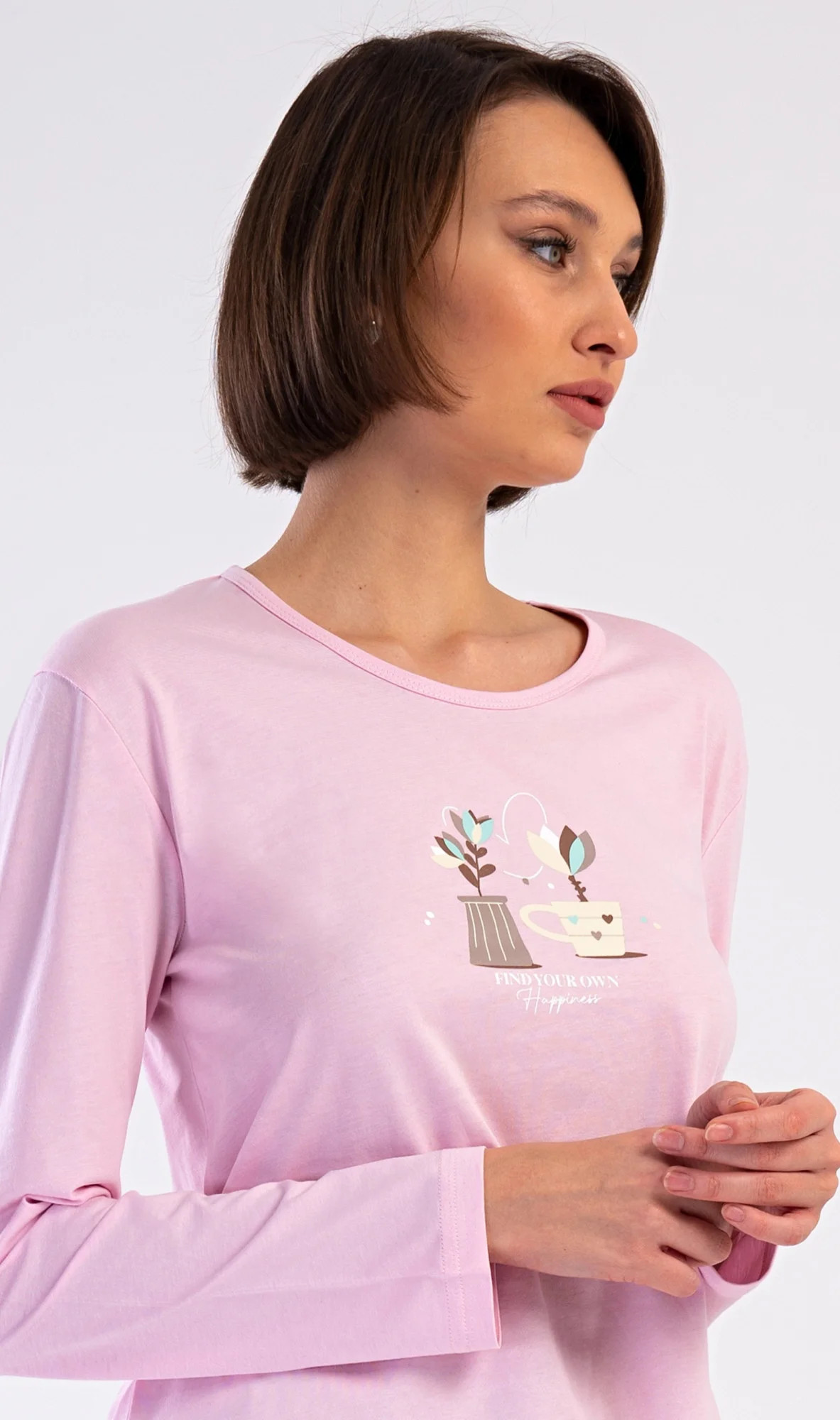 Dámské bavlněné dlouhé pyžamo Klárka. Dámské pyžamo se skládá z trika s dlouhým rukávem a dlouhých kalhot. Triko je jednobarevné, zdobené obrázkem květin v květináči. Květinový motiv se opakuje i na kalhotách, které mají v pase gumu a šňůrku na stažení, nemají kapsy. Použitý bavlněný materiál je poddajný a příjemný na dotek.