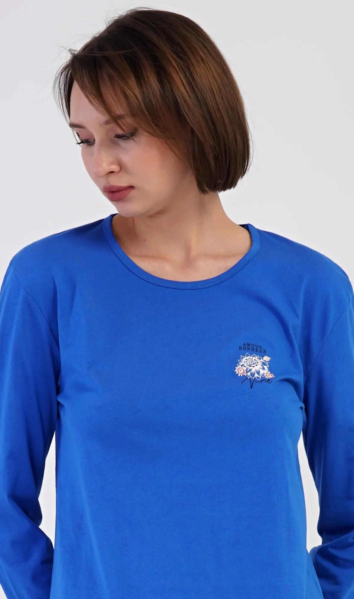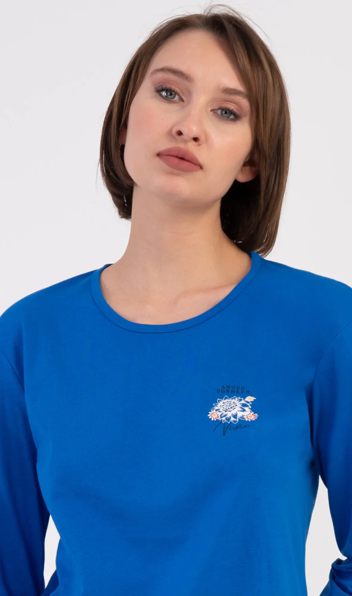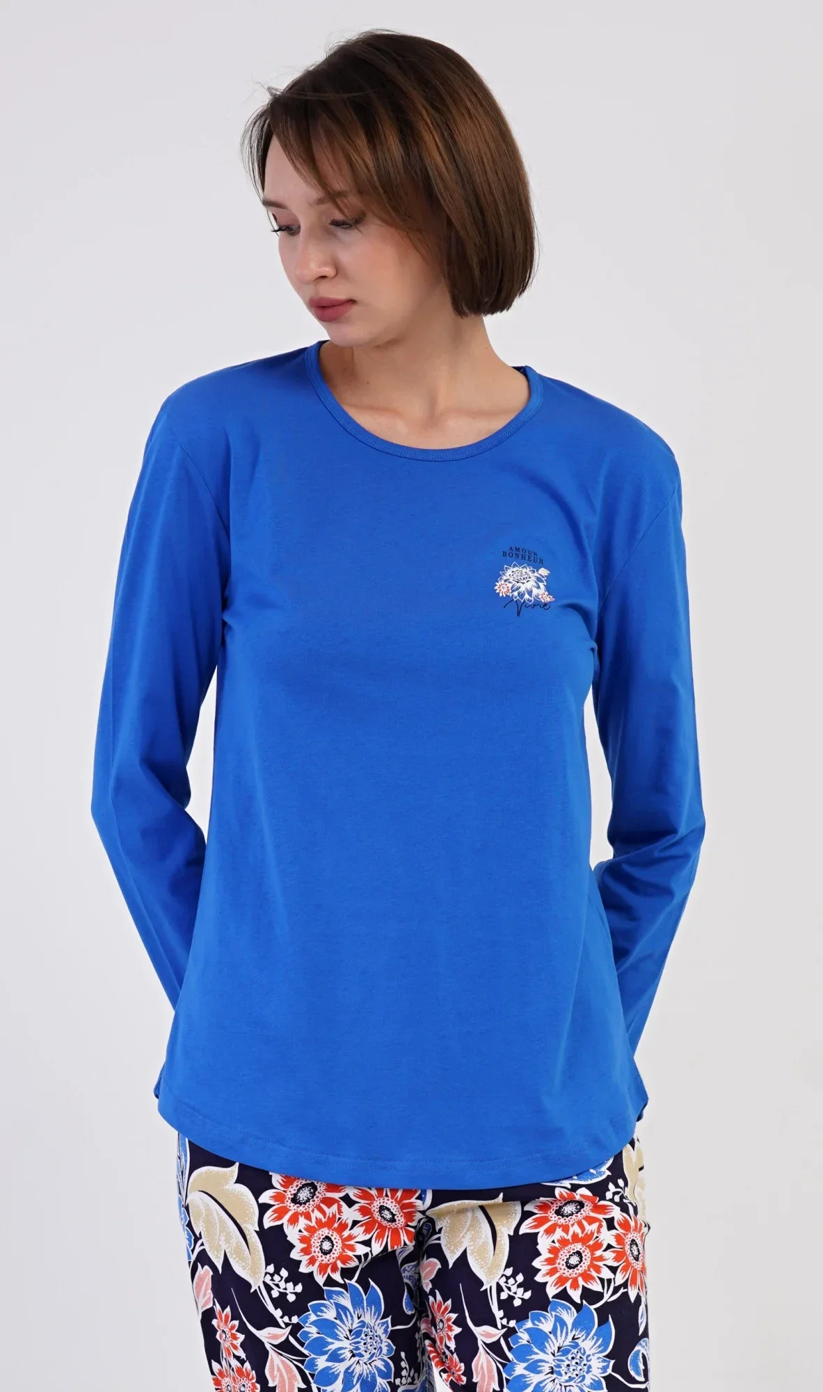Dámské bavlněné dlouhé pyžamo Květy. Dámské pyžamo se skládá z trika s dlouhým rukávem a dlouhých kalhot. Triko je jednobarevné, zdobené obrázkem drobných květů. Květinový motiv se opakuje i na kalhotách, které mají v pase gumu a šňůrku na stažení, nemají kapsy. Použitý bavlněný materiál je poddajný a příjemný na dotek.