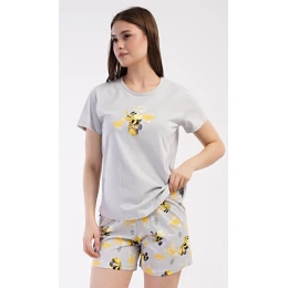 Dámské bavlněné šortkové pyžamo Včelky. Dámské pyžamo se skládá z trička s krátkým rukávem a šortkových kalhot. Jednobarevné tričko zdobí obrázek včelky. Stejný motiv se opakuje i na šortkách, které mají v pase gumu a šňůrku na stáhnutí, jsou bez kapes. Použitý bavlněný materiál je příjemný a poddajný na dotek.