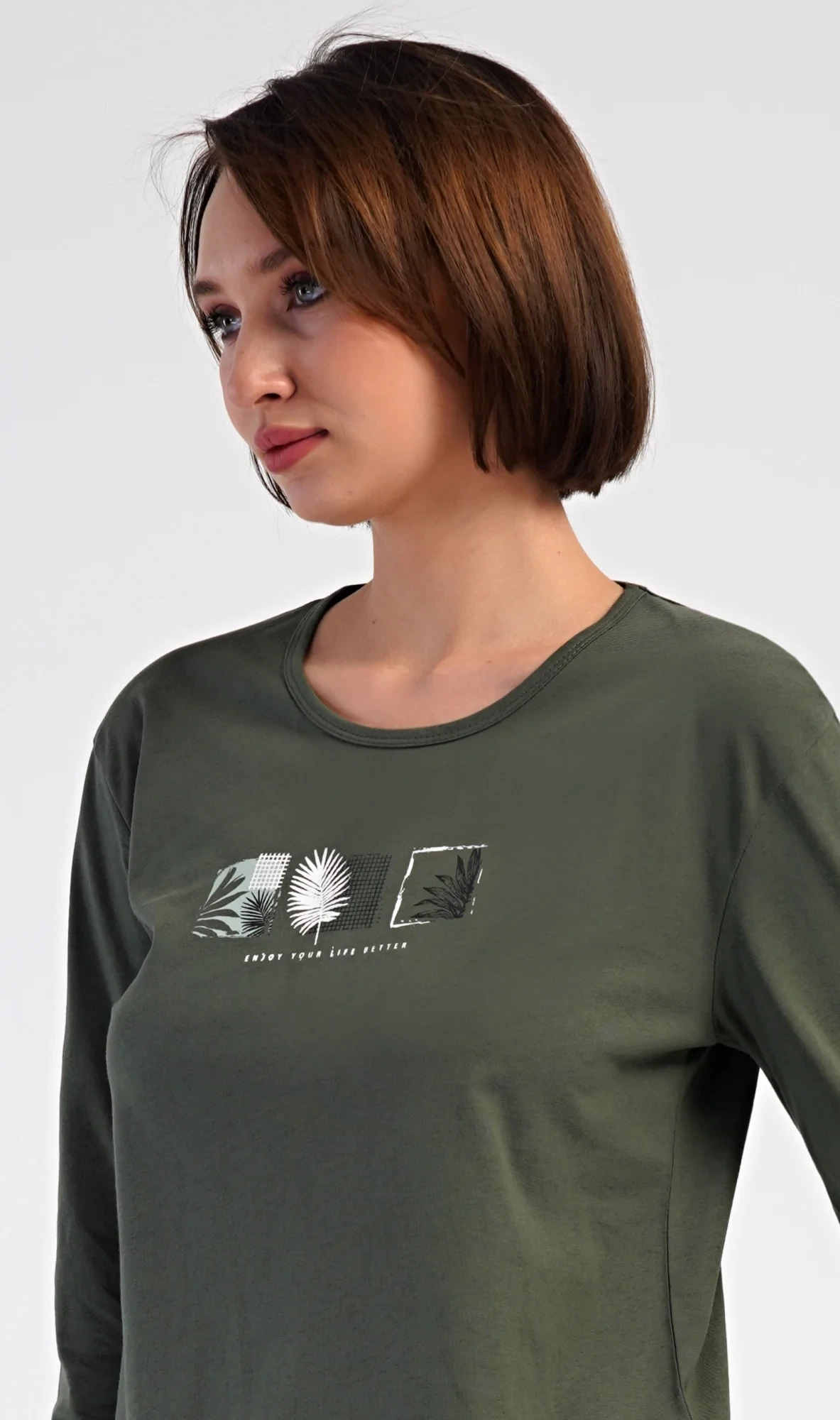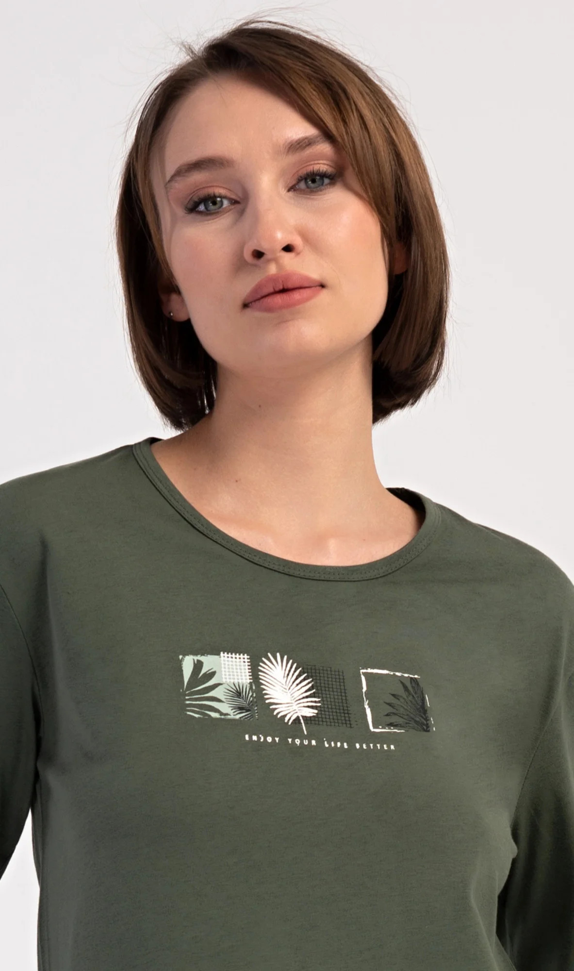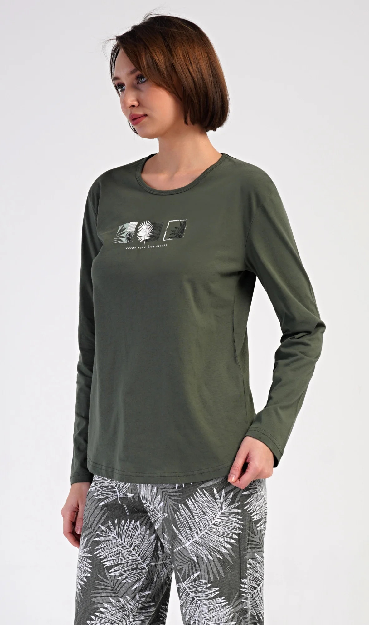 Dámské bavlněné dlouhé pyžamo Barbora. Dámské pyžamo se skládá z trika s dlouhým rukávem a dlouhých kalhot. Triko je jednobarevné, zdobené na hrudi obrázkem s motivem listů. Tento motiv se opakuje i na kalhotách, které mají v pase gumu a šňůrku na stažení, nemají kapsy. Použitý bavlněný materiál je poddajný a příjemný na dotek.