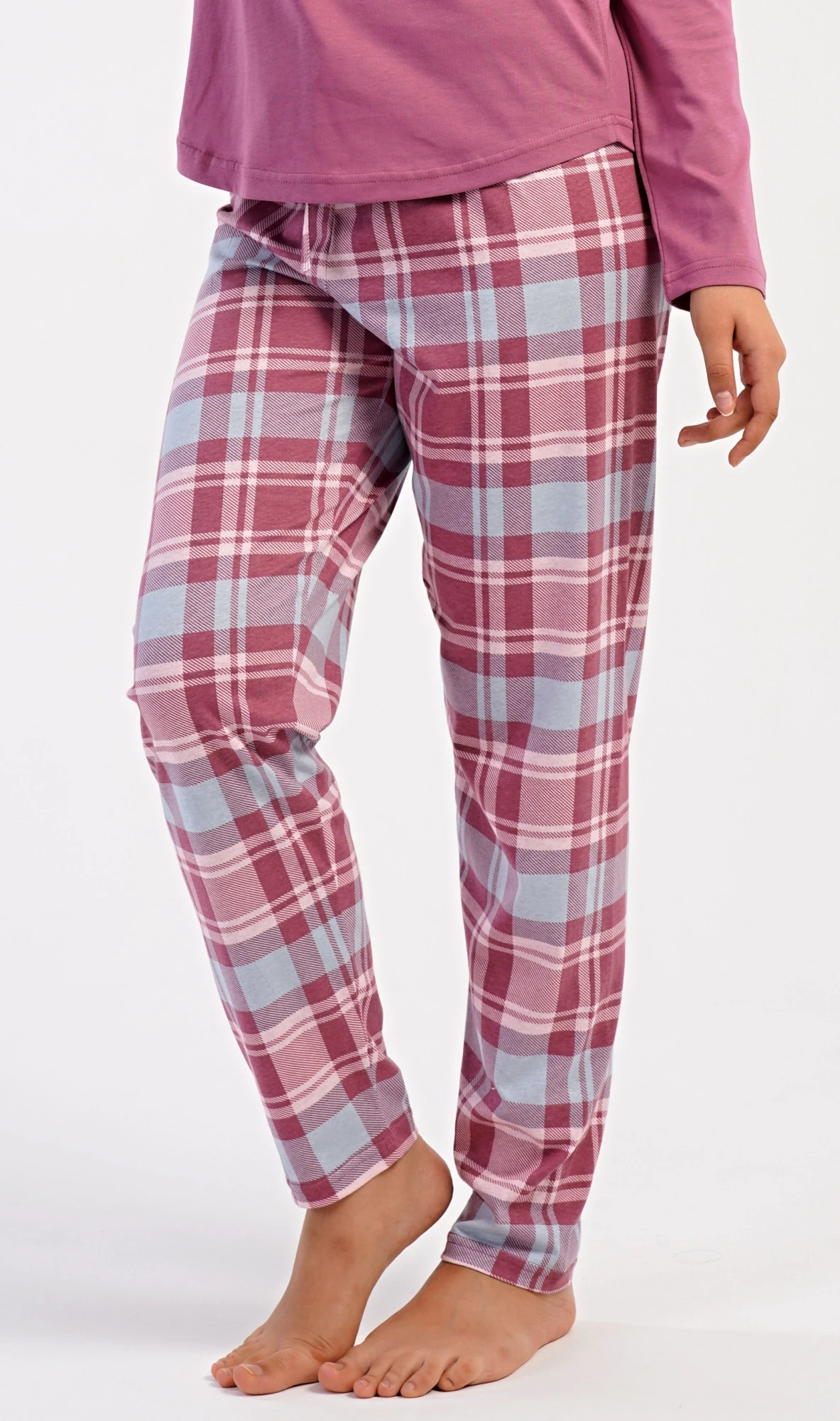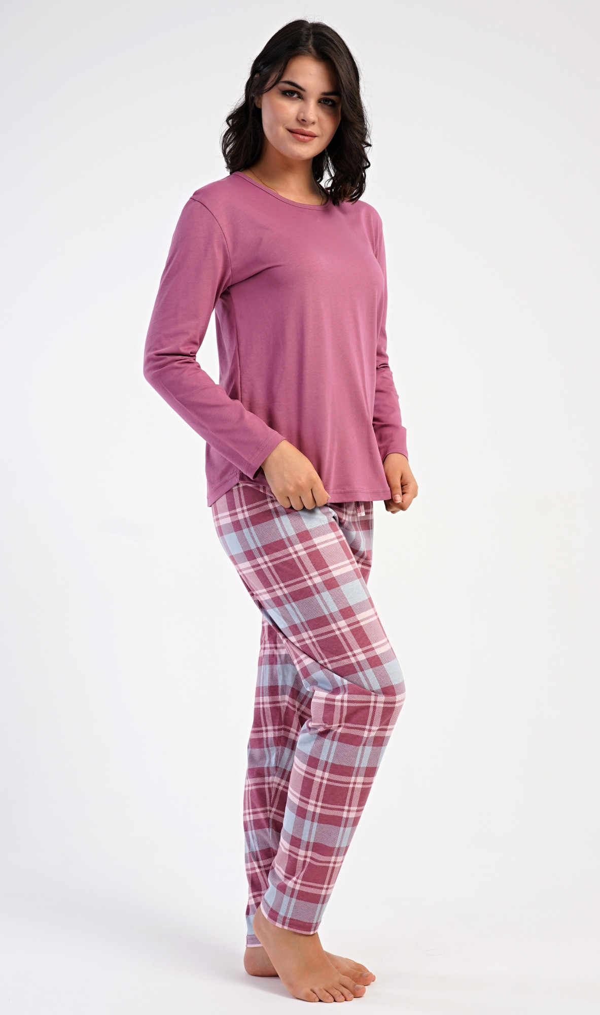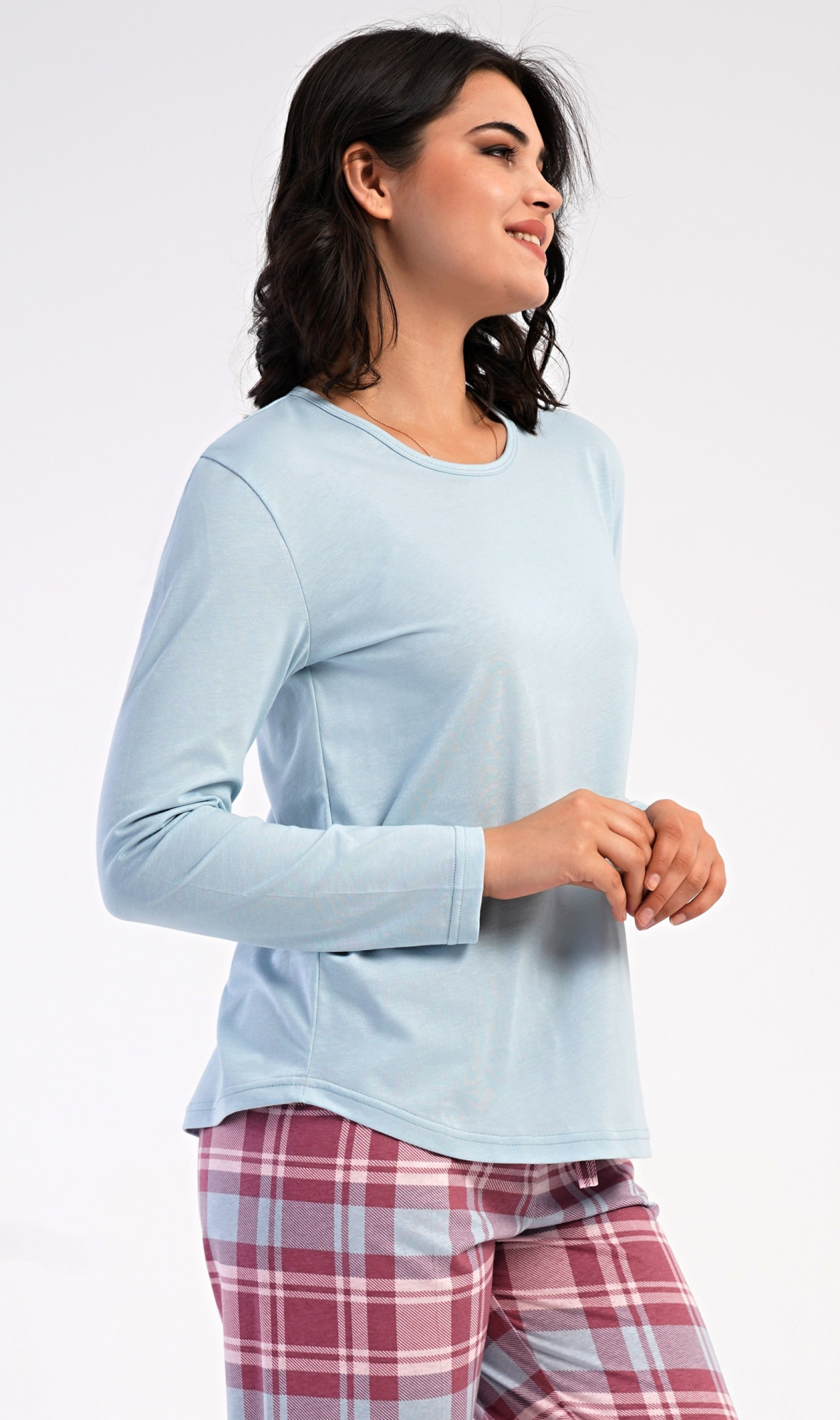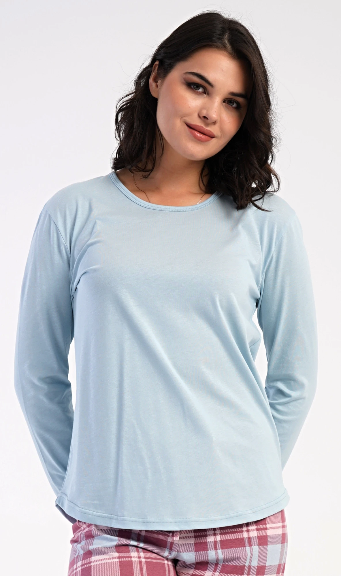 Dámské bavlněné dlouhé pyžamo Dominica. Dámské pyžamo se skládá z trika s dlouhým rukávem a dlouhých kalhot. Triko je jednobarevné, bez potisku, má kulatý výstřih. Kárované kalhoty mají v pase gumu a šňůrku na stažení, nemají kapsy. Použitý bavlněný materiál je poddajný a příjemný na dotek.