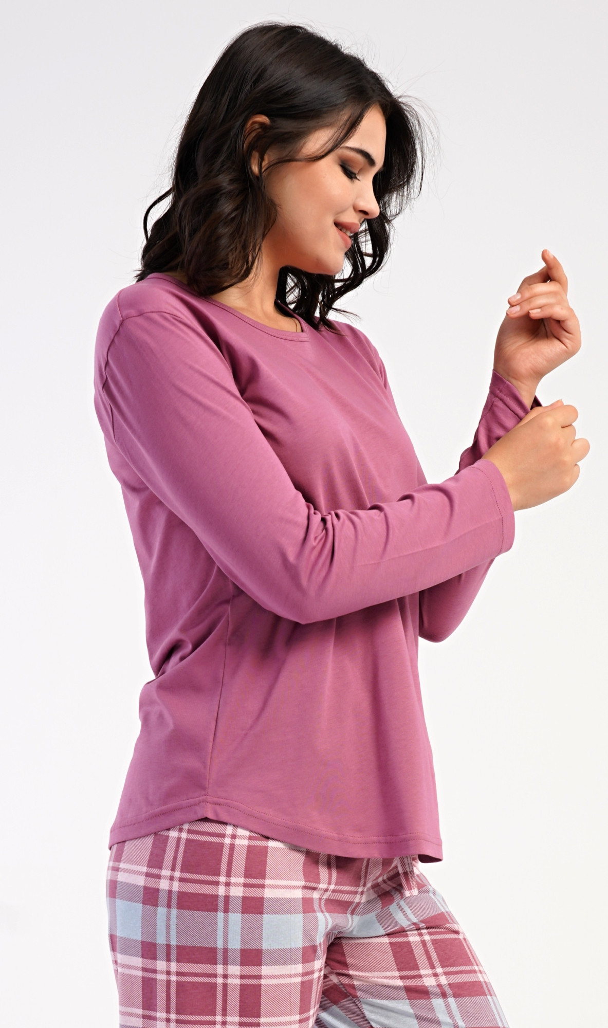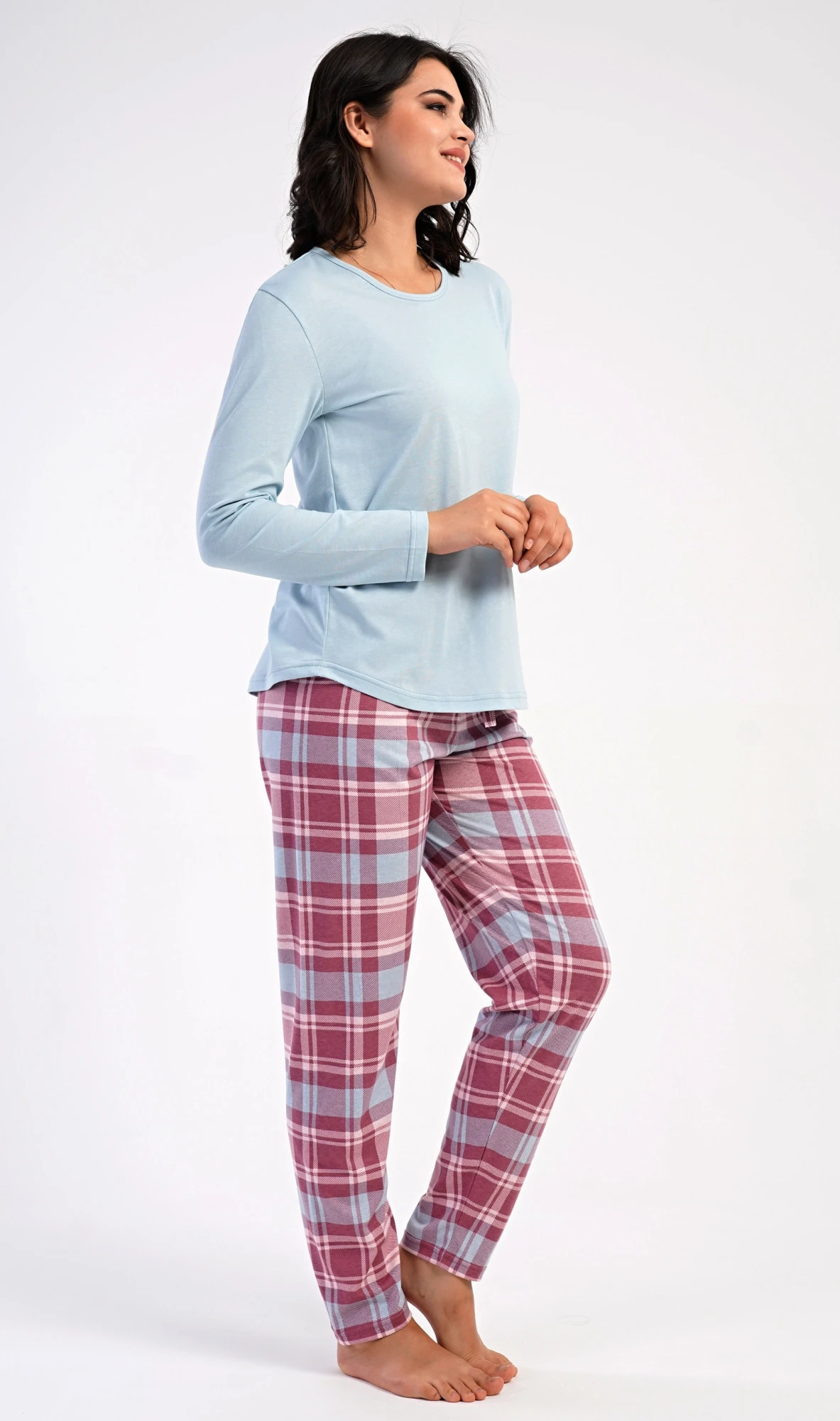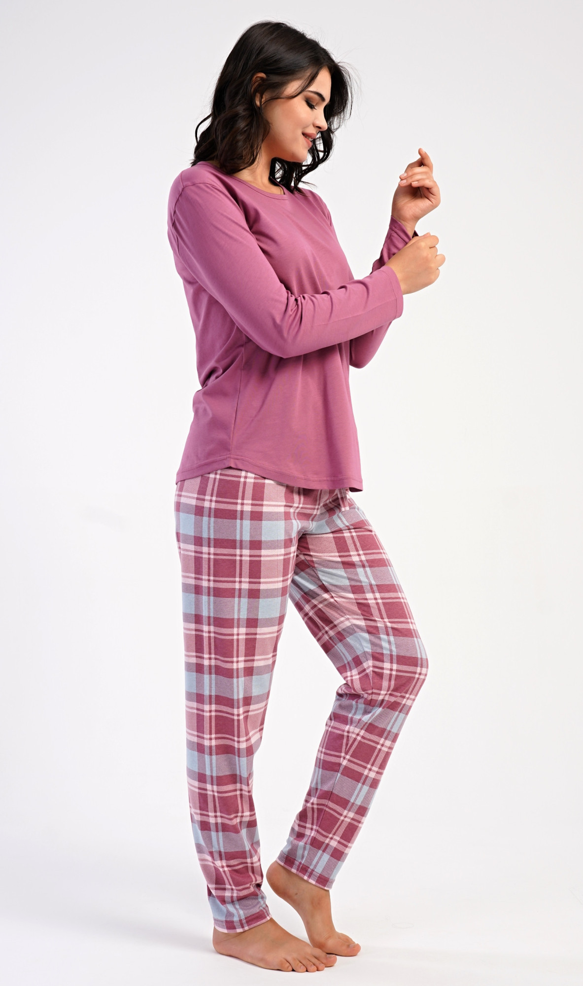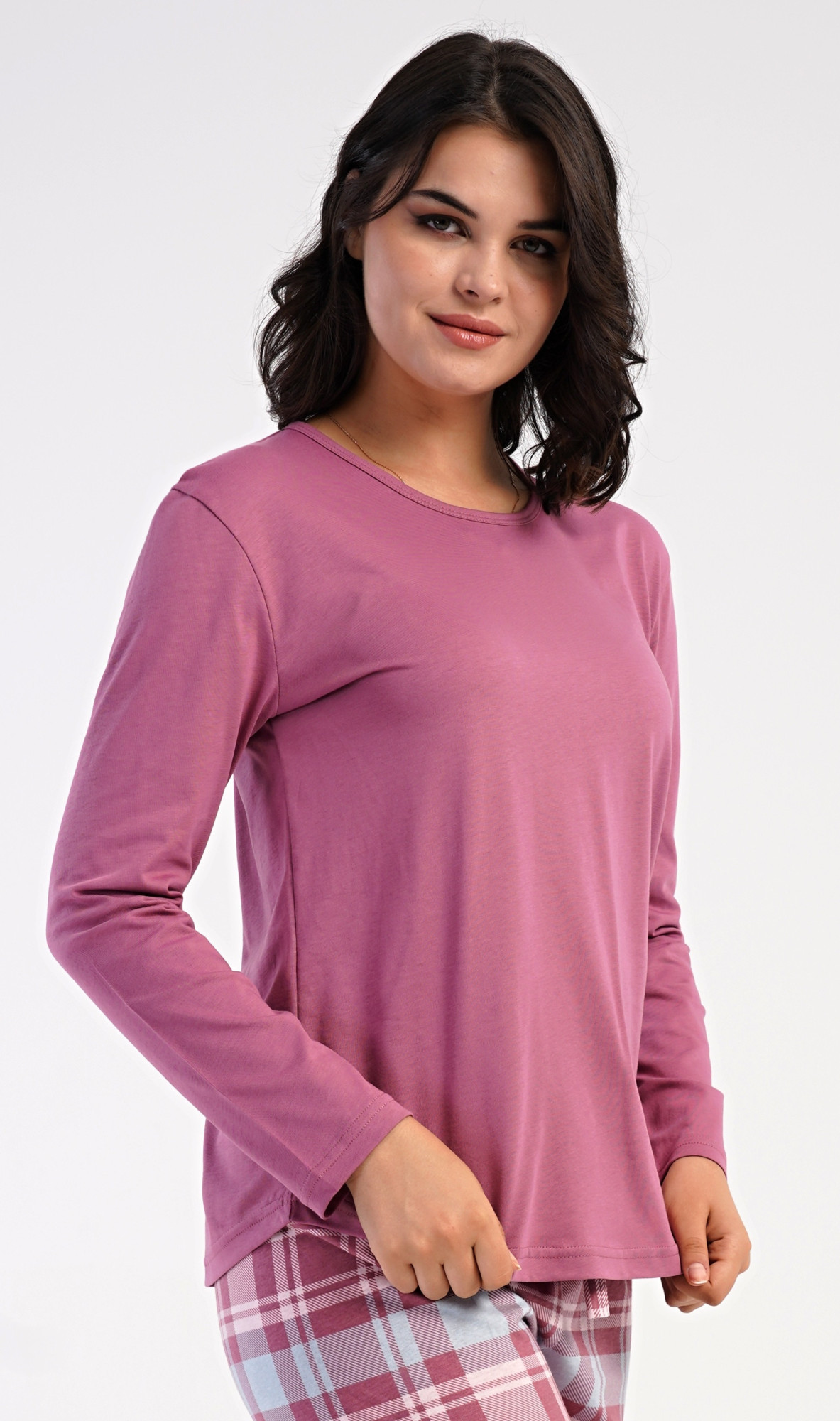 Dámské bavlněné dlouhé pyžamo Dominica. Dámské pyžamo se skládá z trika s dlouhým rukávem a dlouhých kalhot. Triko je jednobarevné, bez potisku, má kulatý výstřih. Kárované kalhoty mají v pase gumu a šňůrku na stažení, nemají kapsy. Použitý bavlněný materiál je poddajný a příjemný na dotek.