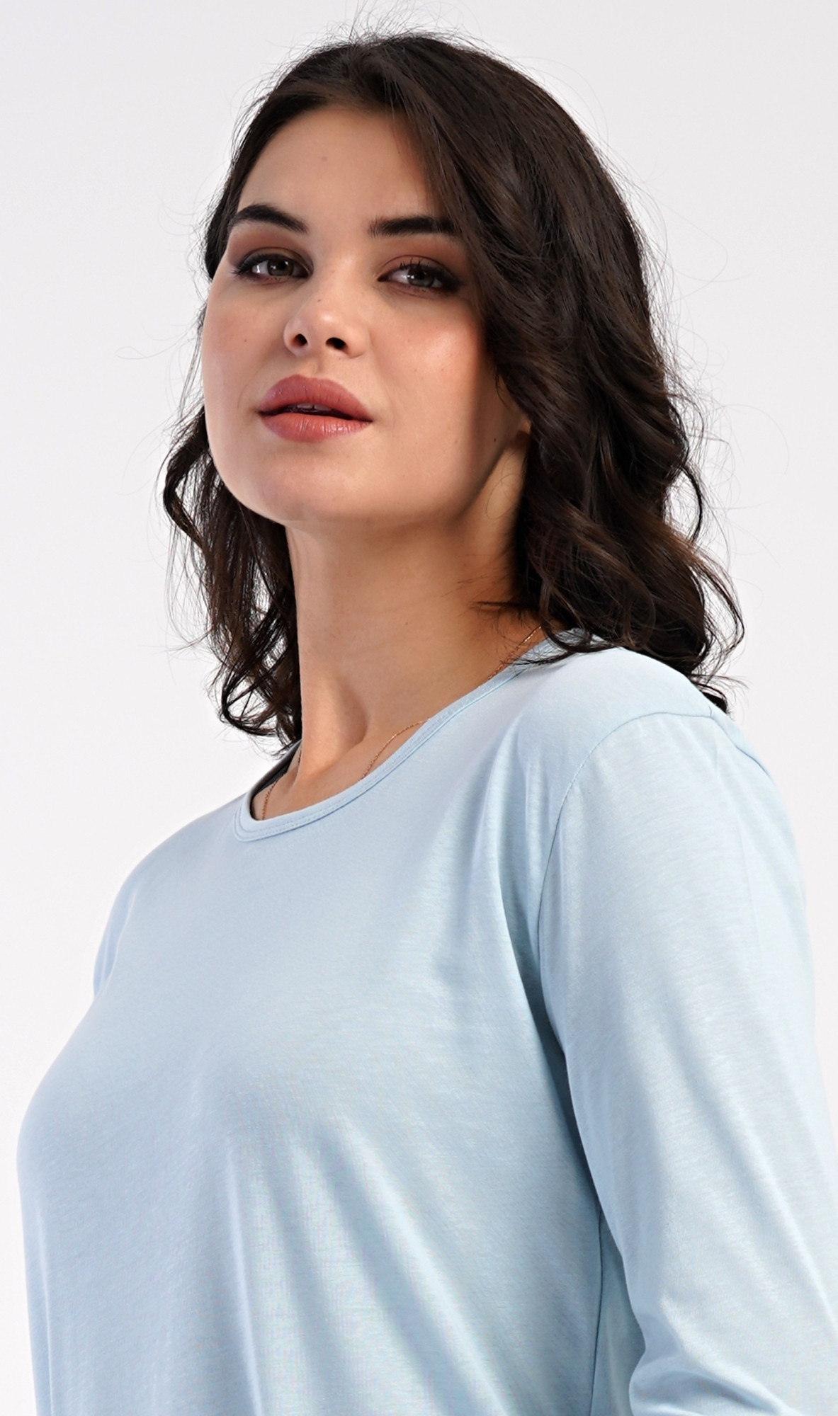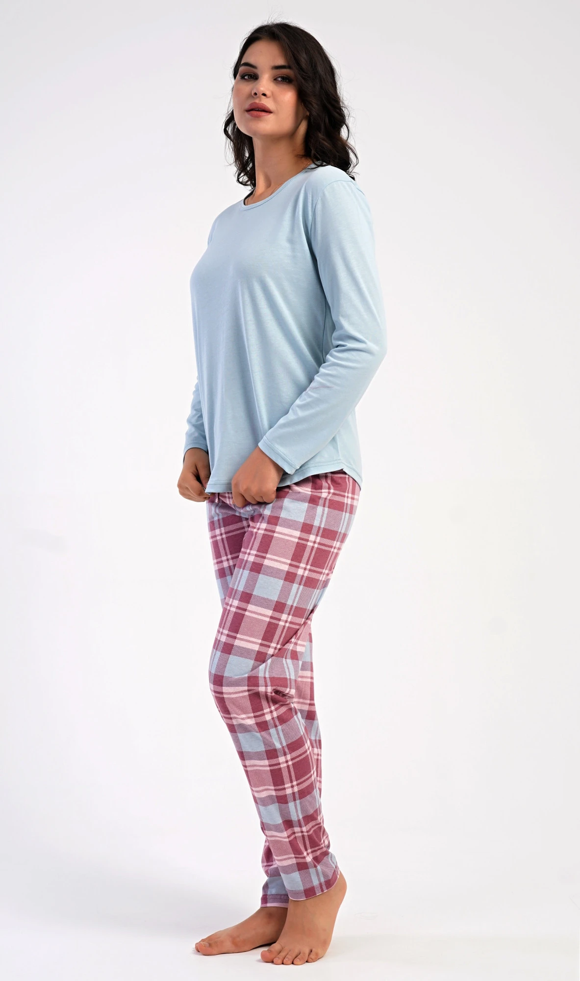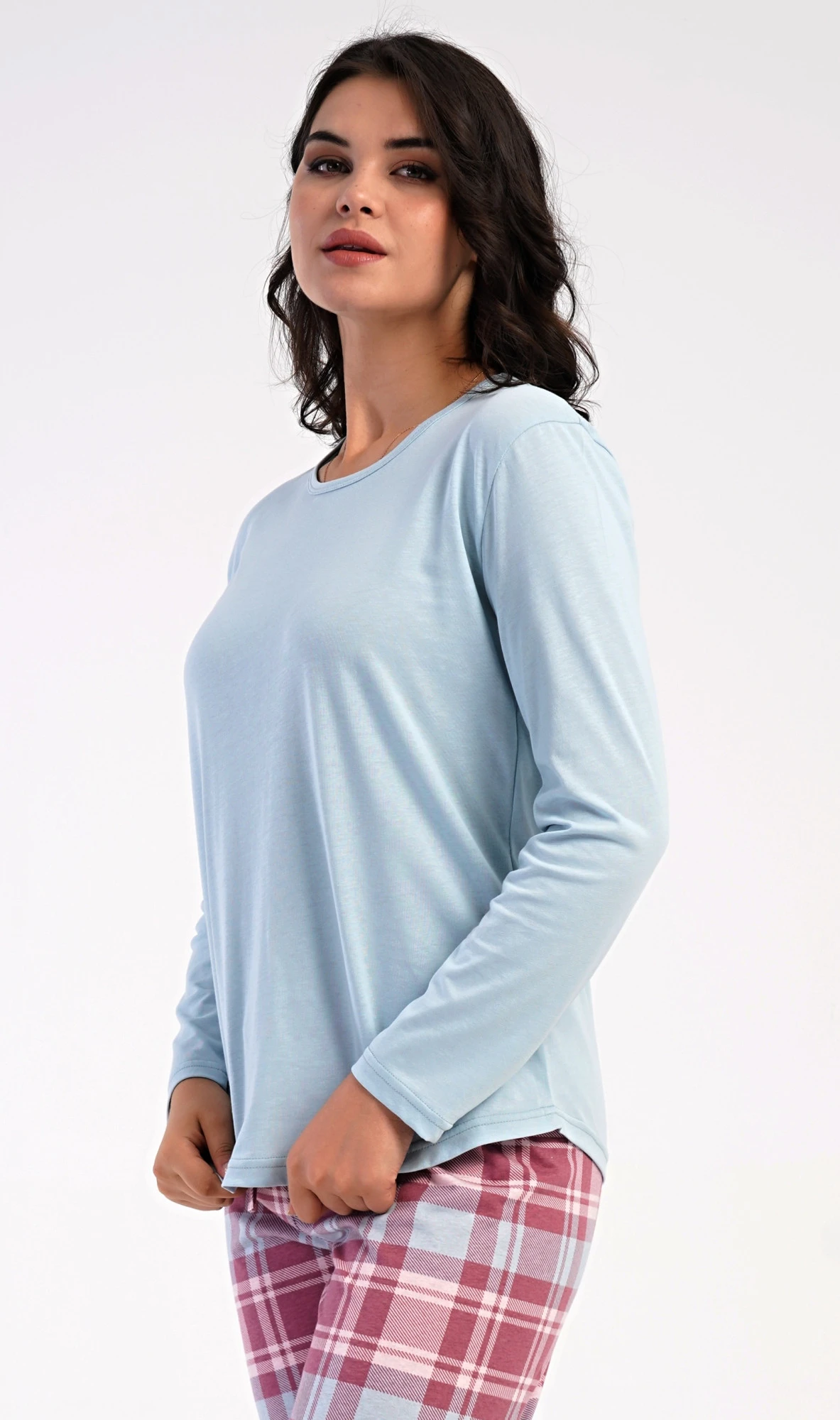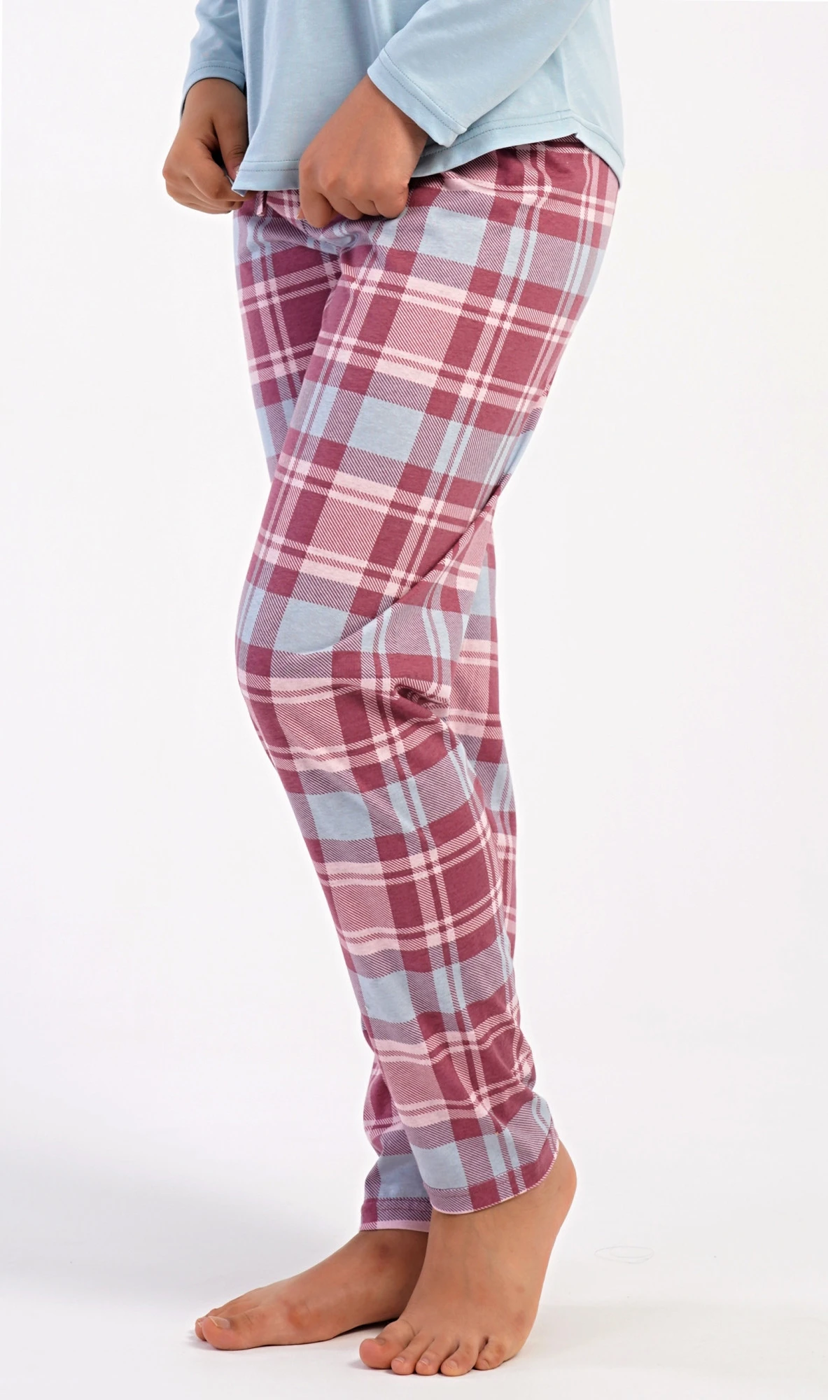 Dámské bavlněné dlouhé pyžamo Dominica. Dámské pyžamo se skládá z trika s dlouhým rukávem a dlouhých kalhot. Triko je jednobarevné, bez potisku, má kulatý výstřih. Kárované kalhoty mají v pase gumu a šňůrku na stažení, nemají kapsy. Použitý bavlněný materiál je poddajný a příjemný na dotek.