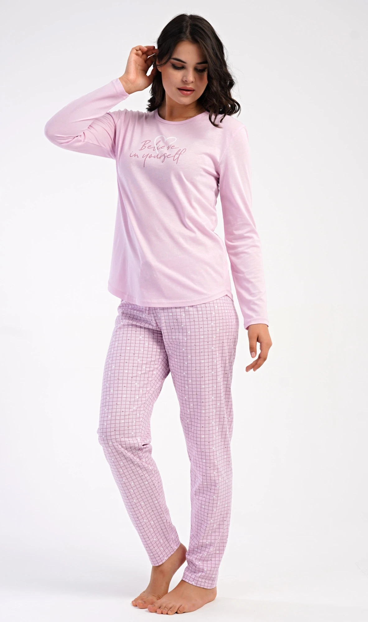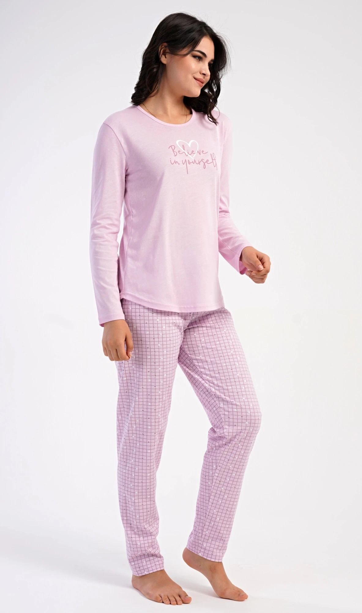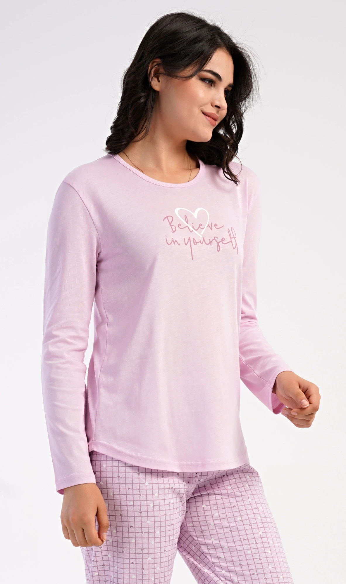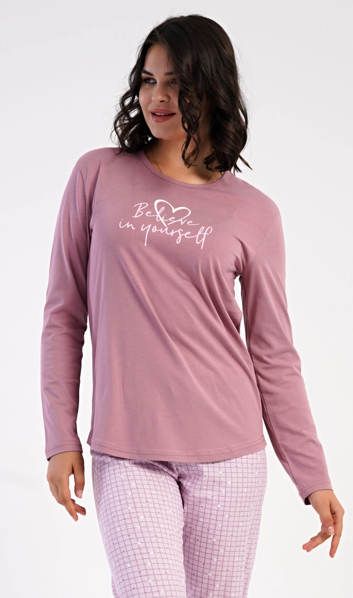 Dámské bavlněné dlouhé pyžamo Believe. Dámské pyžamo se skládá z trika s dlouhým rukávem a dlouhých kalhot. Jednobarevné triko je ozdobeno motivačním nápisem. Kalhoty potištěné srdíčky mají v pase gumu a šňůrku na stažení, nemají kapsy. Použitý bavlněný materiál je poddajný a příjemný na dotek.