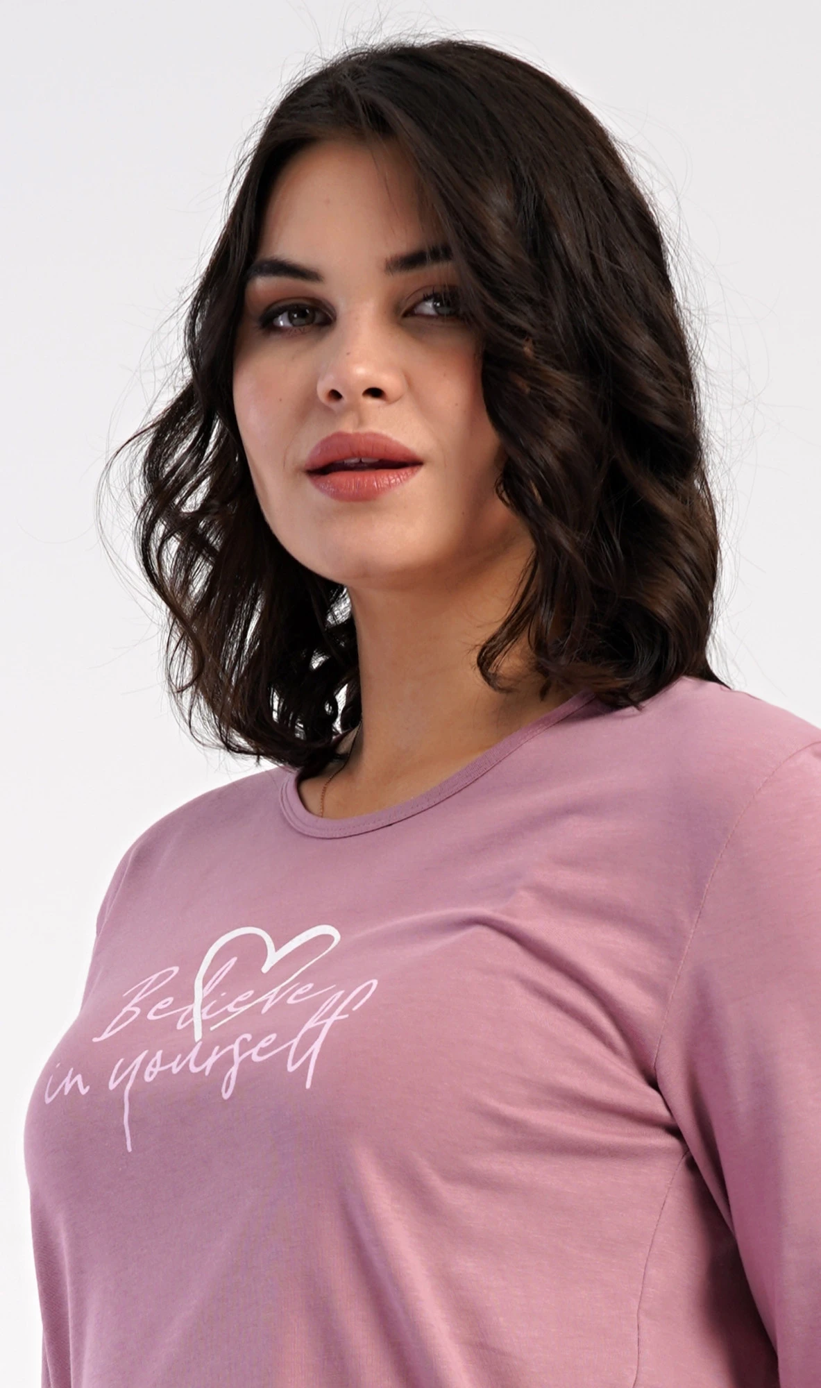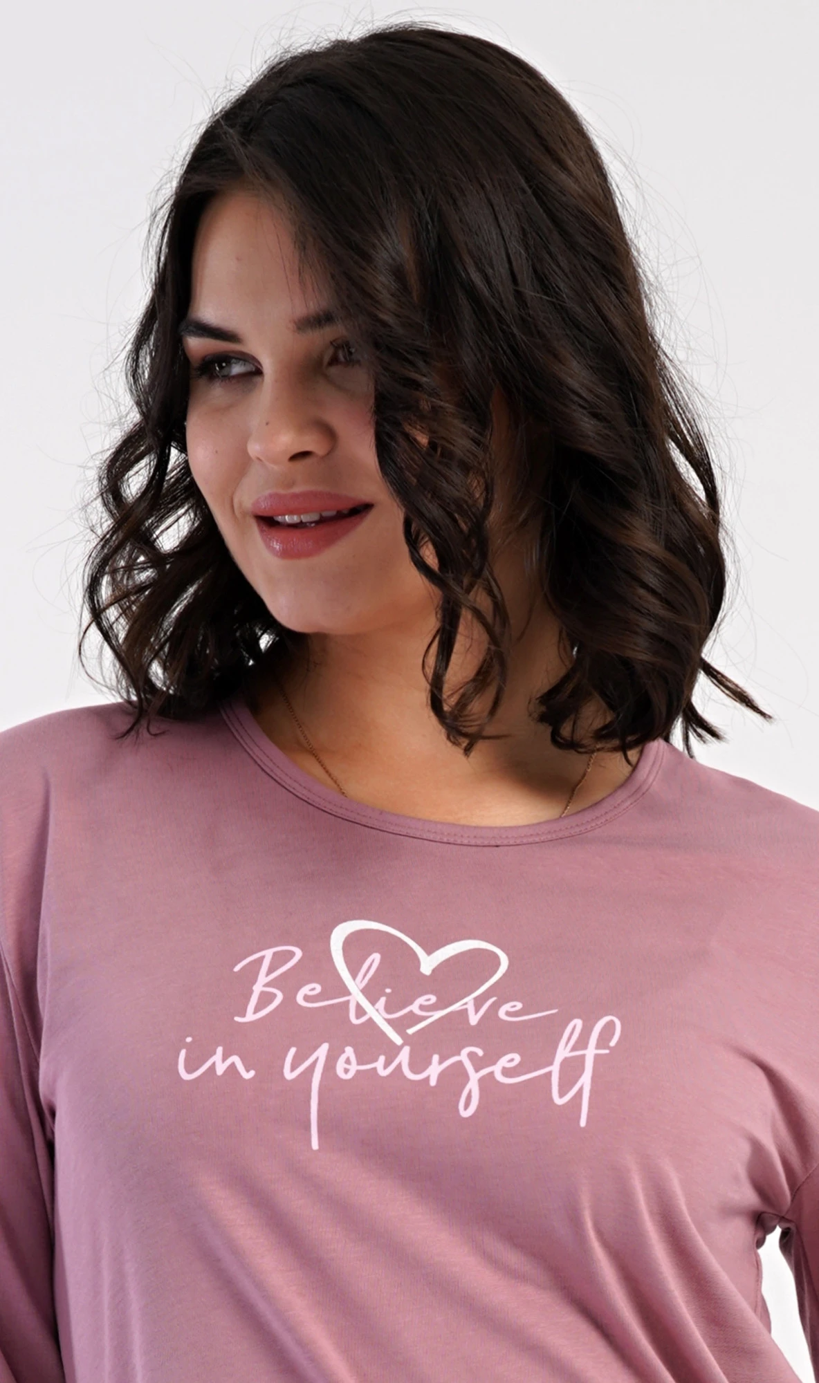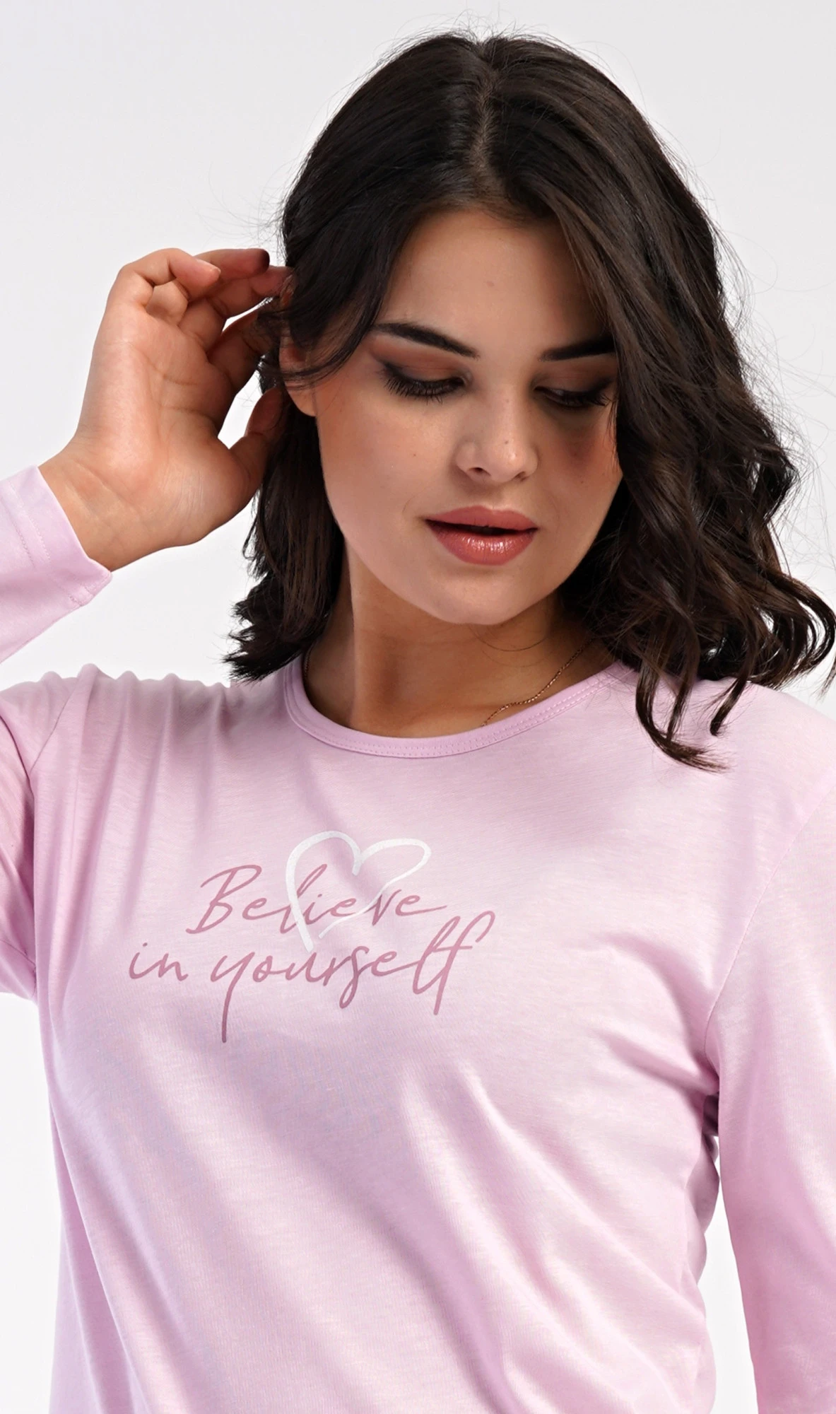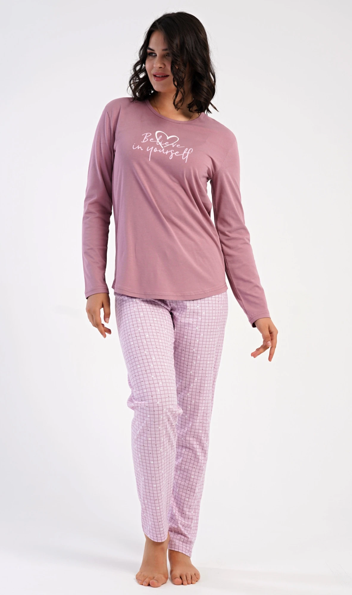 Dámské bavlněné dlouhé pyžamo Believe. Dámské pyžamo se skládá z trika s dlouhým rukávem a dlouhých kalhot. Jednobarevné triko je ozdobeno motivačním nápisem. Kalhoty potištěné srdíčky mají v pase gumu a šňůrku na stažení, nemají kapsy. Použitý bavlněný materiál je poddajný a příjemný na dotek.