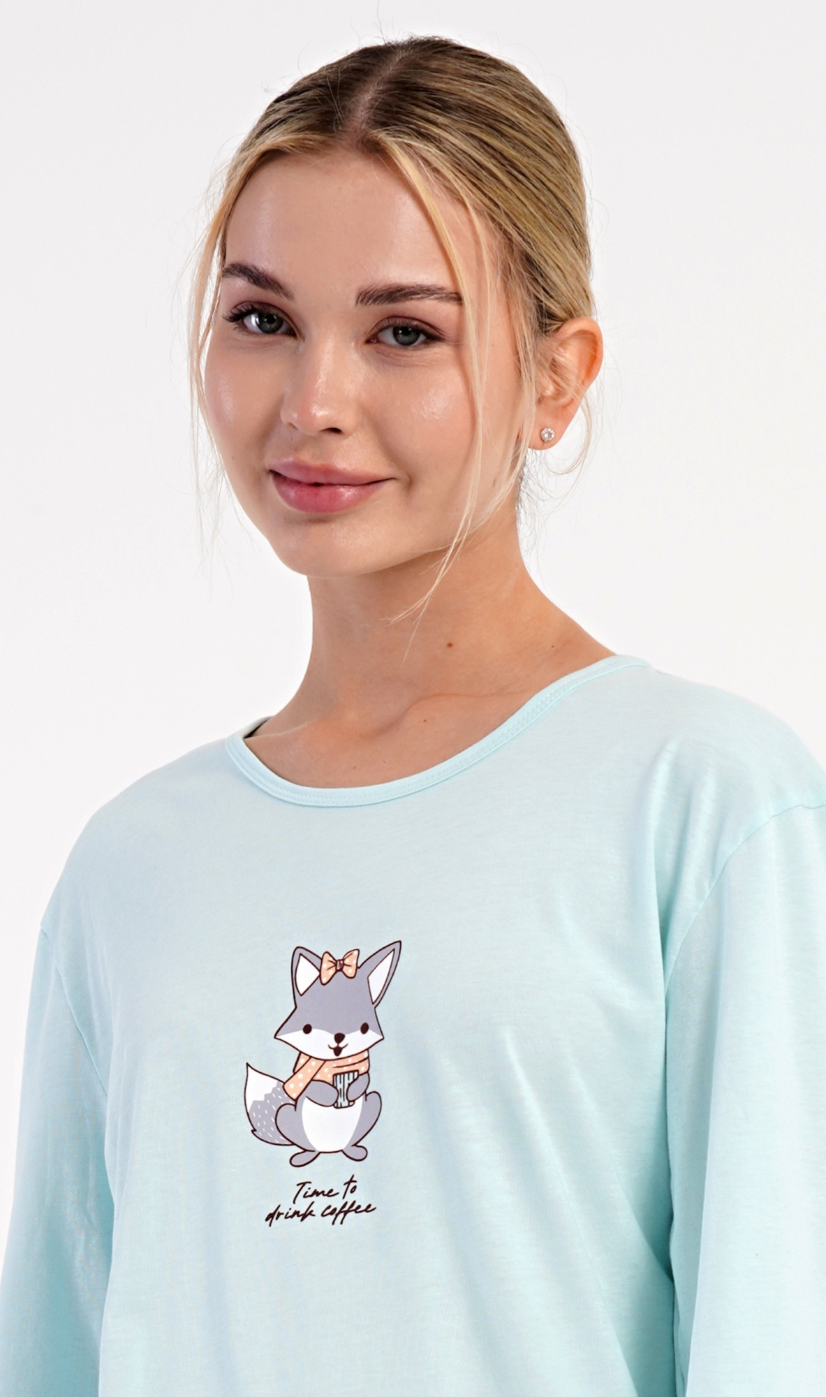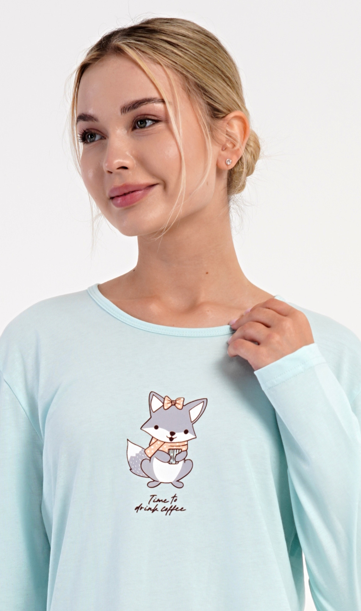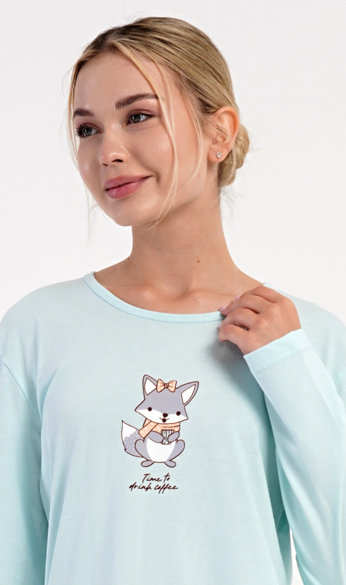 Dámské bavlněné dlouhé pyžamo Jezevec. Dámské pyžamo se skládá z trika s dlouhým rukávem a dlouhých kalhot. Triko s kulatým výstřihem je na hrudi zdobeno obrázkem malého jezevce. Tento motiv se opakuje i na kalhotách, které mají v pase gumu a šňůrku na stažení, nemají kapsy. Použitý bavlněný materiál je poddajný a příjemný na dotek.