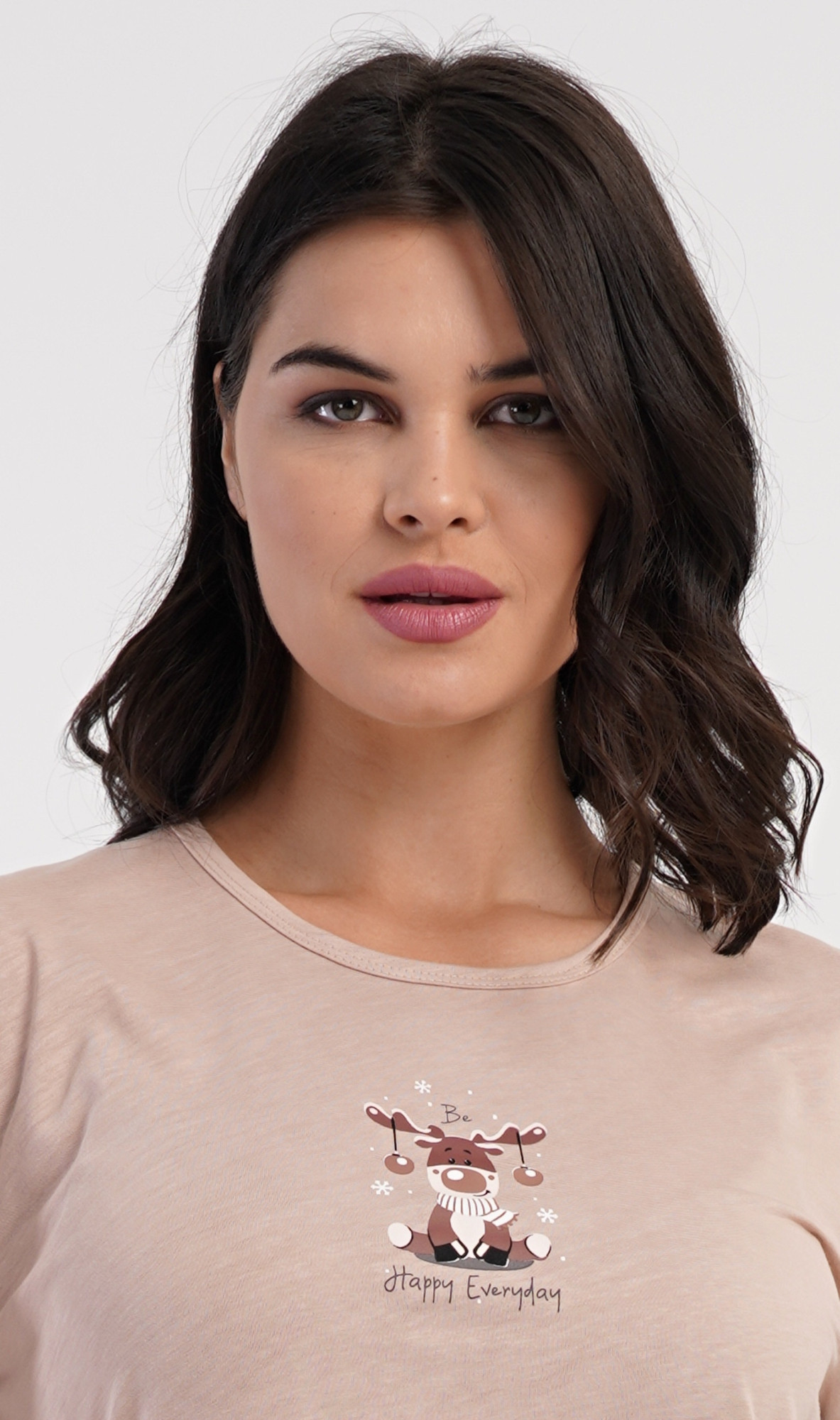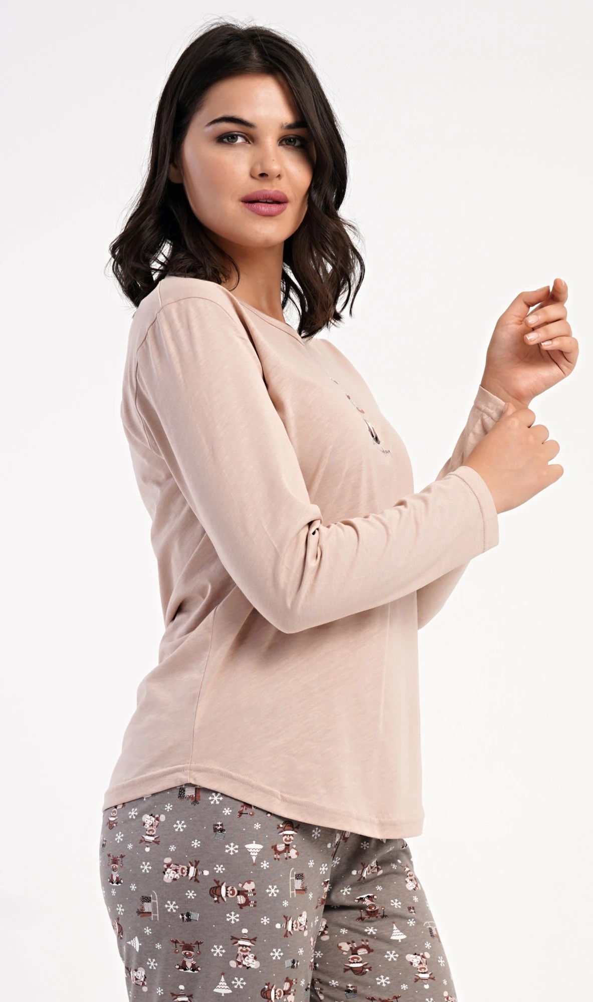 Dámské bavlněné dlouhé pyžamo Sobík. Dámské pyžamo se skládá z trika s dlouhým rukávem a dlouhých kalhot. Triko s kulatým výstřihem je na hrudi zdobeno obrázkem malého vánočního soba. Tento motiv se opakuje i na kalhotách, které mají v pase gumu a šňůrku na stažení, nemají kapsy. Použitý bavlněný materiál je poddajný a příjemný na dotek.