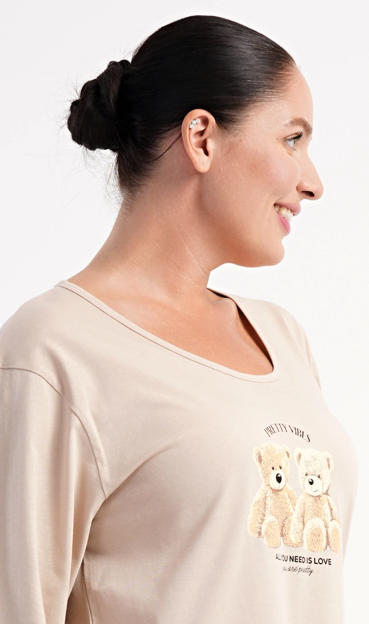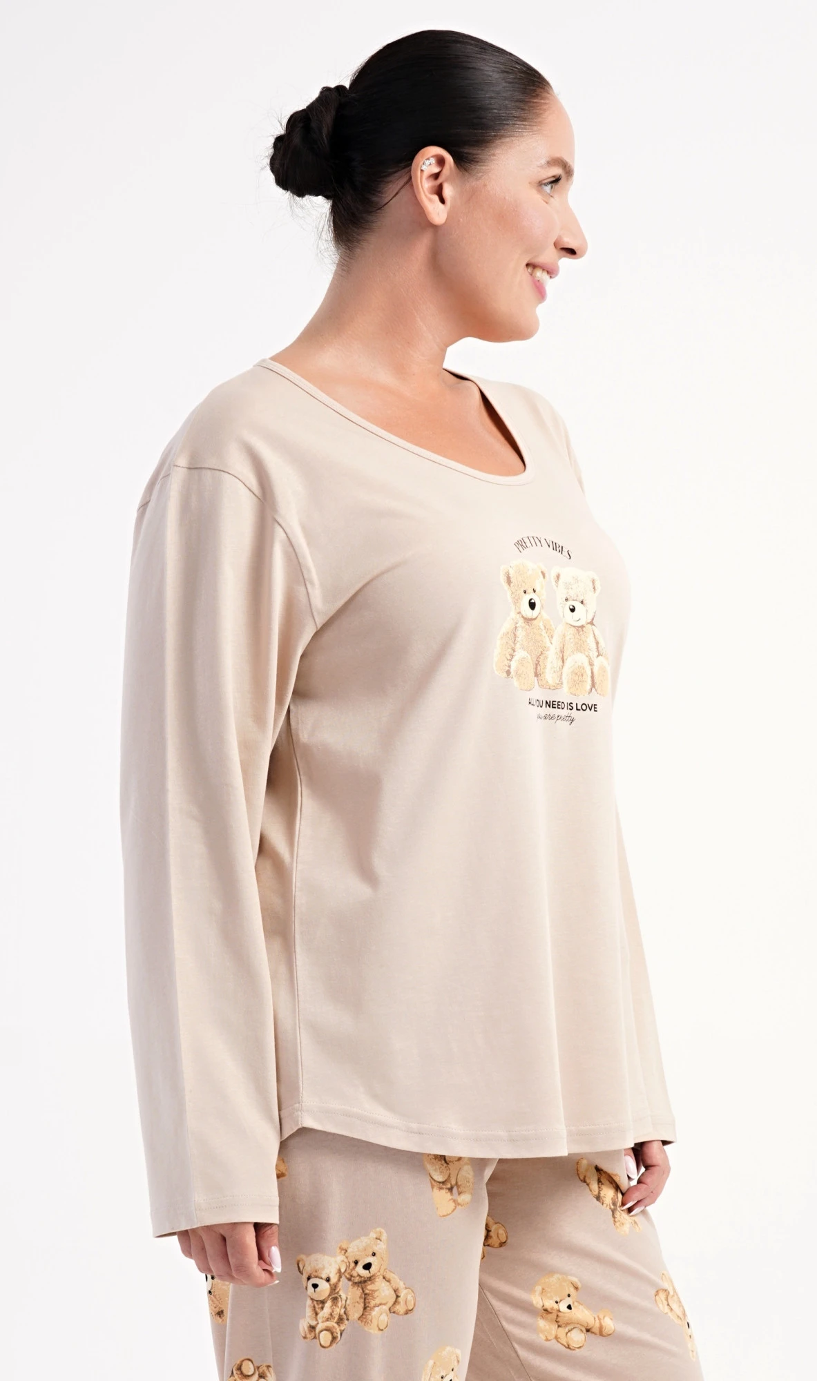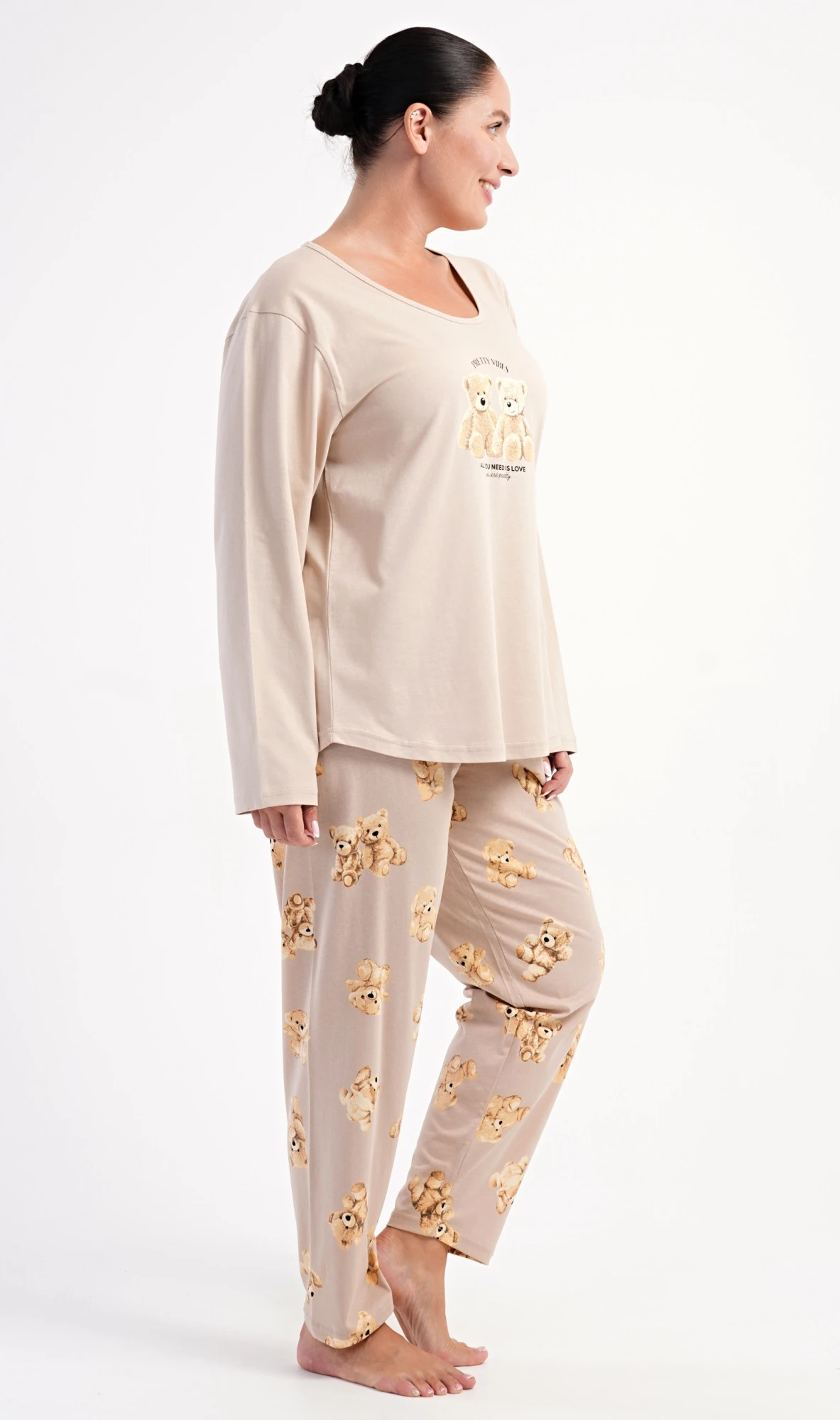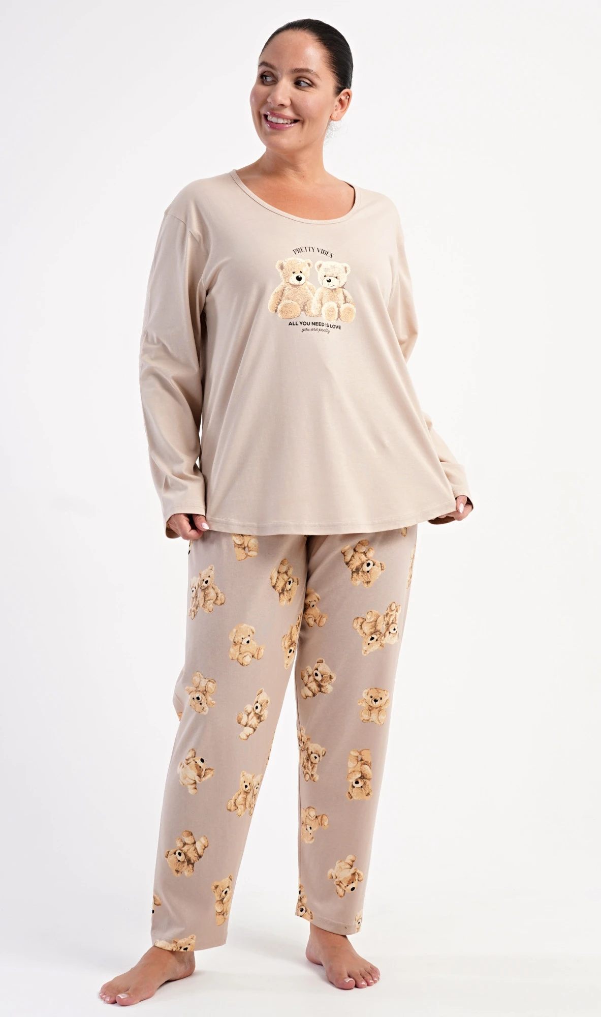 Dámské bavlněné dlouhé pyžamo Méďové. Dámské pyžamo se skládá z trika s dlouhým rukávem a dlouhých kalhot. Triko s kulatým výstřihem je na hrudi zdobeno obrázkem plyšových medvědů. Tento motiv se opakuje i na kalhotách, které mají v pase gumu a šňůrku na stažení, nemají kapsy. Použitý bavlněný materiál je poddajný a příjemný na dotek.