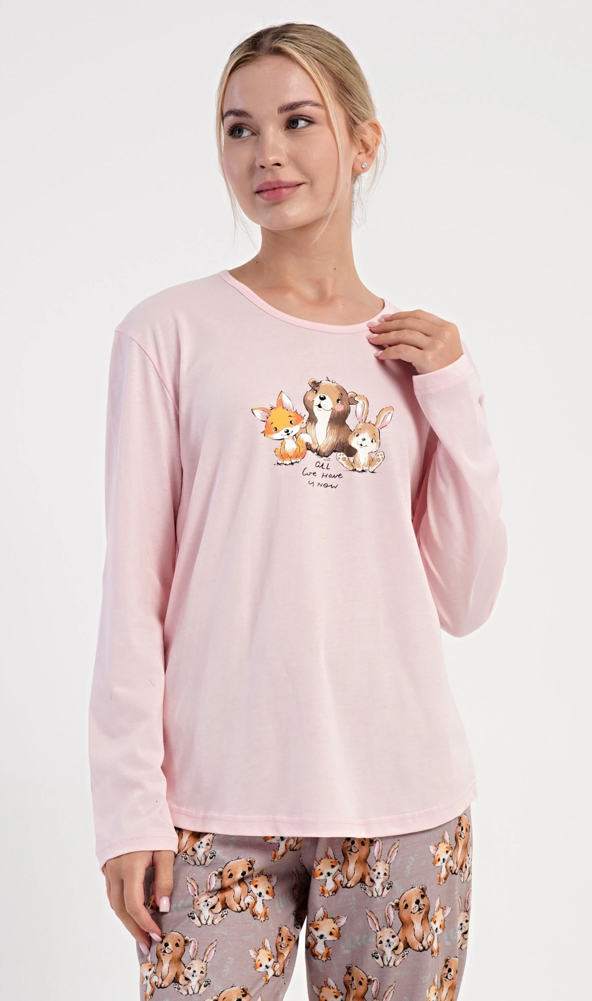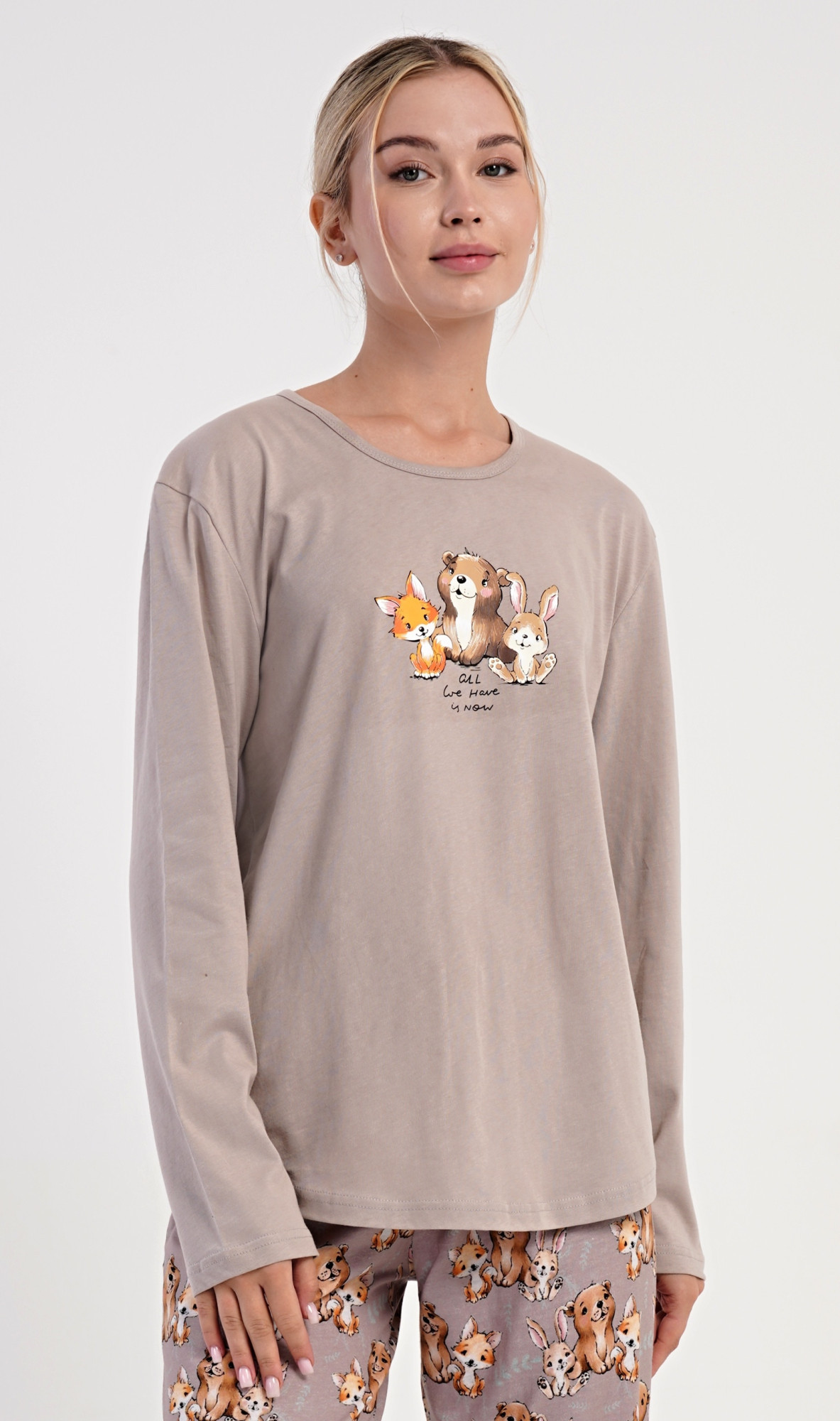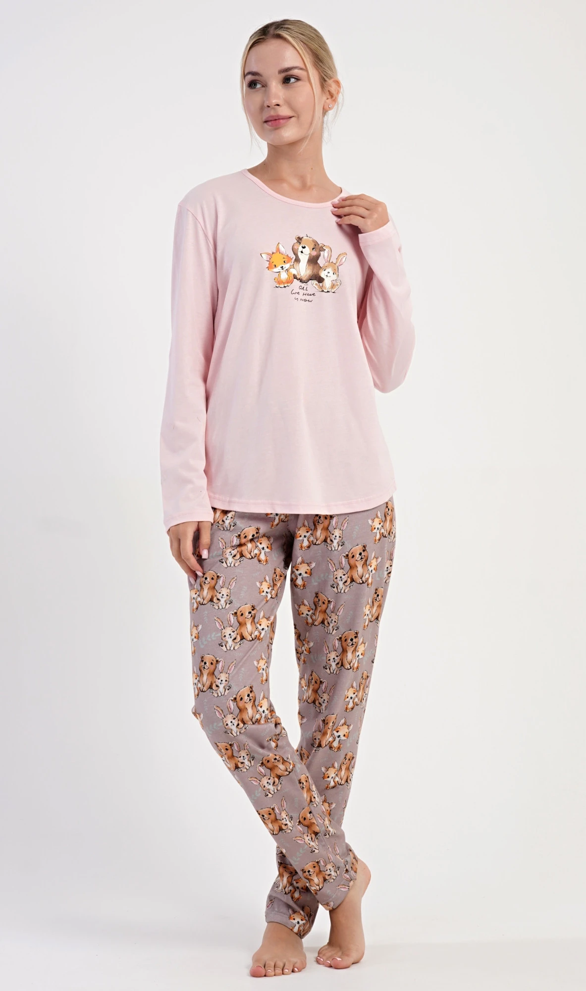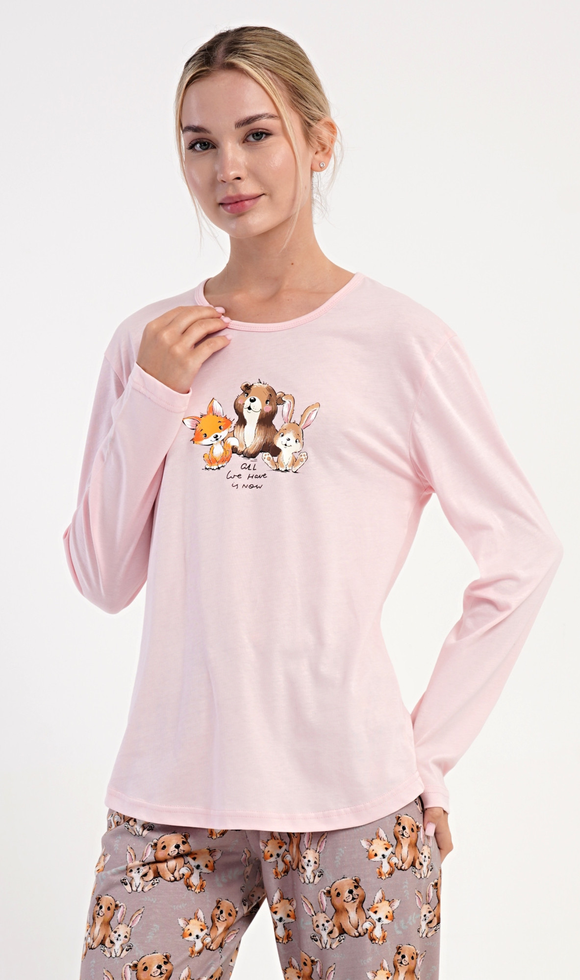 Dámské bavlněné dlouhé pyžamo Olivia. Dámské pyžamo se skládá z trika s dlouhým rukávem a dlouhých kalhot. Jednobarevné triko zdobí na hrudi obrázek malé lišky, štěněte a králíčka. Tento motiv se opakuje i na kalhotách, které mají v pase gumu a šňůrku na stažení, nemají kapsy. Použitý bavlněný materiál je poddajný a příjemný na dotek.