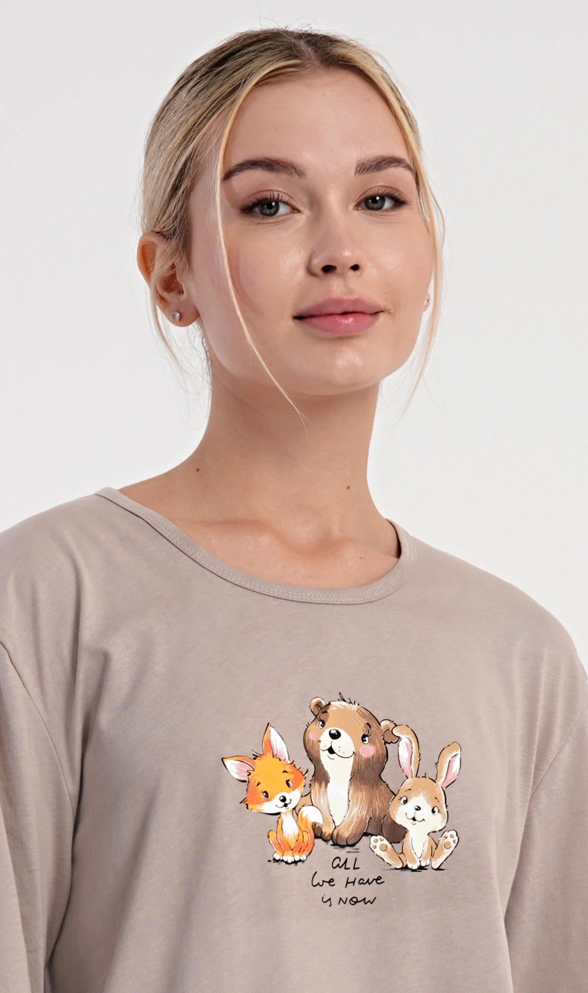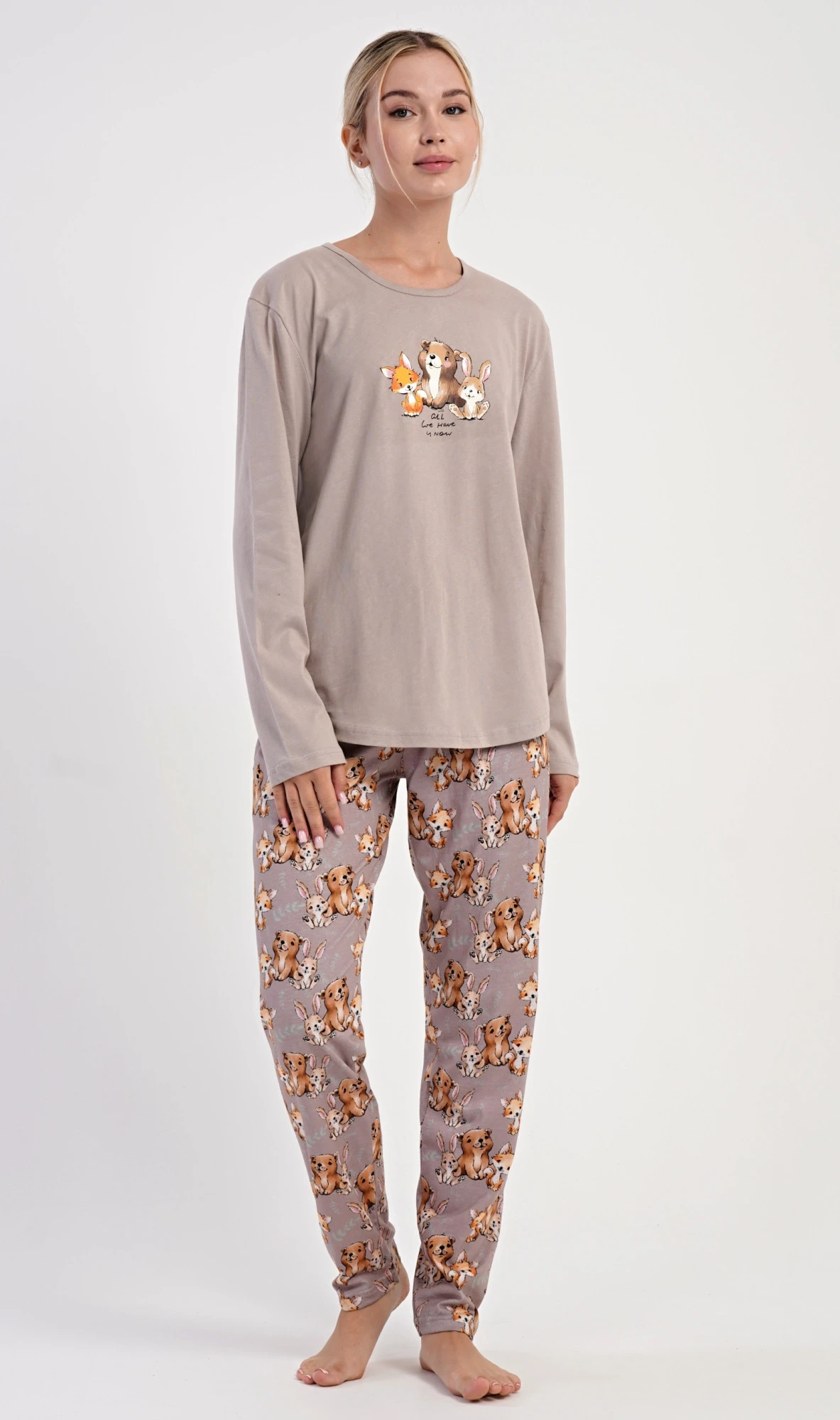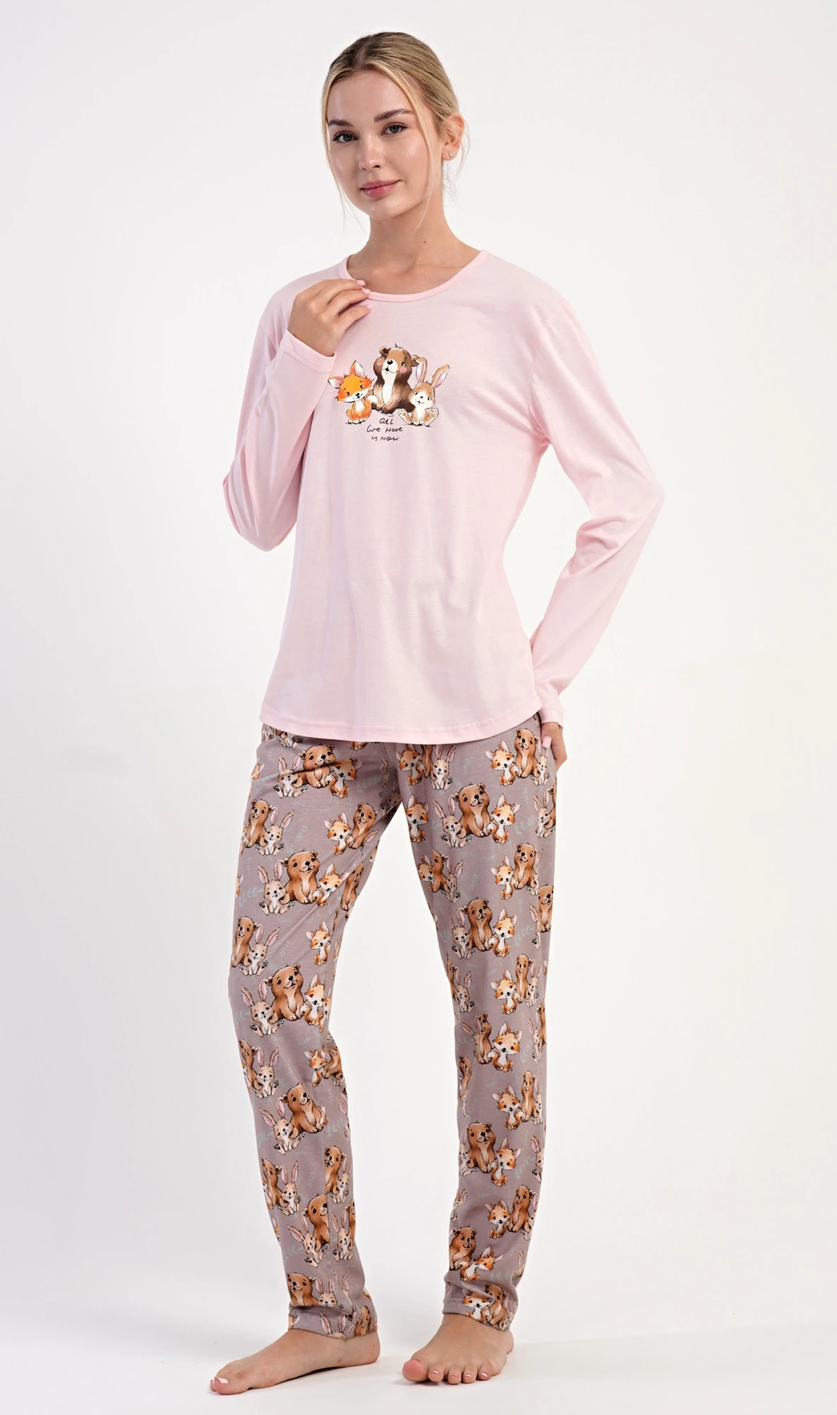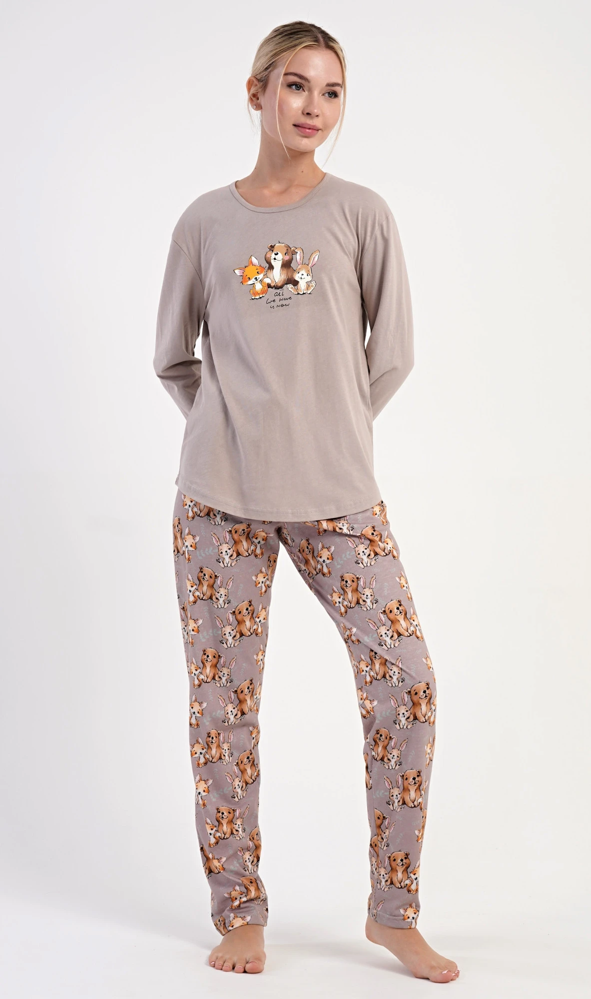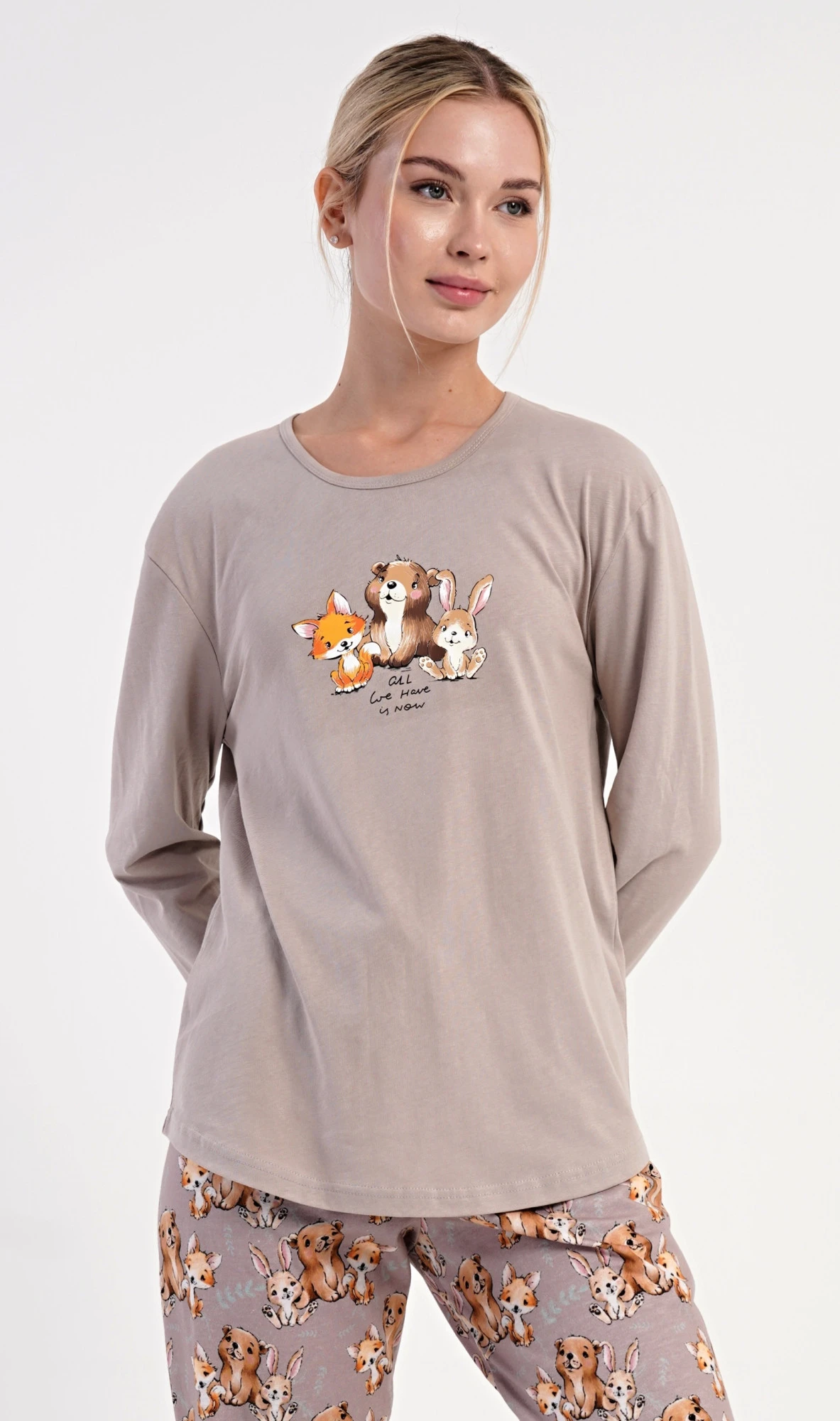 Dámské bavlněné dlouhé pyžamo Olivia. Dámské pyžamo se skládá z trika s dlouhým rukávem a dlouhých kalhot. Jednobarevné triko zdobí na hrudi obrázek malé lišky, štěněte a králíčka. Tento motiv se opakuje i na kalhotách, které mají v pase gumu a šňůrku na stažení, nemají kapsy. Použitý bavlněný materiál je poddajný a příjemný na dotek.