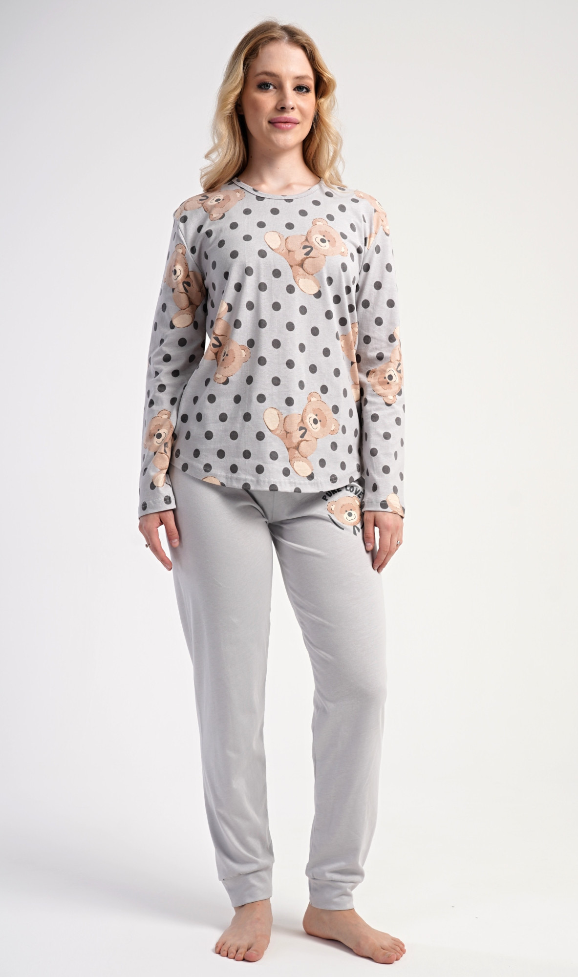 Dámské bavlněné dlouhé pyžamo Paula. Dámské pyžamo se skládá z trika s dlouhým rukávem a dlouhých kalhot. Jednobarevné triko je ozdobeno obrázkem medvědů. Tento motiv se opakuje i na kalhotách, které mají v pase gumu a šňůrku na stažení, nemají kapsy. Použitý bavlněný materiál je poddajný a příjemný na dotek.