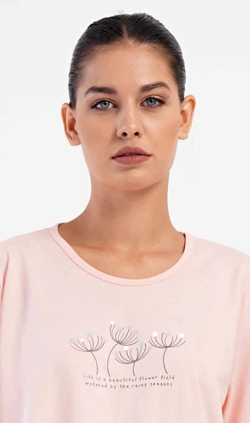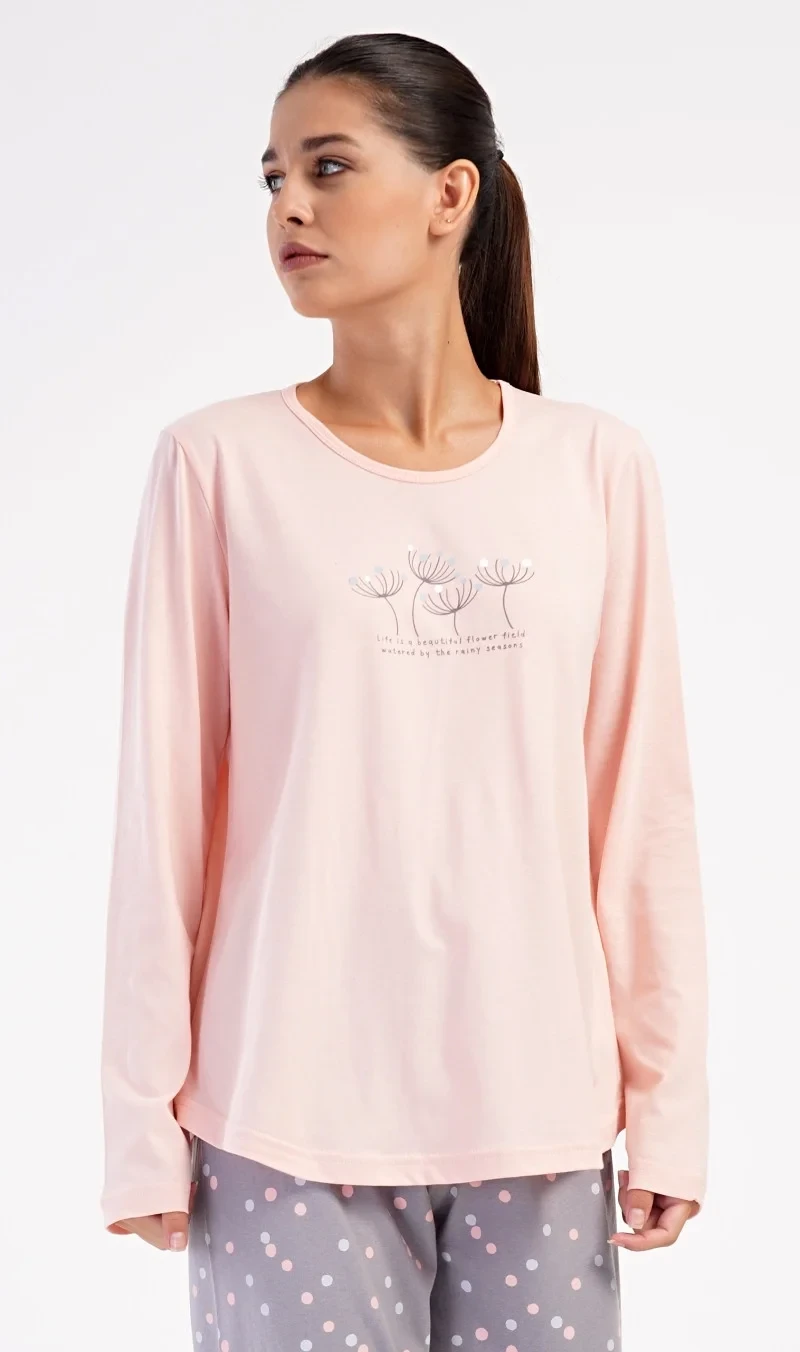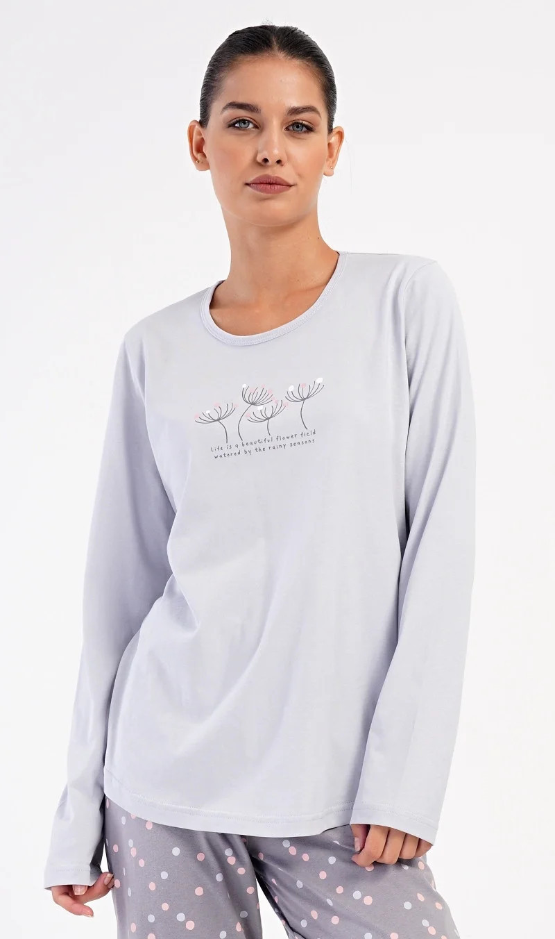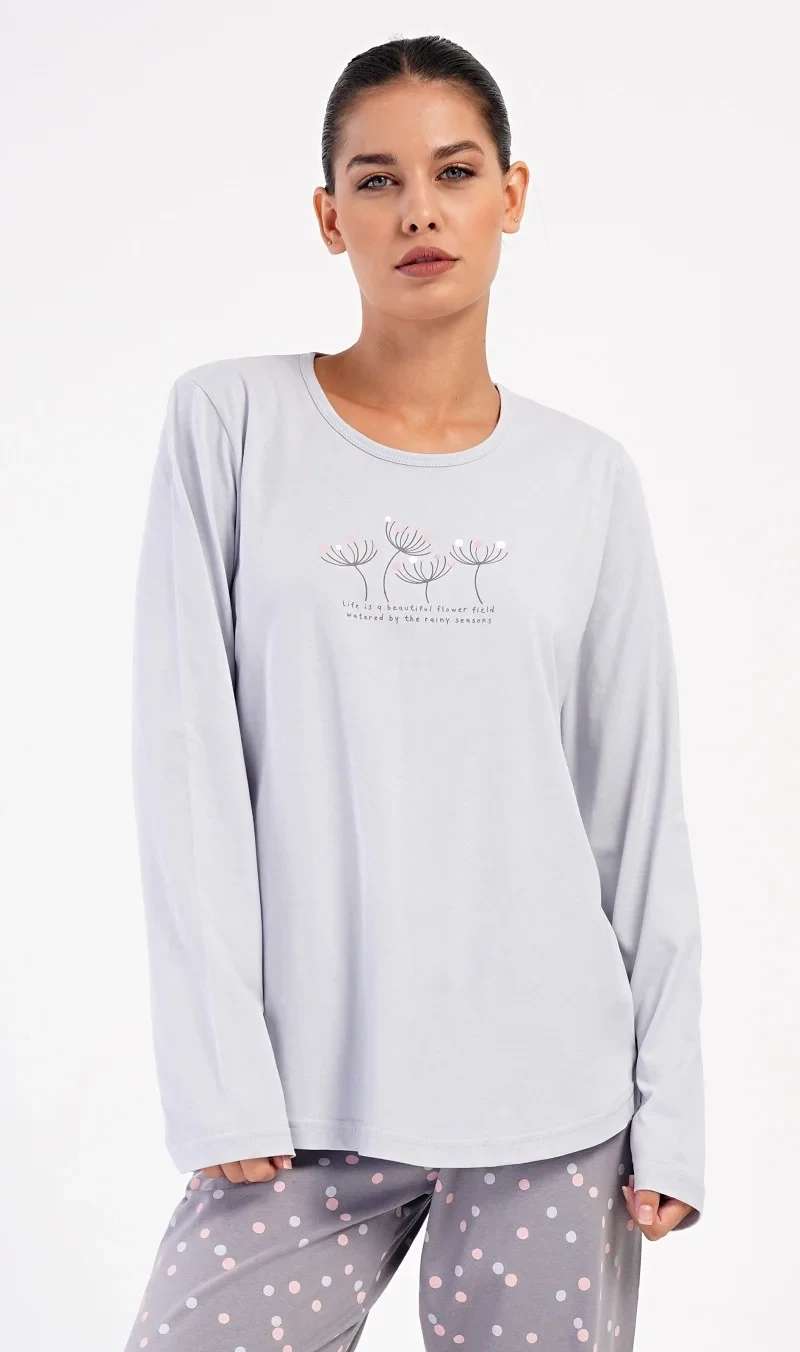 Dámské bavlněné dlouhé pyžamo Petra. Dámské pyžamo se skládá z trika s dlouhým rukávem a dlouhých kalhot. Triko je jednobarevné, zdobené obrázkem pampelišek a drobným nápisem. Kalhoty mají v pase gumu a šňůrku na stažení, nemají kapsy. Použitý bavlněný materiál je poddajný a příjemný na dotek.