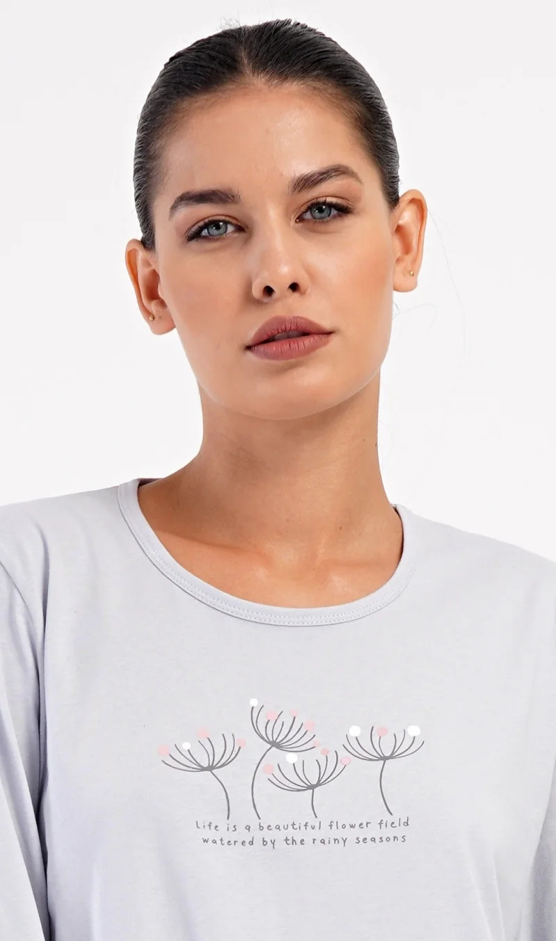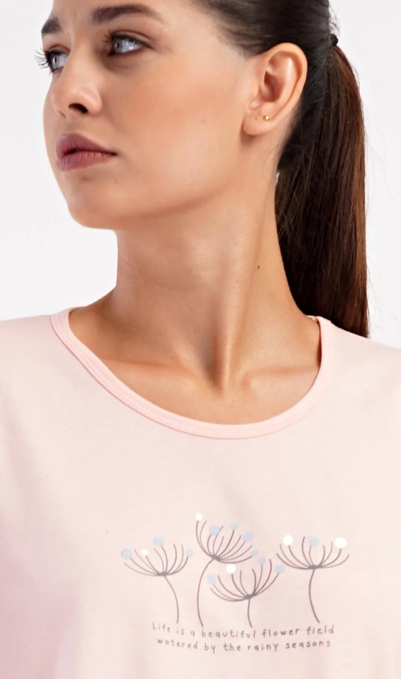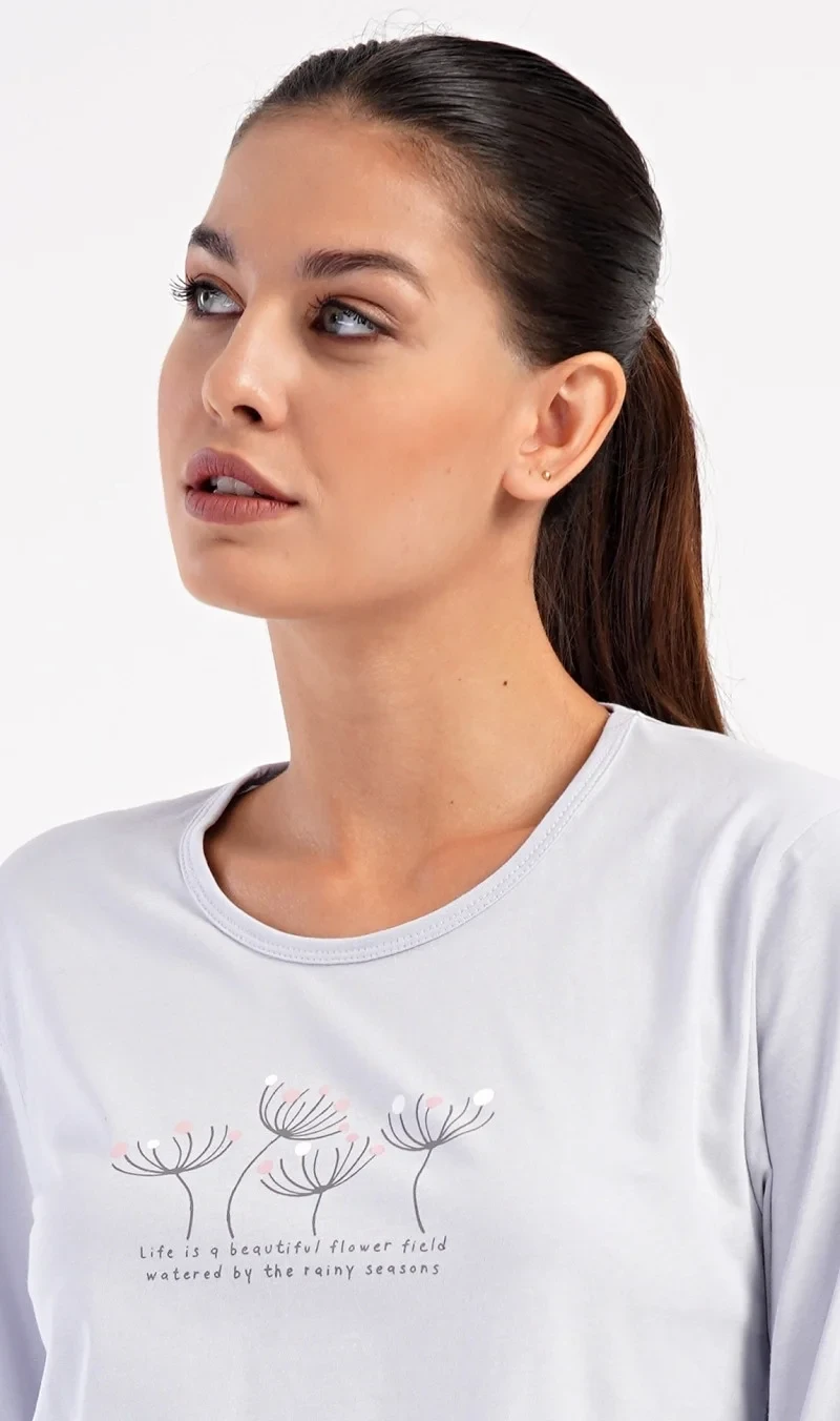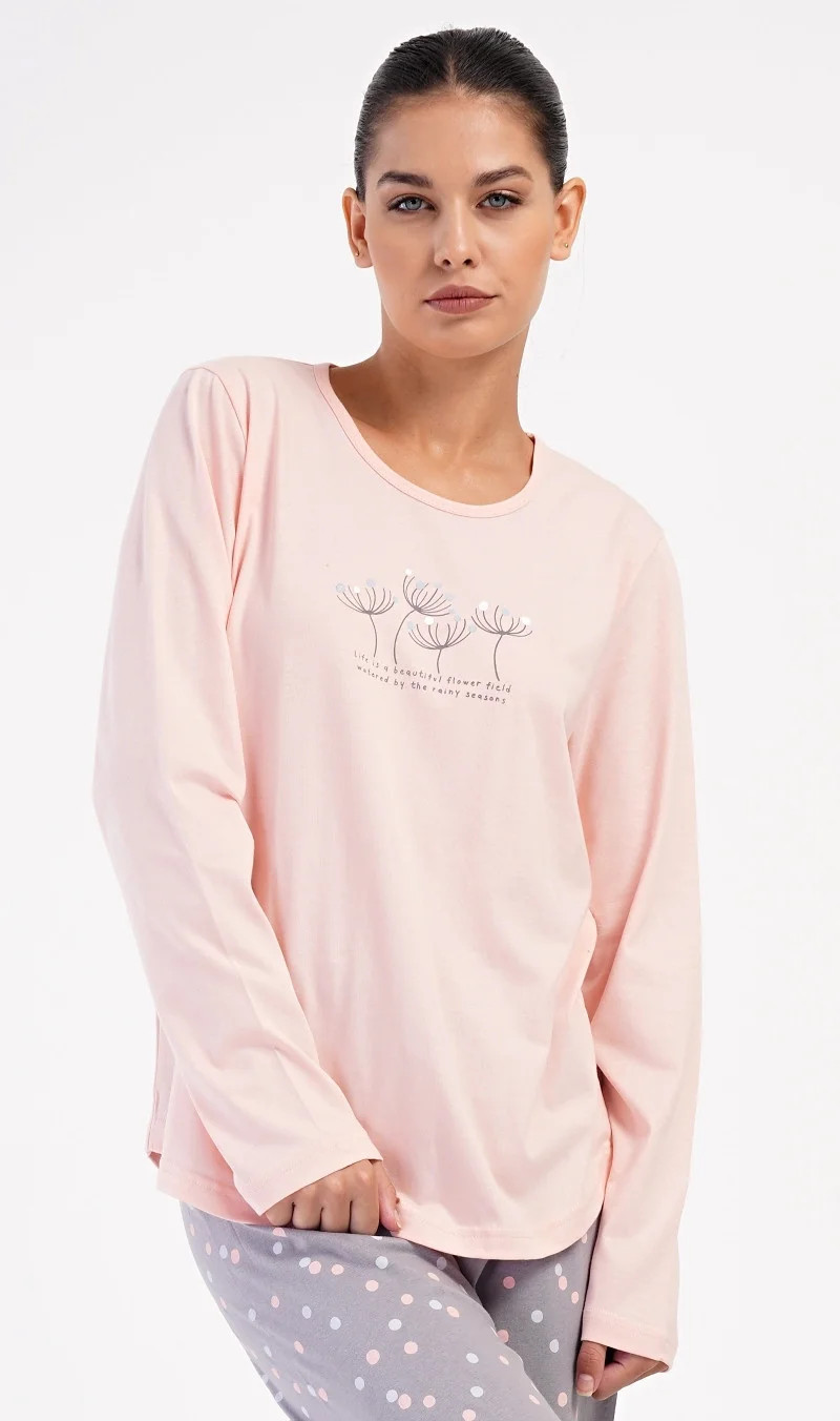 Dámské bavlněné dlouhé pyžamo Petra. Dámské pyžamo se skládá z trika s dlouhým rukávem a dlouhých kalhot. Triko je jednobarevné, zdobené obrázkem pampelišek a drobným nápisem. Kalhoty mají v pase gumu a šňůrku na stažení, nemají kapsy. Použitý bavlněný materiál je poddajný a příjemný na dotek.