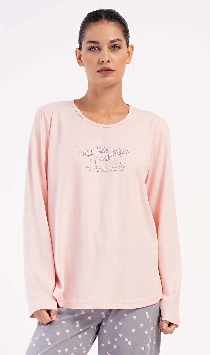 Dámské bavlněné dlouhé pyžamo Petra. Dámské pyžamo se skládá z trika s dlouhým rukávem a dlouhých kalhot. Triko je jednobarevné, zdobené obrázkem pampelišek a drobným nápisem. Kalhoty mají v pase gumu a šňůrku na stažení, nemají kapsy. Použitý bavlněný materiál je poddajný a příjemný na dotek.