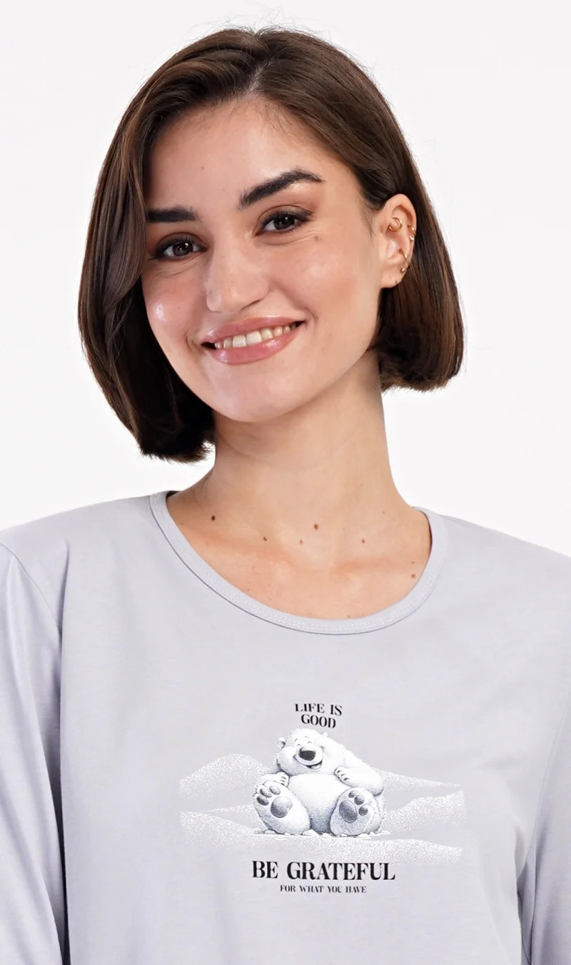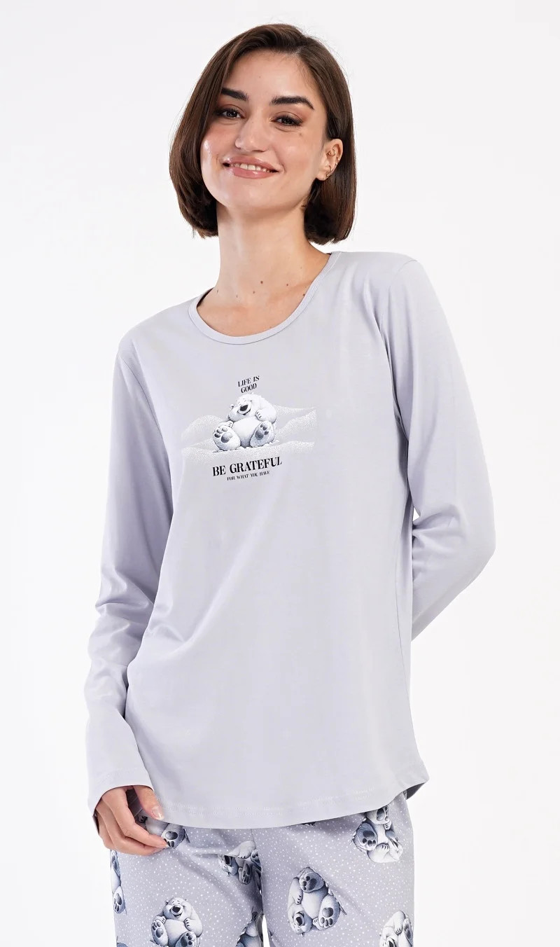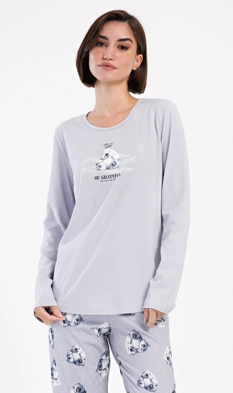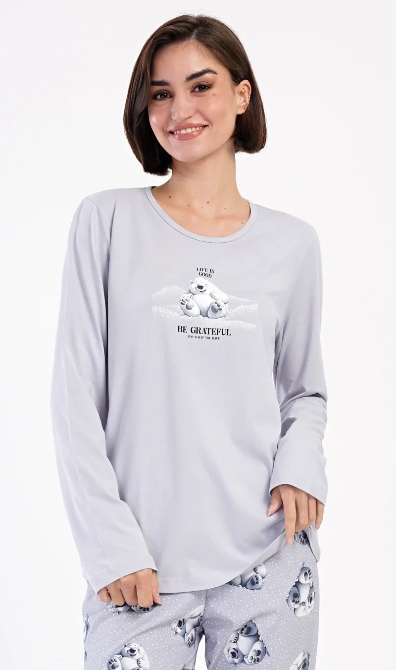 Dámské bavlněné dlouhé pyžamo Polar bear. Dámské pyžamo se skládá z trika s dlouhým rukávem a dlouhých kalhot. Triko je jednobarevné, zdobené obrázkem veselého ledního medvěda a nápisem 'Be grateful'. Obrázky medvědů se opakují i na kalhotách, které mají v pase gumu a šňůrku na stažení, nemají kapsy. Použitý bavlněný materiál je poddajný a příjemný na dotek.