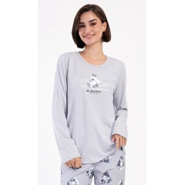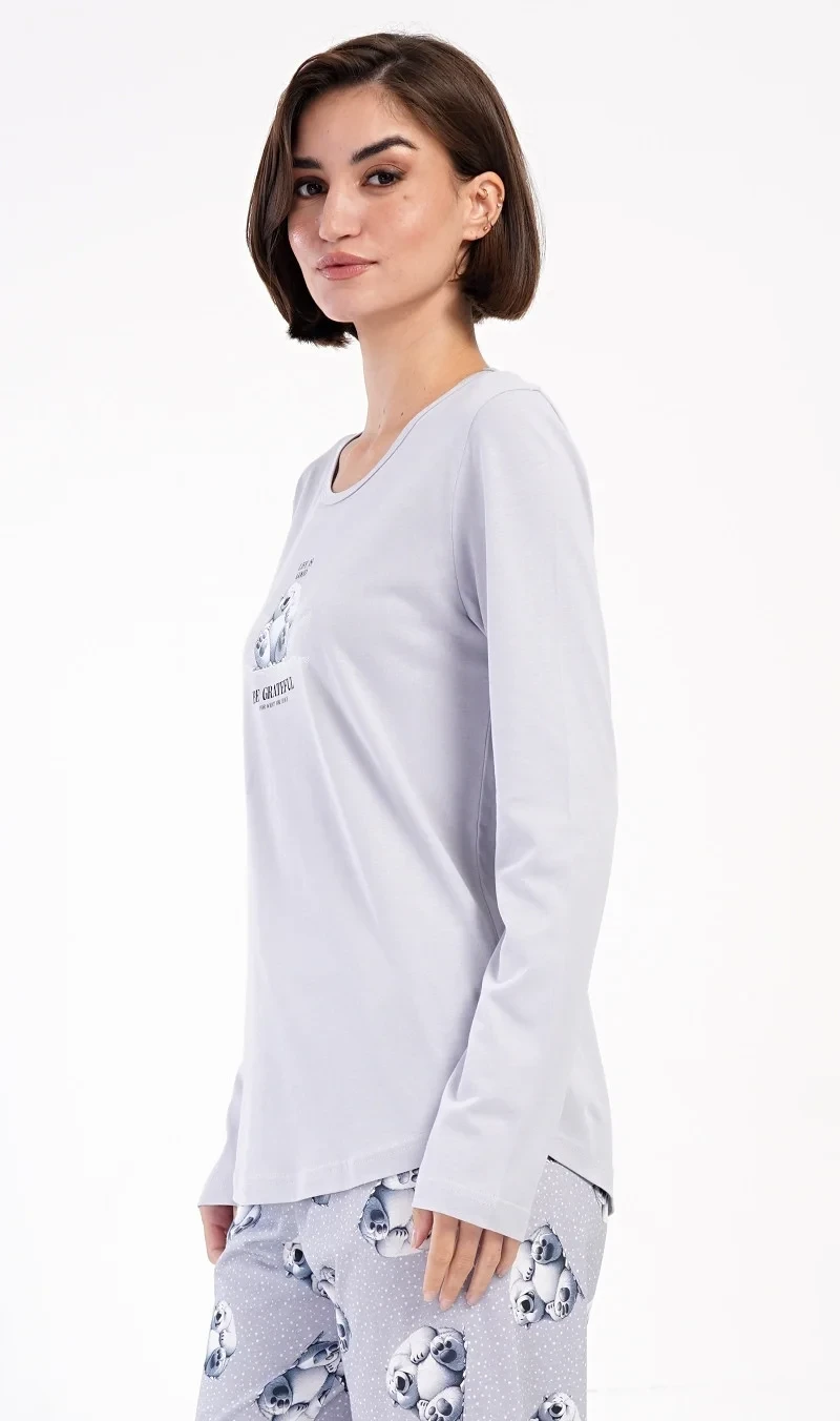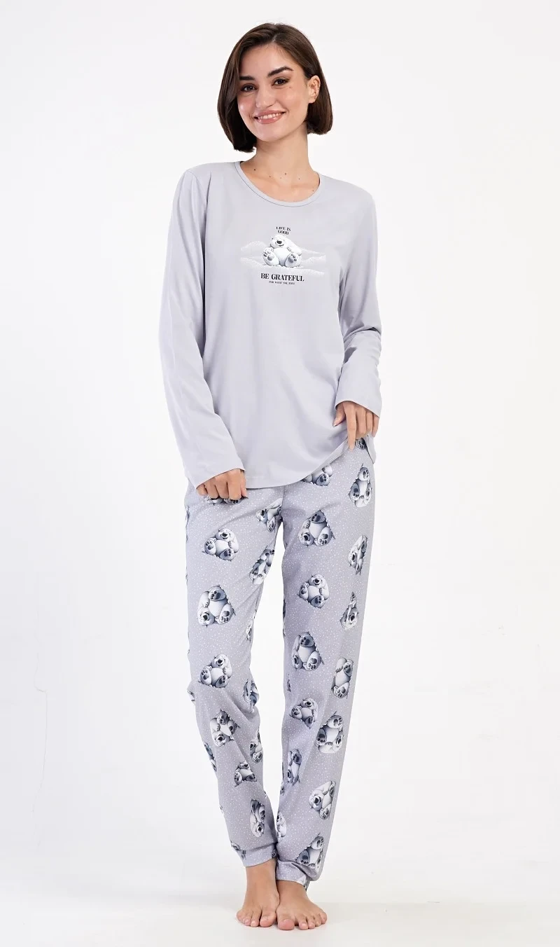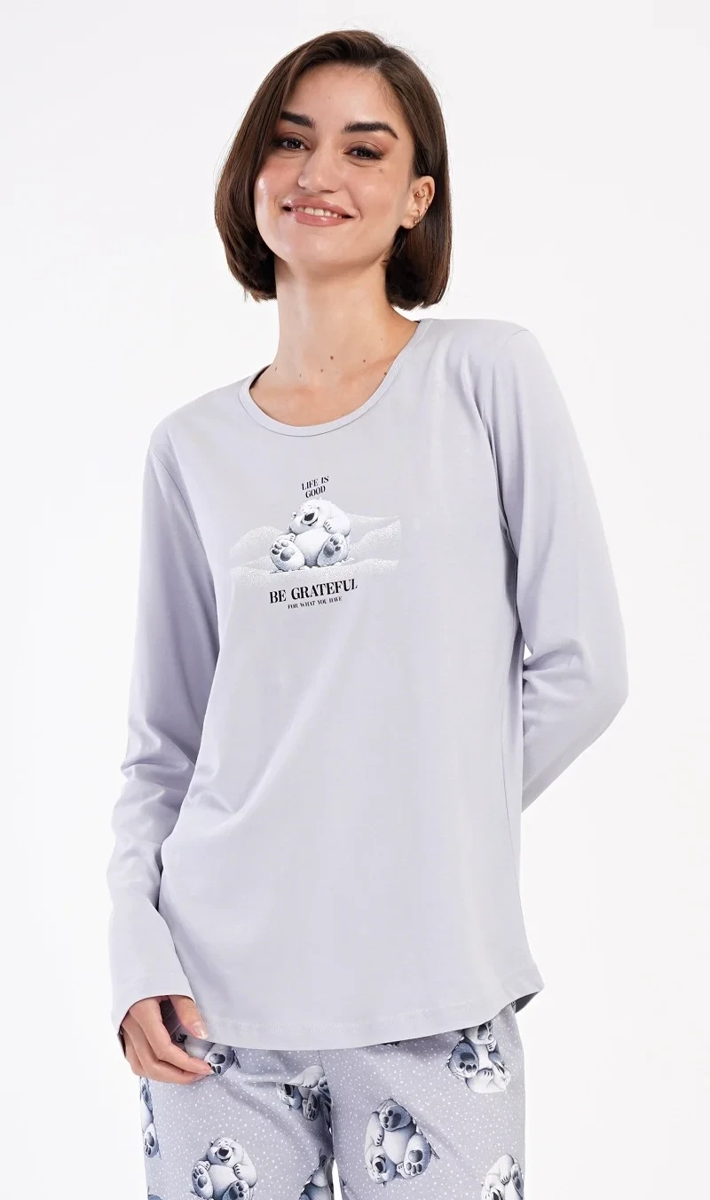 Dámské bavlněné dlouhé pyžamo Polar bear. Dámské pyžamo se skládá z trika s dlouhým rukávem a dlouhých kalhot. Triko je jednobarevné, zdobené obrázkem veselého ledního medvěda a nápisem 'Be grateful'. Obrázky medvědů se opakují i na kalhotách, které mají v pase gumu a šňůrku na stažení, nemají kapsy. Použitý bavlněný materiál je poddajný a příjemný na dotek.