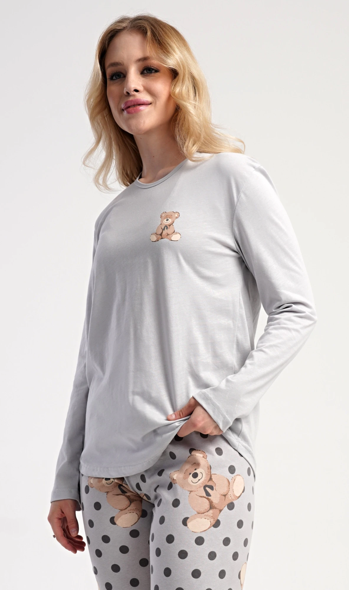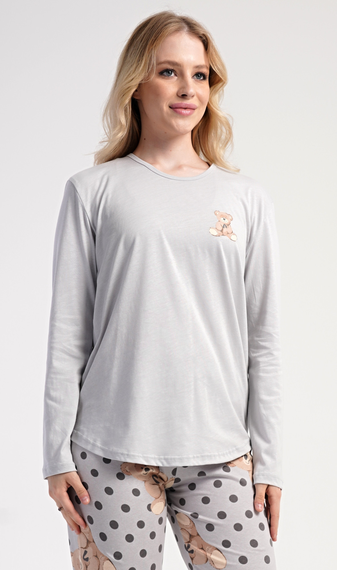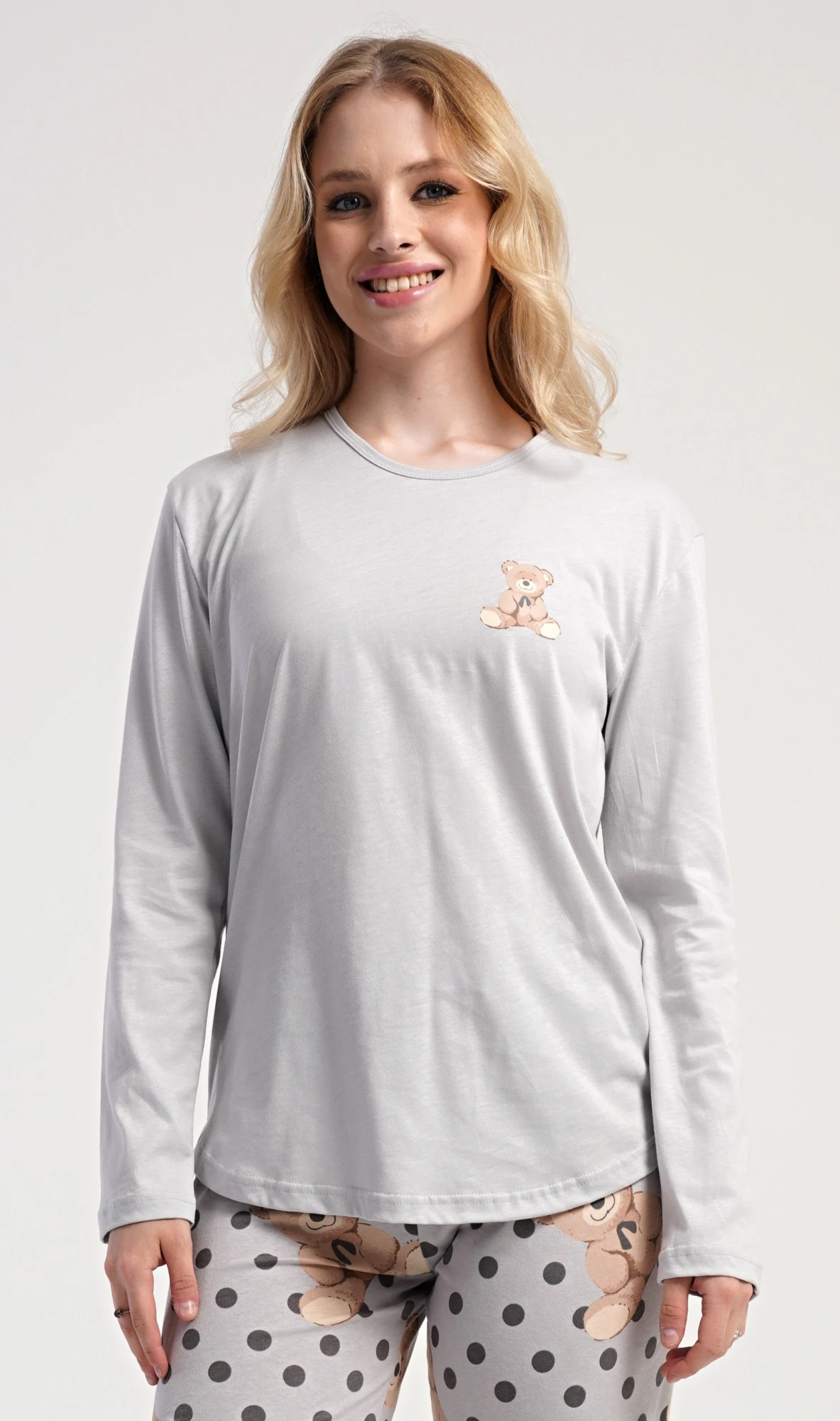 Dámské bavlněné dlouhé pyžamo Poppy. Dámské pyžamo se skládá z trika s dlouhým rukávem a dlouhých kalhot. Jednobarevné triko s kulatým výstřihem je ozdobeno obrázkem medvídka. Tento motiv se opakuje i na kalhotách, které mají v pase gumu a šňůrku na stažení, nemají kapsy. Použitý bavlněný materiál je poddajný a příjemný na dotek.