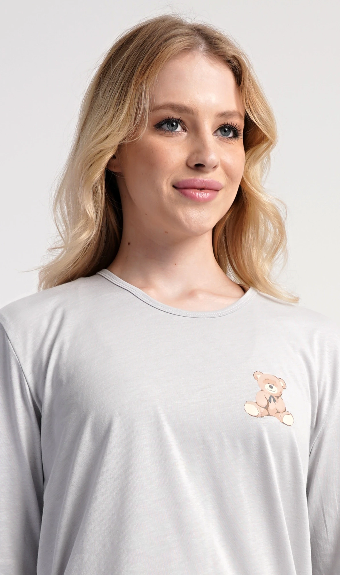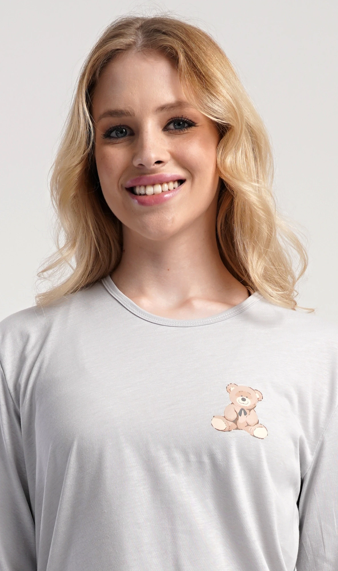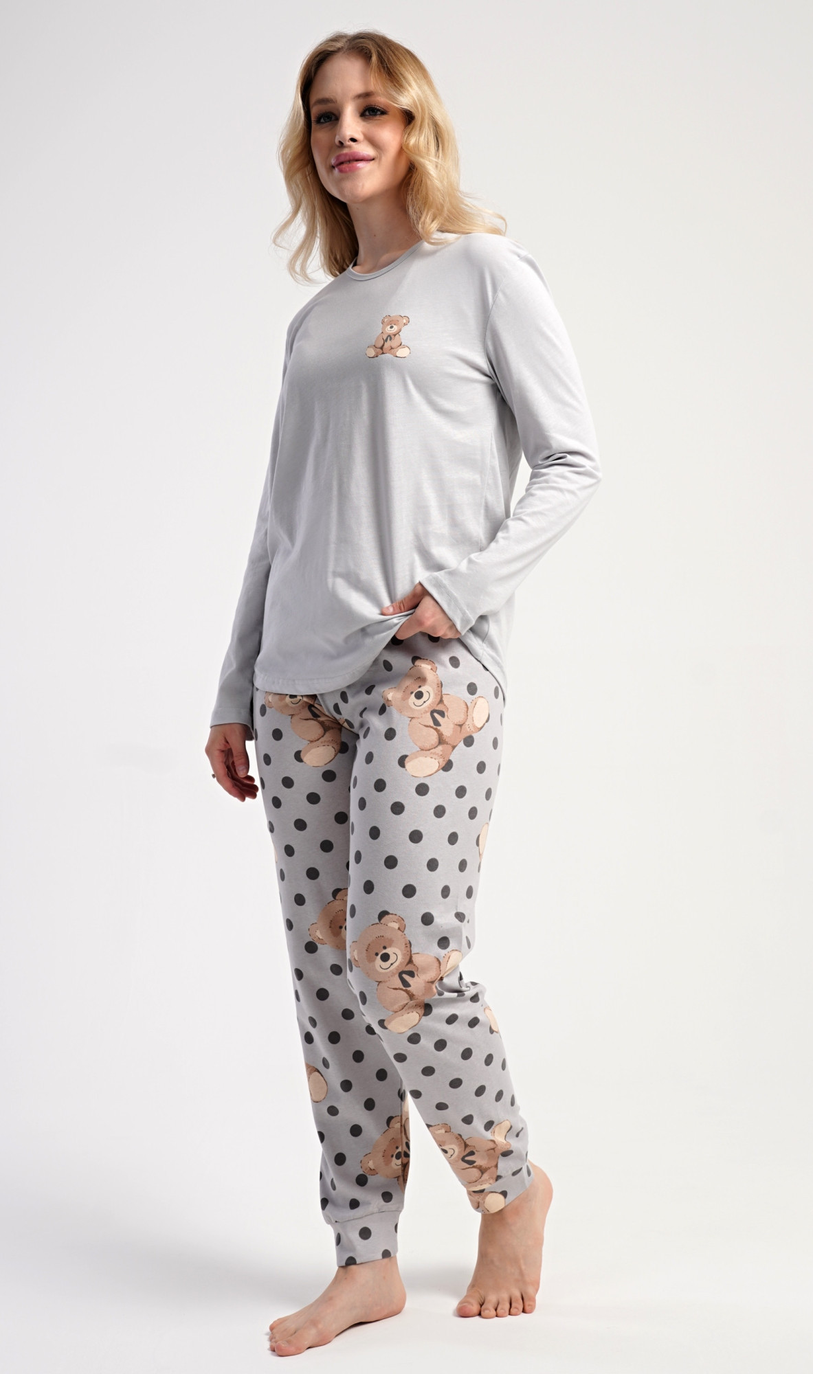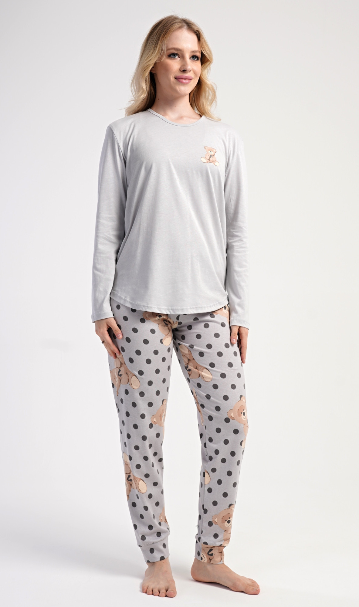 Dámské bavlněné dlouhé pyžamo Poppy. Dámské pyžamo se skládá z trika s dlouhým rukávem a dlouhých kalhot. Jednobarevné triko s kulatým výstřihem je ozdobeno obrázkem medvídka. Tento motiv se opakuje i na kalhotách, které mají v pase gumu a šňůrku na stažení, nemají kapsy. Použitý bavlněný materiál je poddajný a příjemný na dotek.
