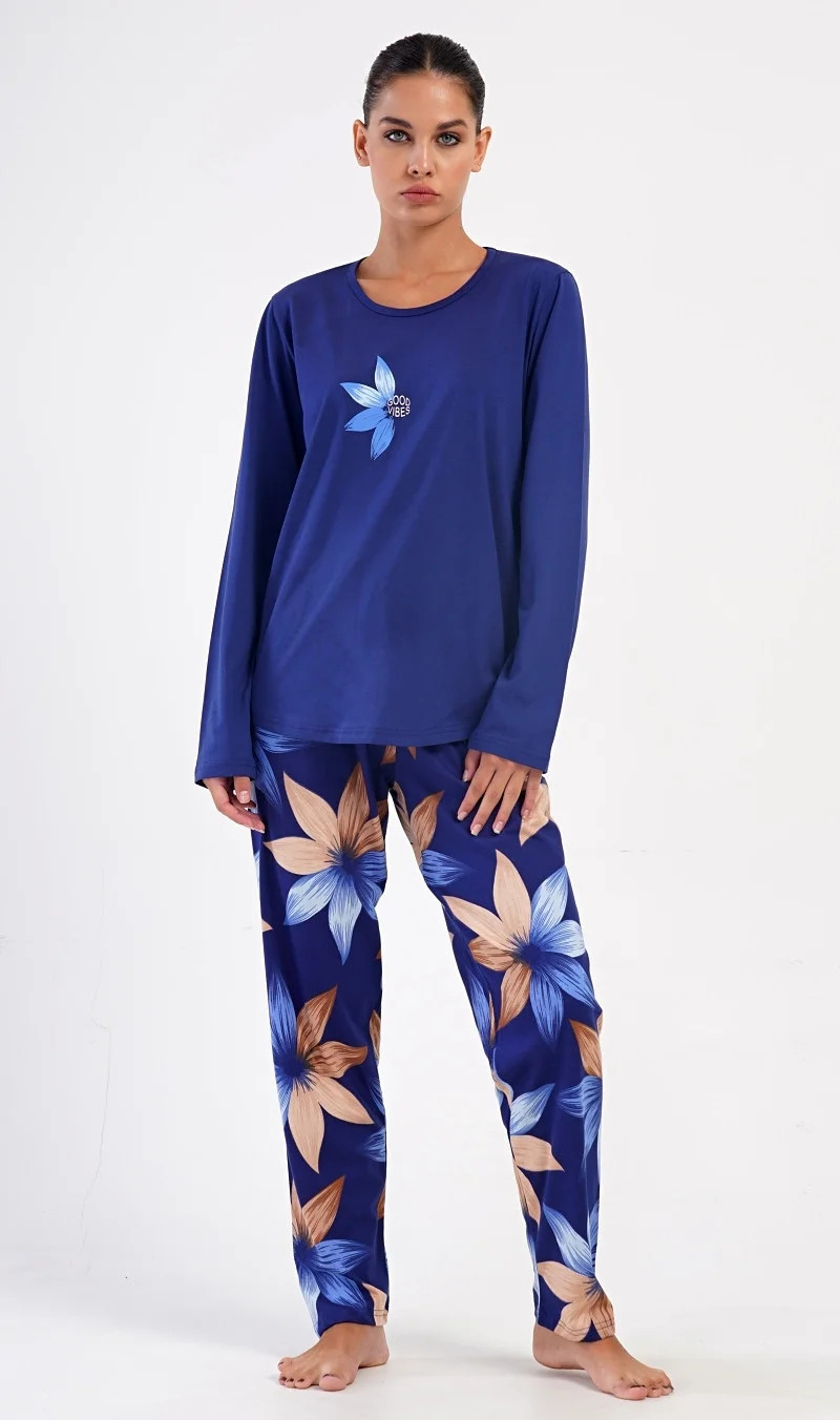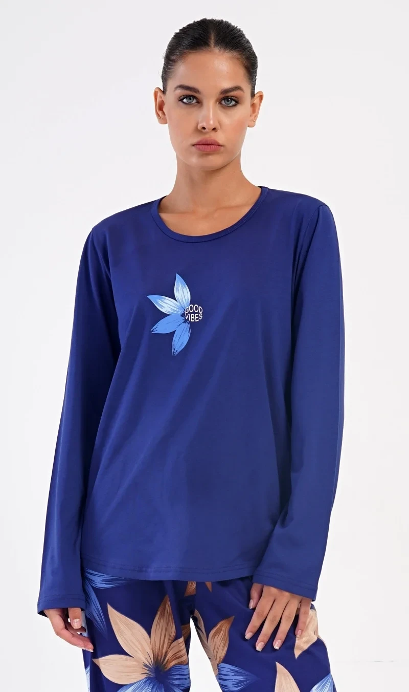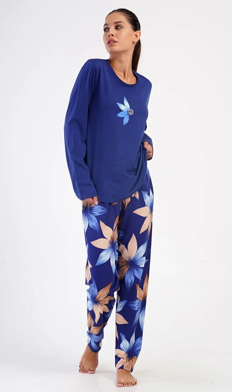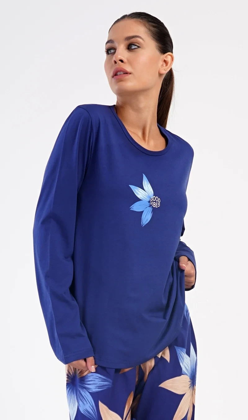 Dámské bavlněné dlouhé pyžamo Sára. Dámské pyžamo se skládá z trika s dlouhým rukávem a dlouhých kalhot. Triko je jednobarevné, zdobené obrázkem květu a drobným nápisem 'Good vibes'. Květinový potisk se opakuje i na kalhotách, které mají v pase gumu a šňůrku na stažení, nemají kapsy. Použitý bavlněný materiál je poddajný a příjemný na dotek.