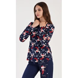 Dámské bavlněné pyžamo dlouhé Sob. Dámské pyžamo se skládá z trika s dlouhým rukávem a dlouhých kalhot. Triko je ozdobené nápisem obrázky sobů s vánoční čepkou a nápisy JOY. Stejný motiv se opakuje i na kalhotách. Kalhoty mají v pase gumu, šňůrku na stažení a jsou zakončené lemy. Použitý materiál je poddajný a jemný na dotek. Kalhoty i triko je složeno ze 100% bavlnou.