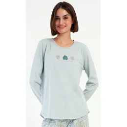 Dámské bavlněné dlouhé pyžamo Sofie. Dámské pyžamo se skládá z trika s dlouhým rukávem a dlouhých kalhot. Triko je jednobarevné, zdobené obrázkem listů a drobným nápisem. Motiv listů se opakuje i na kalhotách, které mají v pase gumu a šňůrku na stažení, nemají kapsy. Použitý bavlněný materiál je poddajný a příjemný na dotek.