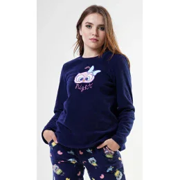 Dámské pyžamo dlouhé polarové Sovička. Dámské pyžamo se skládá z trika s dlouhým rukávem a dlouhých kalhot. Triko je ozdobené aplikací - obrázkem sovy a nápisem Night. Polarový materiál je hřejivý a hebký na dotek. Kalhoty jsou potištěné obrázky soviček. Kalhoty jsou do gumy, na stažení šňůrkou a mají kapsy, také jsou vyrobeny z polaru.