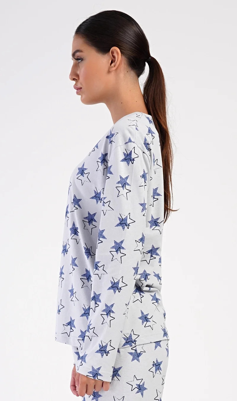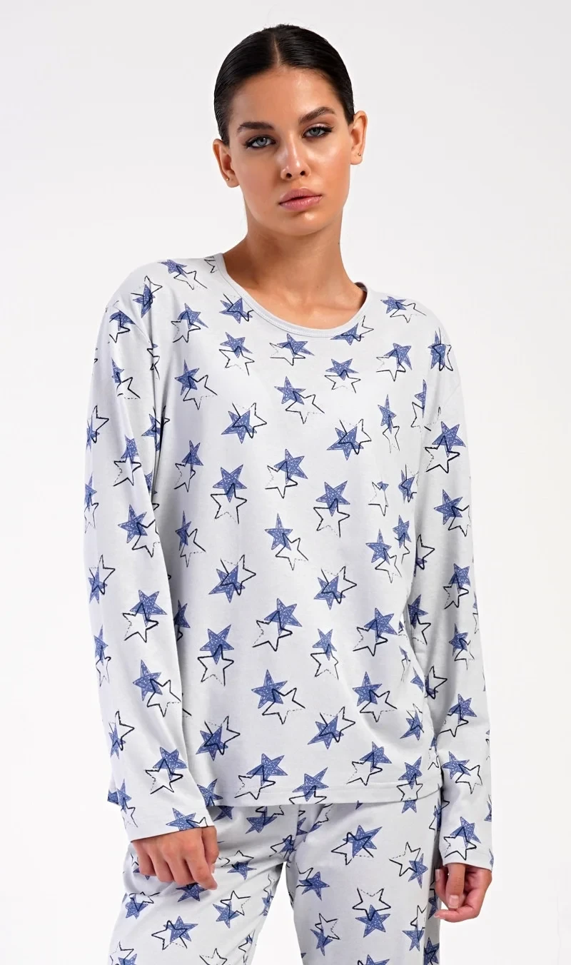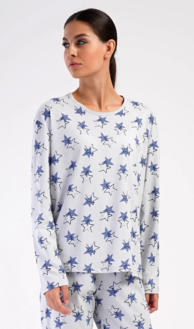 Dámské bavlněné dlouhé pyžamo Stars. Dámské pyžamo se skládá z trika s dlouhým rukávem a dlouhých kalhot. Triko je jednobarevné, potištěné hvězdami. Tento motiv se opakuje i na kalhotách, které mají v pase gumu a šňůrku na stažení, nemají kapsy. Použitý bavlněný materiál je poddajný a příjemný na dotek.