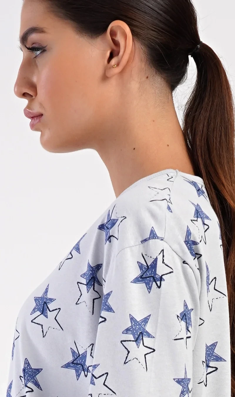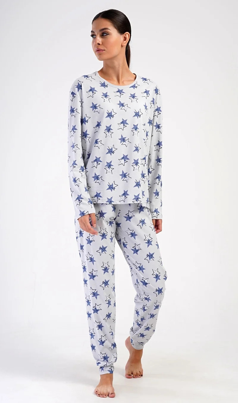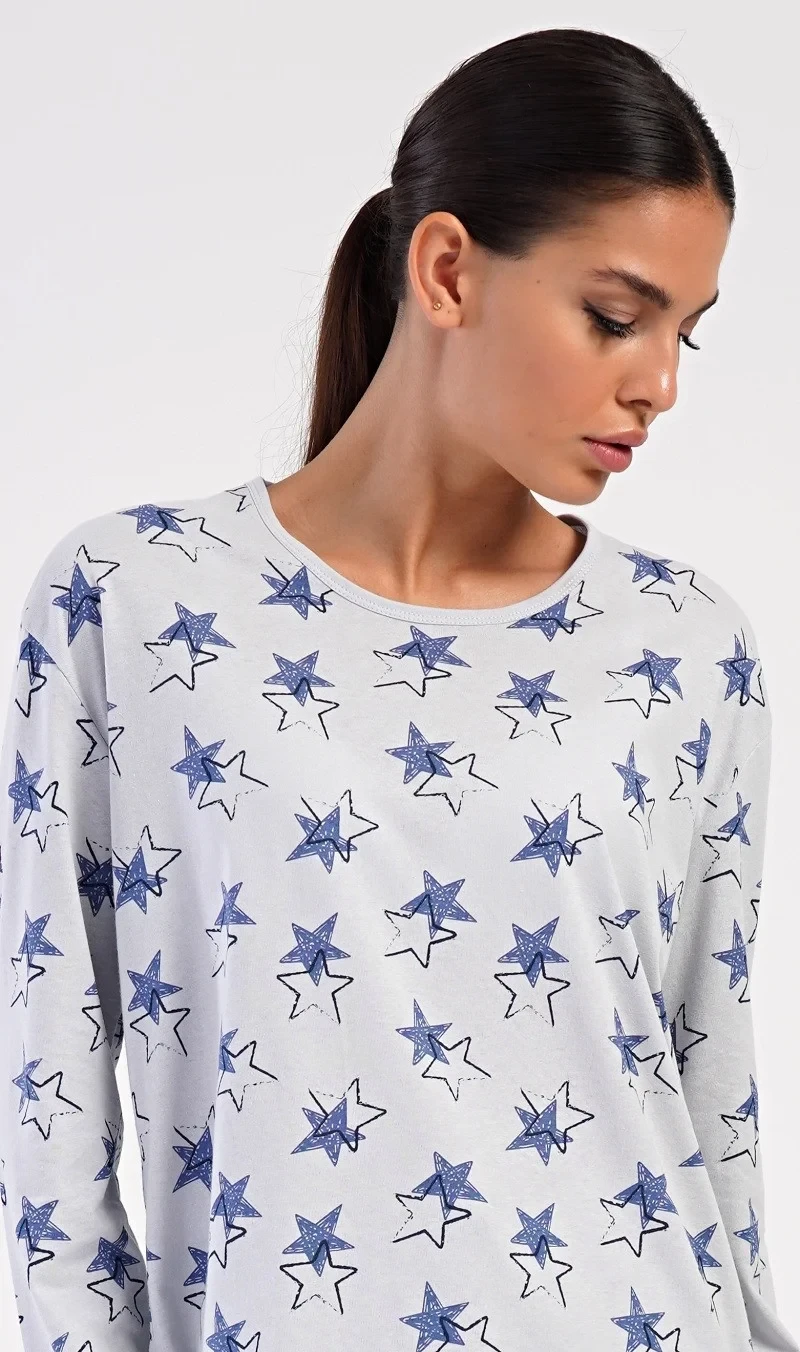 Dámské bavlněné dlouhé pyžamo Stars. Dámské pyžamo se skládá z trika s dlouhým rukávem a dlouhých kalhot. Triko je jednobarevné, potištěné hvězdami. Tento motiv se opakuje i na kalhotách, které mají v pase gumu a šňůrku na stažení, nemají kapsy. Použitý bavlněný materiál je poddajný a příjemný na dotek.
