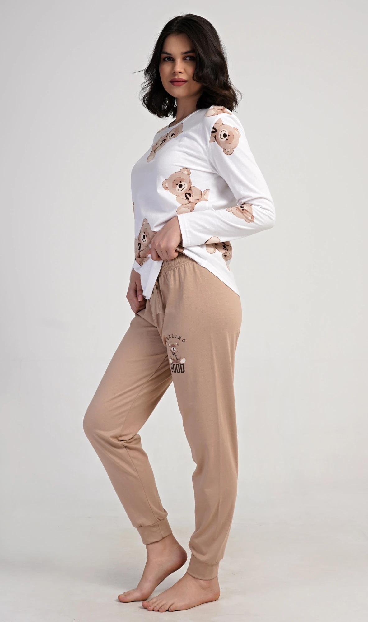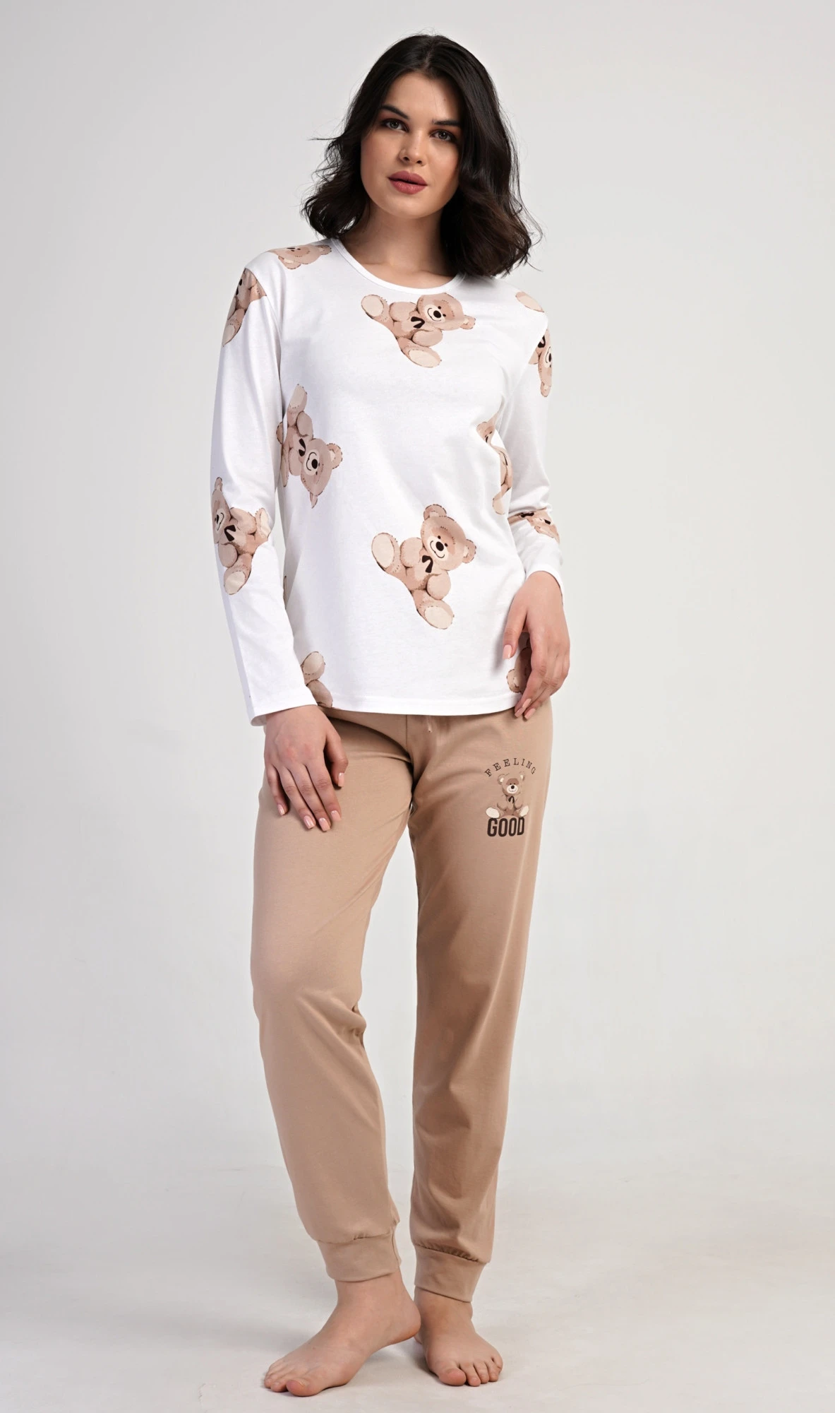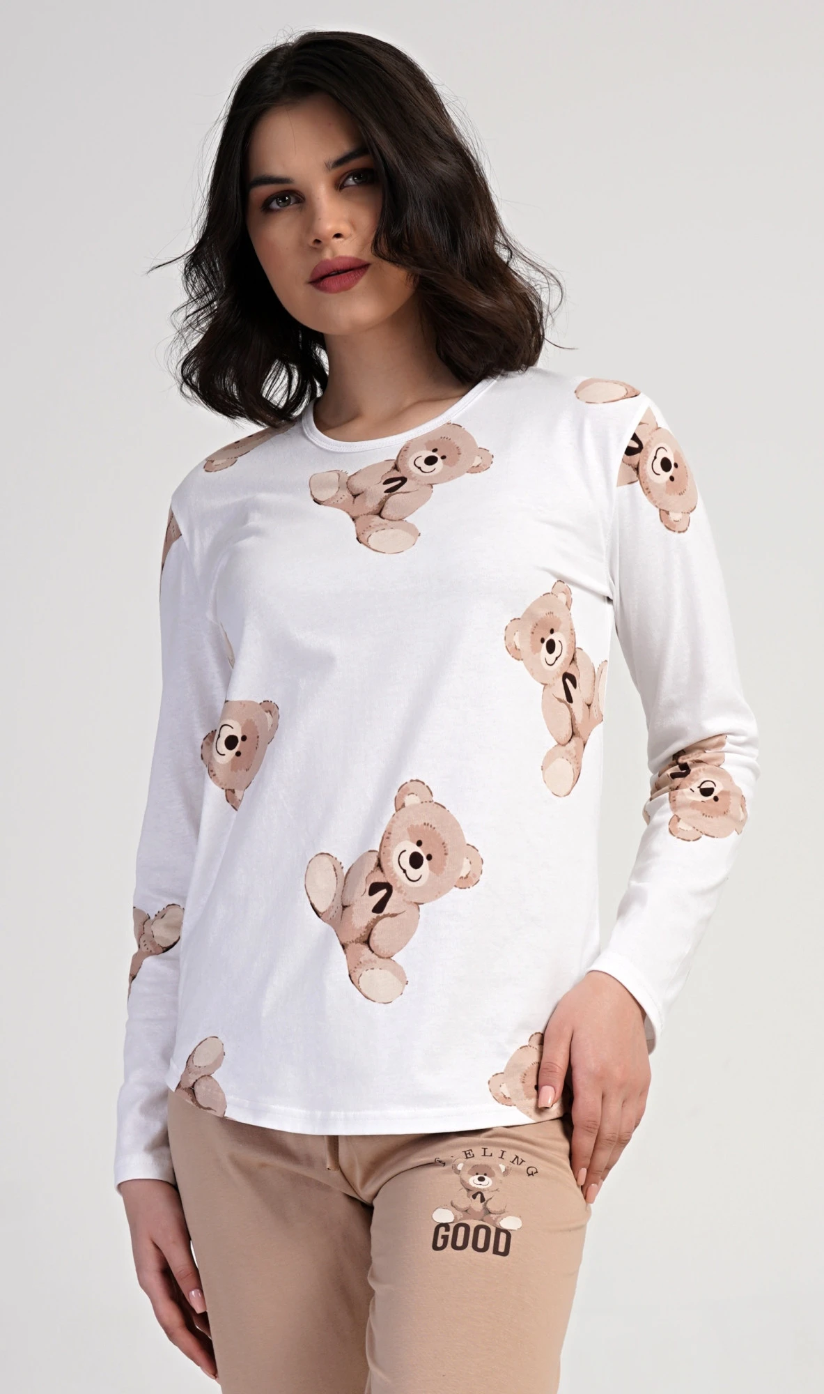 Dámské bavlněné dlouhé pyžamo Teddy bear. Dámské pyžamo se skládá z trika s dlouhým rukávem a dlouhých kalhot. Triko je potištěno plyšovými medvídky. Tento motiv se opakuje i na kalhotách, které mají v pase gumu a šňůrku na stažení, nemají kapsy. Použitý bavlněný materiál je poddajný a příjemný na dotek.