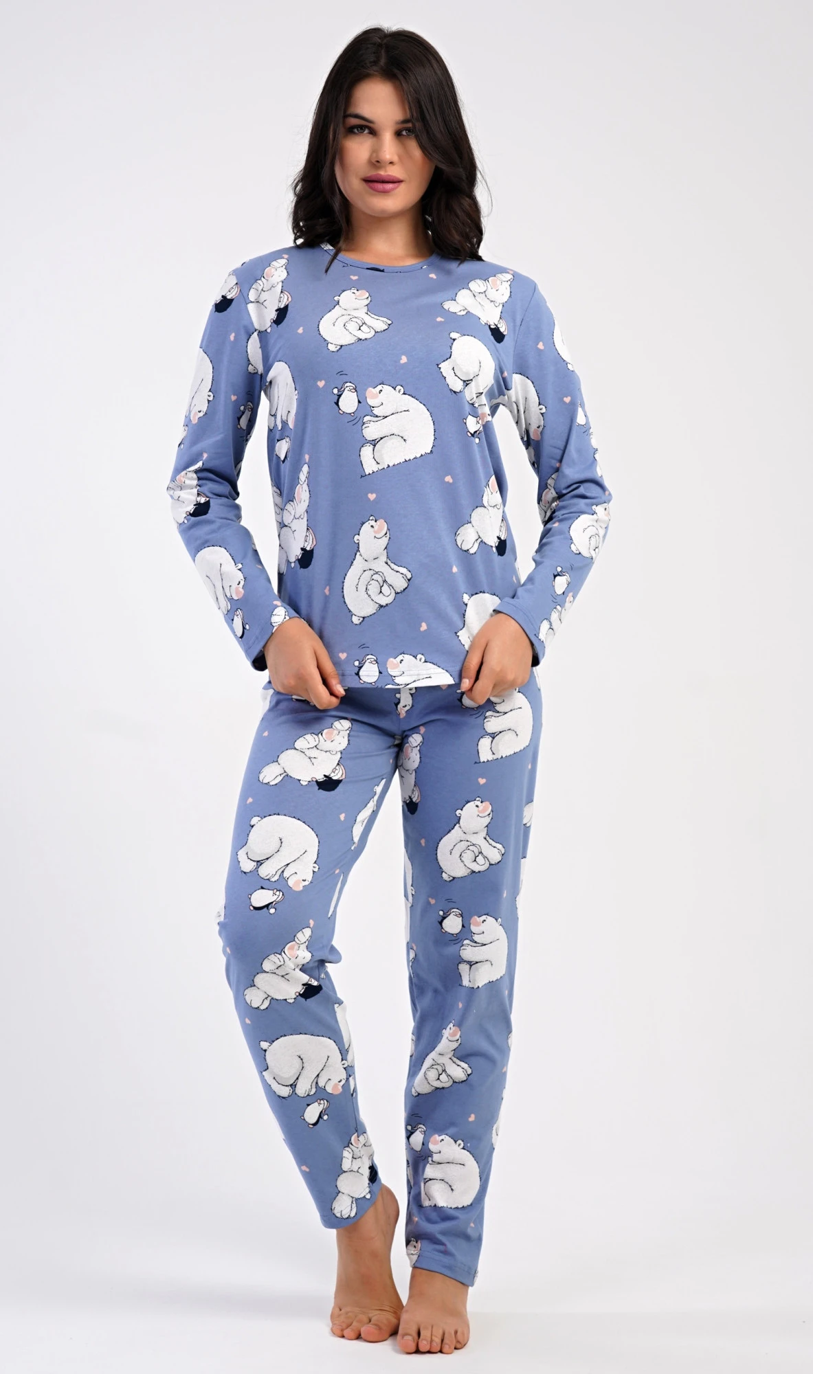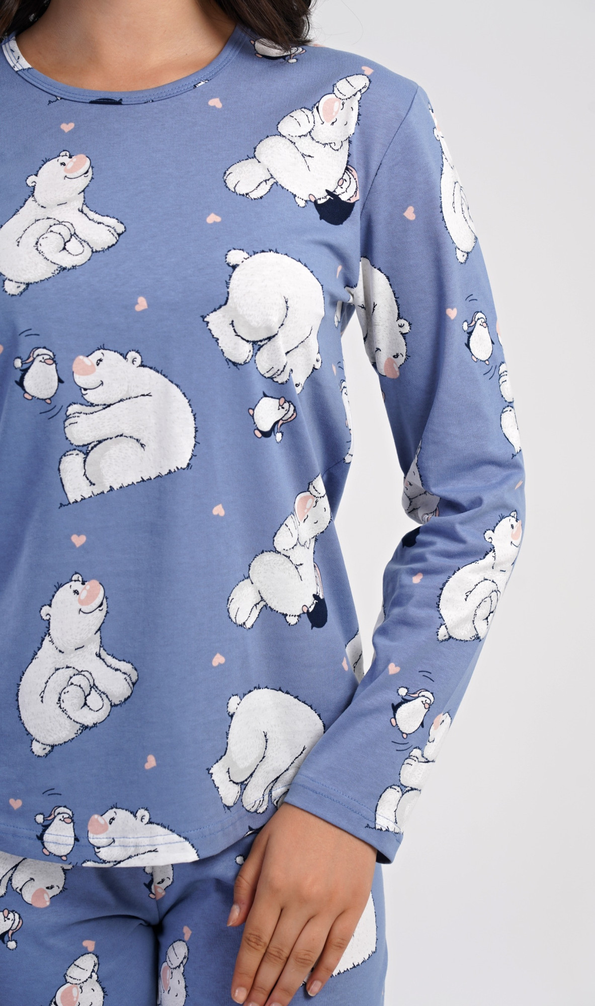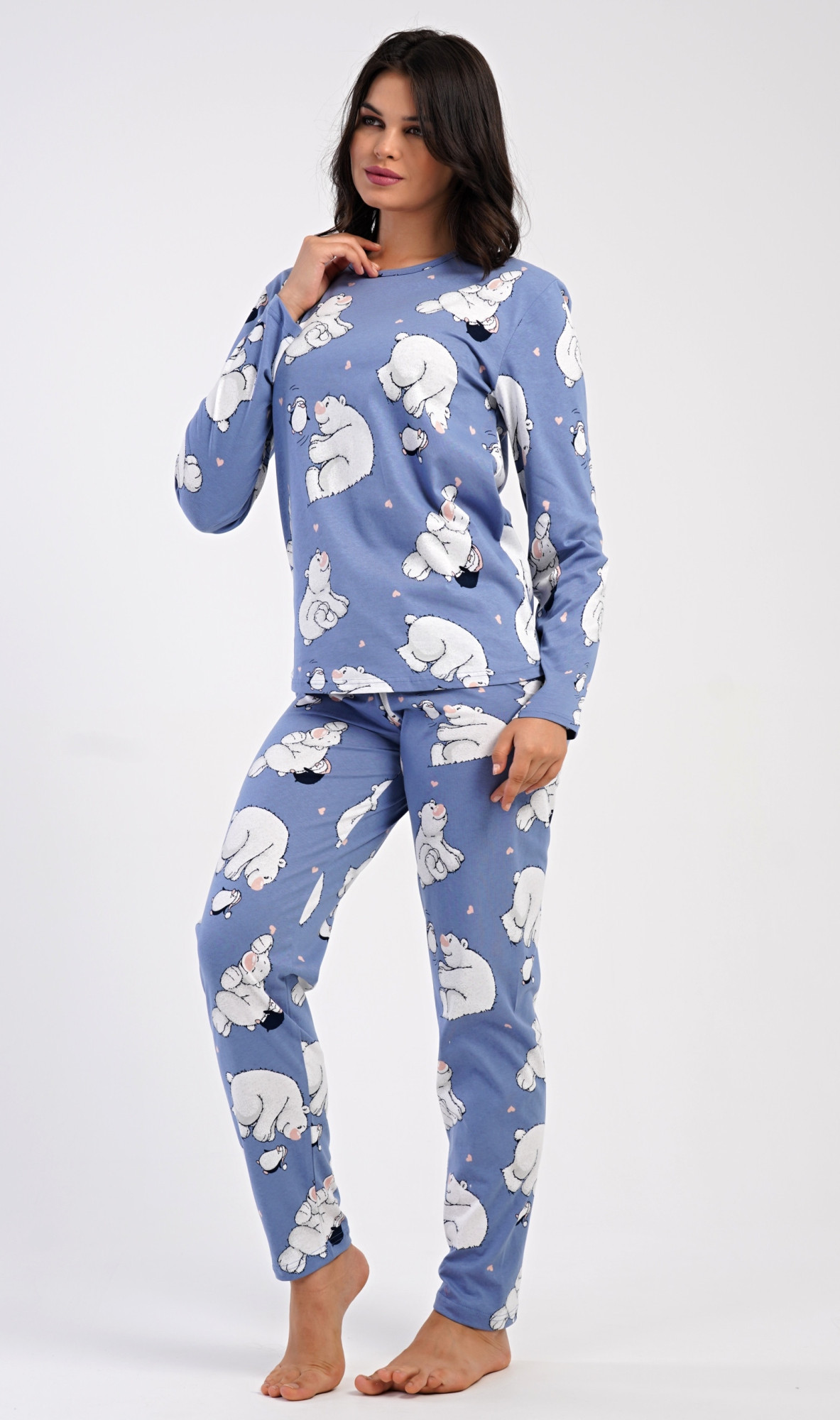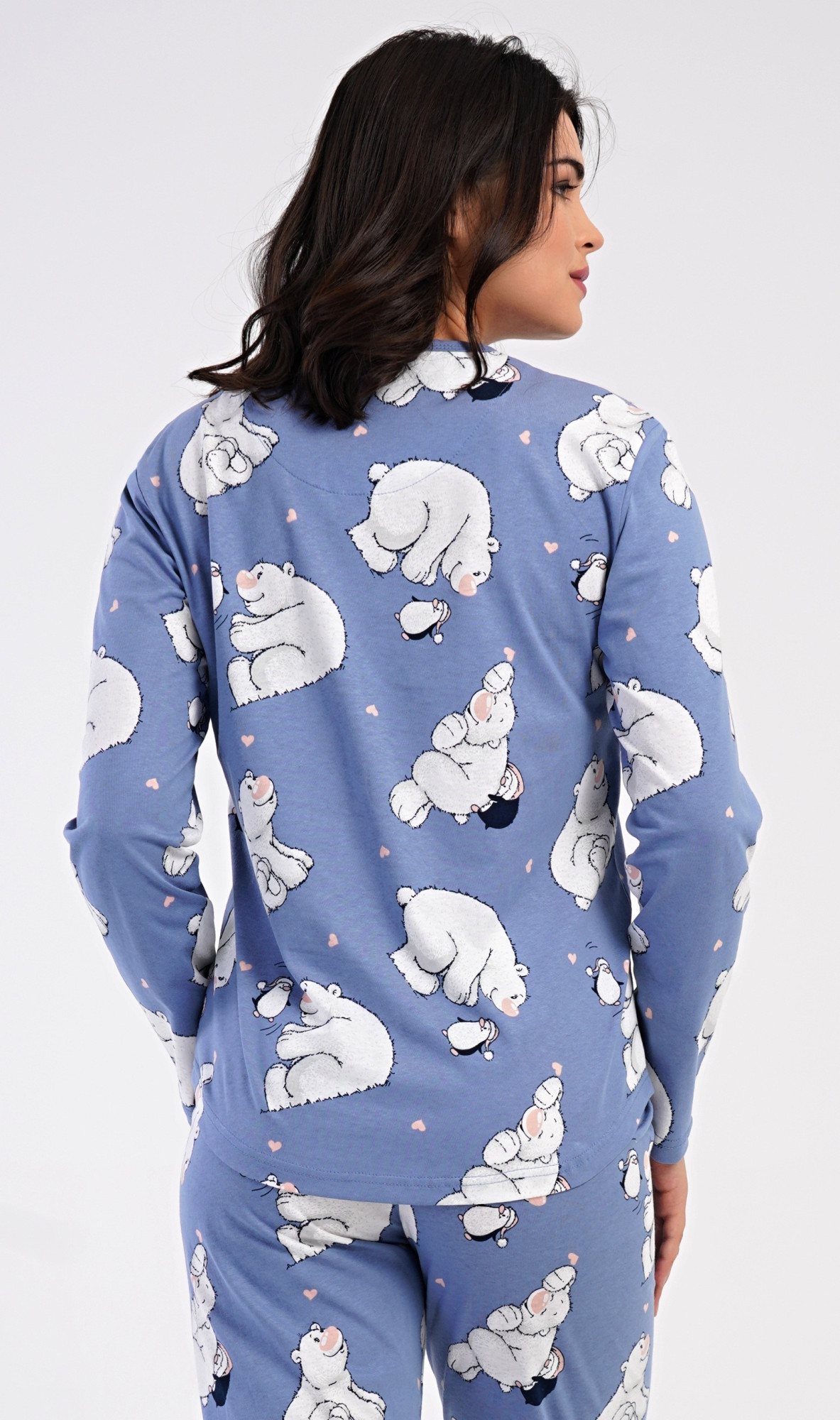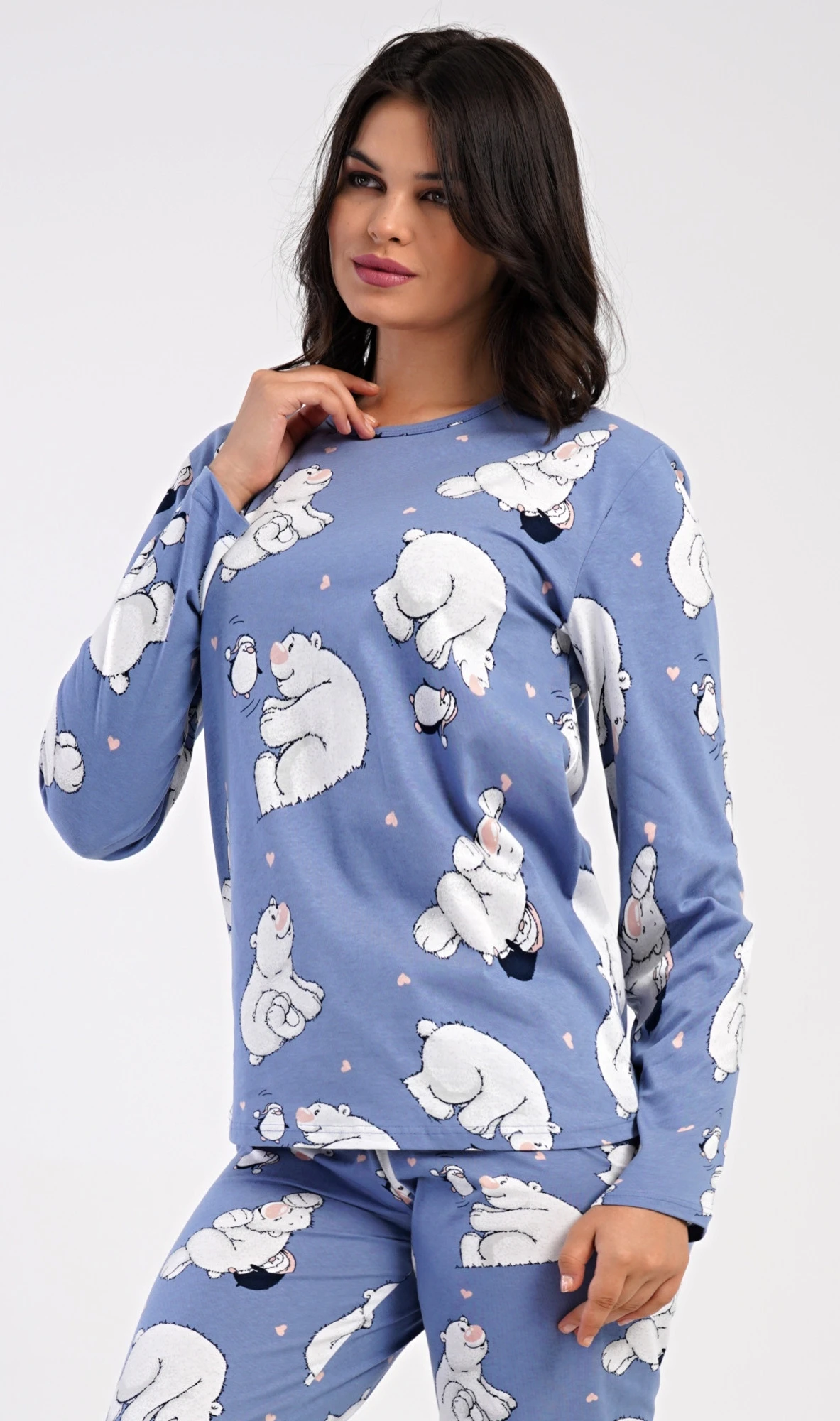 Dámské bavlněné dlouhé pyžamo Tučňák a méďa. Dámské pyžamo se skládá z trika s dlouhým rukávem a dlouhých kalhot. Triko s kulatým výstřihem je ozdobeno obrázky ledních medvědů. Tento motiv se opakuje i na kalhotách, které mají v pase gumu a šňůrku na stažení, nemají kapsy. Použitý bavlněný materiál je poddajný a příjemný na dotek.