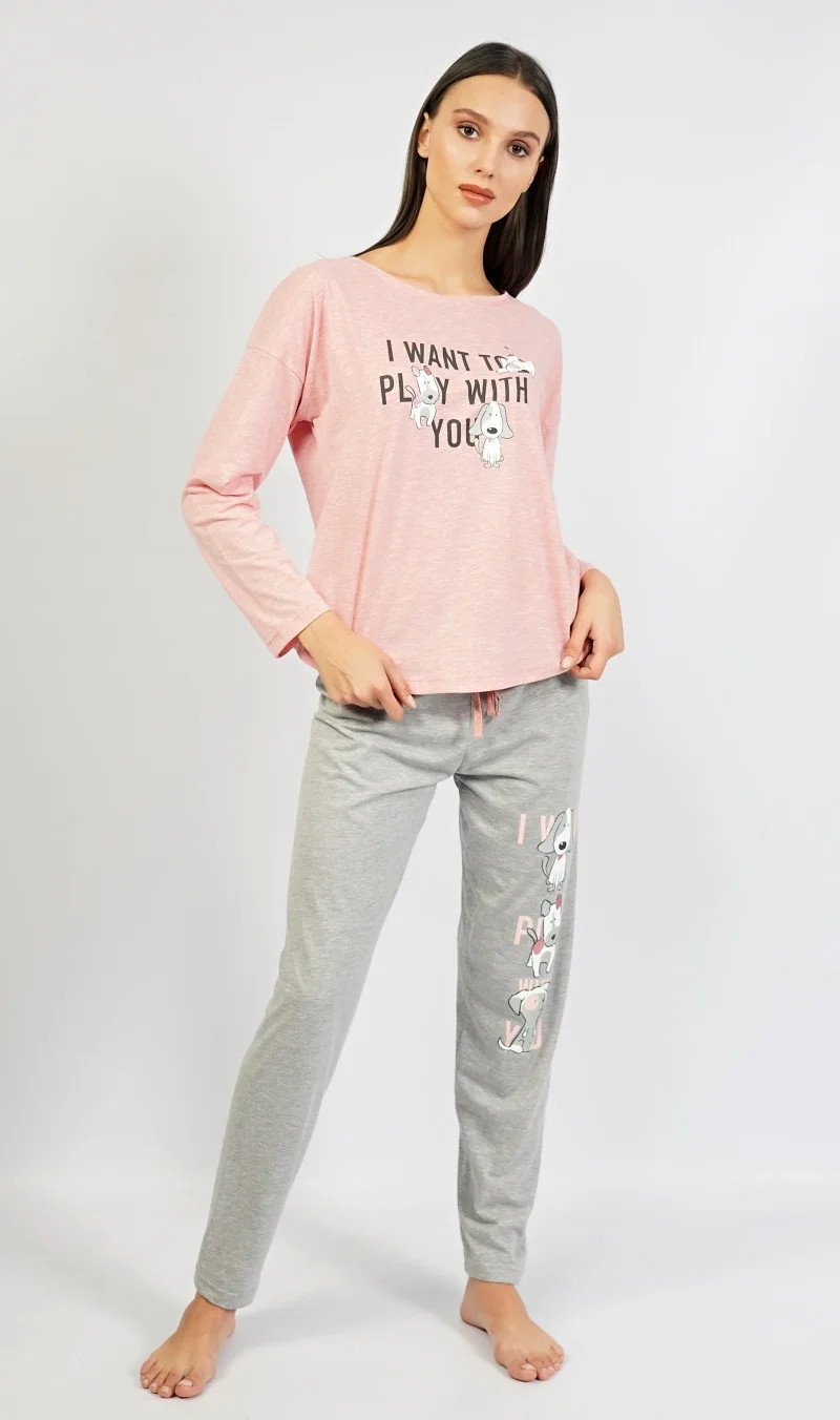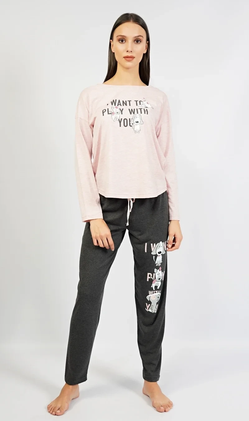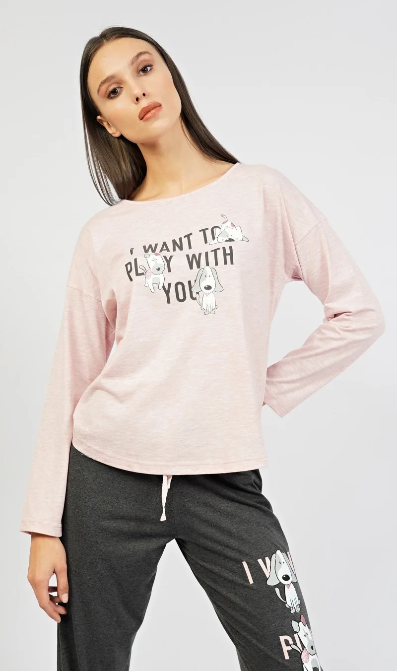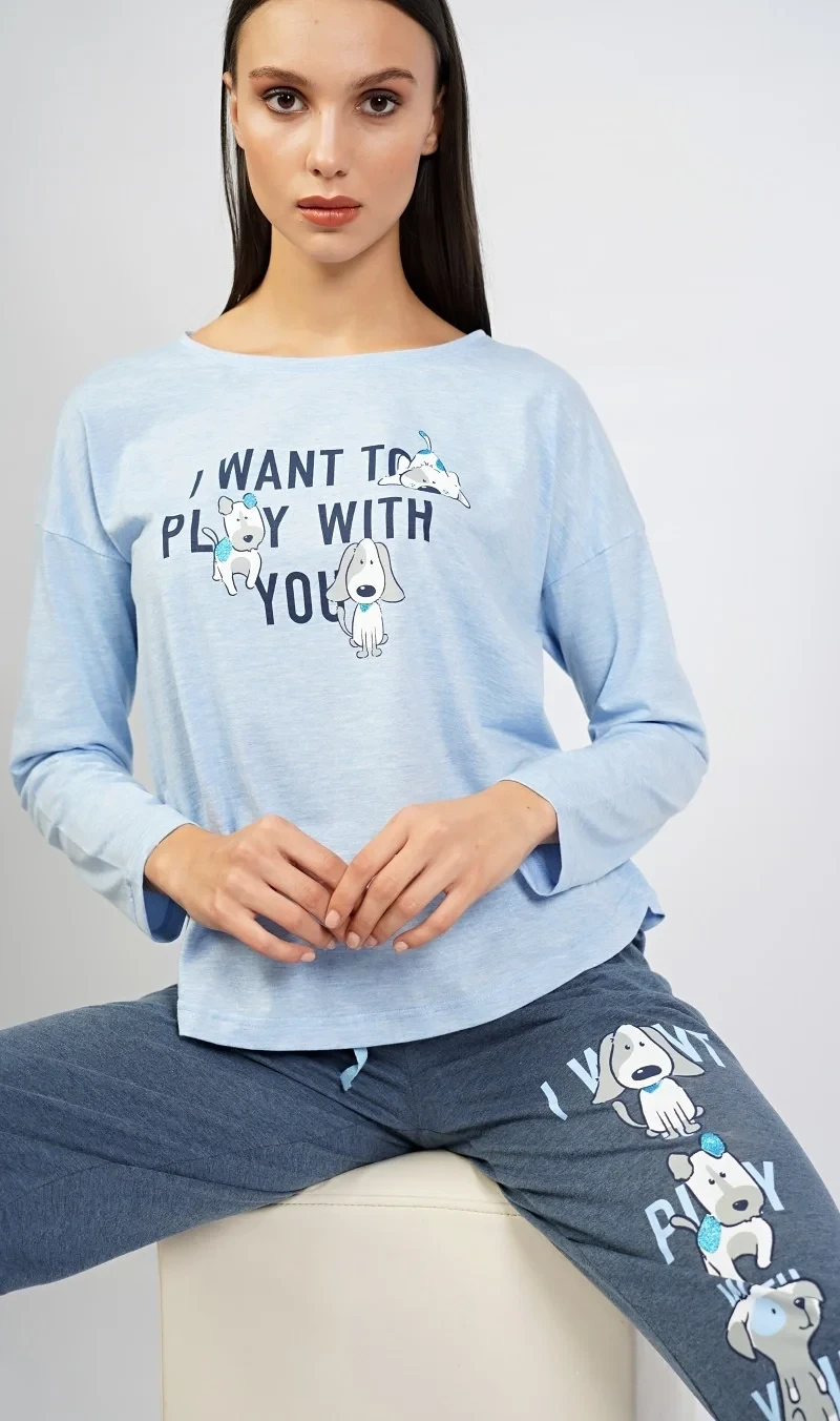 Dámské pyžamo dlouhé Veronika. Dámské pyžamo se skládá z trika s dlouhým rukávem a dlouhých kalhot. Pyžamo je ve třech barevných kombinacích Triko je jednobarevné s potiskem pejsků s nápisem I WANT TO PLAY WITH YOU. Tmavé kalhoty jsou do gumy, se šňůrkou na stažení v pase .Na nohavicí se opakuje motiv pejsků. Použitý materiál je poddajný a příjemný na dotek. Pyžamo je vhodné na denní nošení.