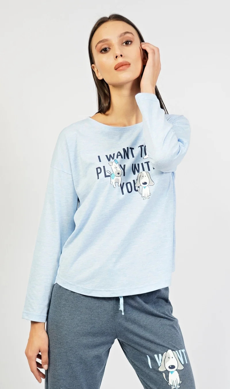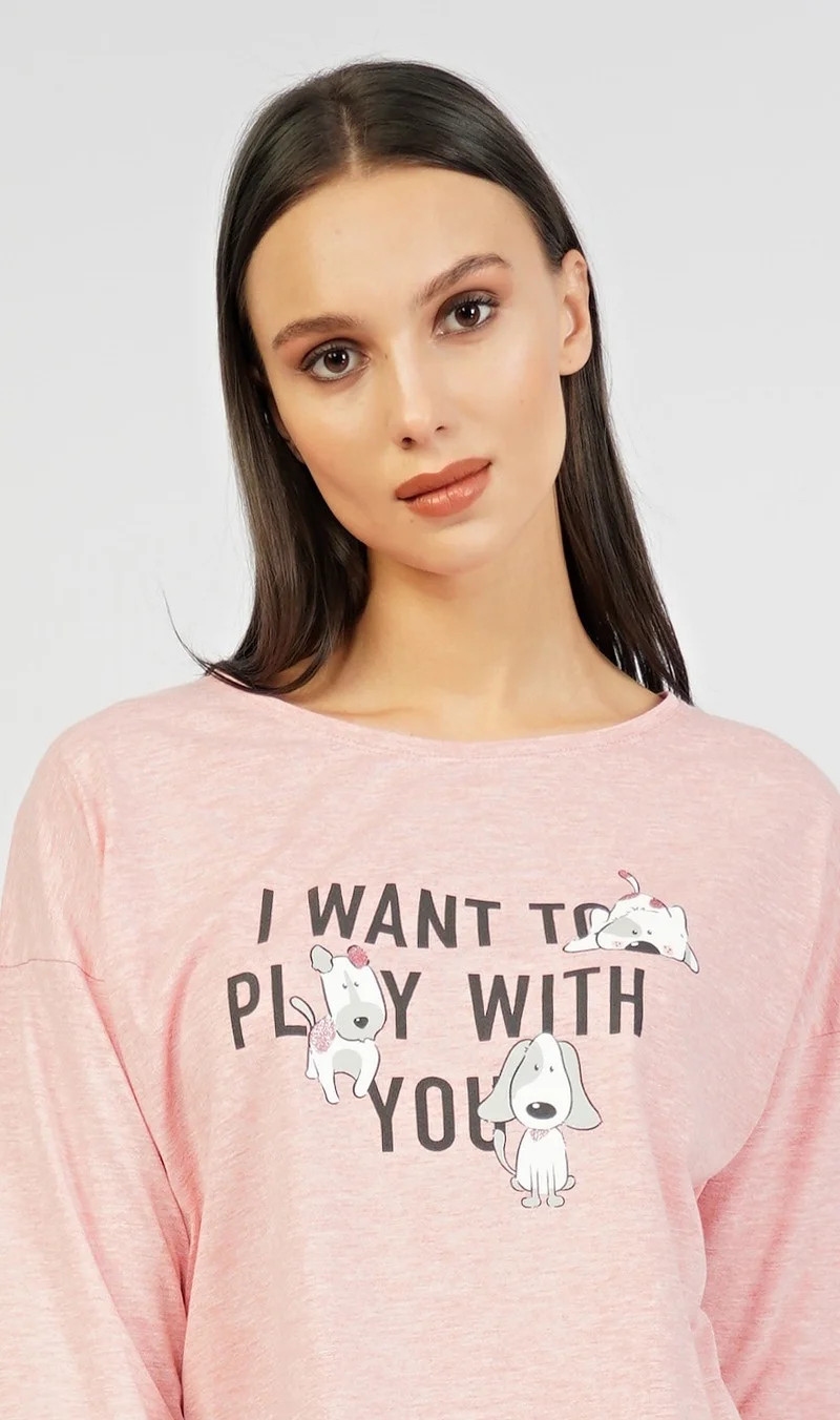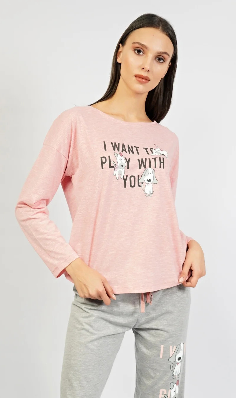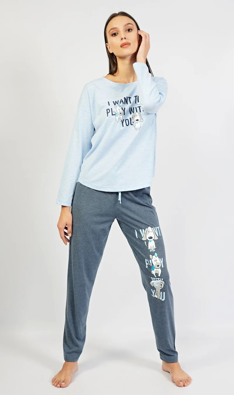 Dámské pyžamo dlouhé Veronika. Dámské pyžamo se skládá z trika s dlouhým rukávem a dlouhých kalhot. Pyžamo je ve třech barevných kombinacích Triko je jednobarevné s potiskem pejsků s nápisem I WANT TO PLAY WITH YOU. Tmavé kalhoty jsou do gumy, se šňůrkou na stažení v pase .Na nohavicí se opakuje motiv pejsků. Použitý materiál je poddajný a příjemný na dotek. Pyžamo je vhodné na denní nošení.