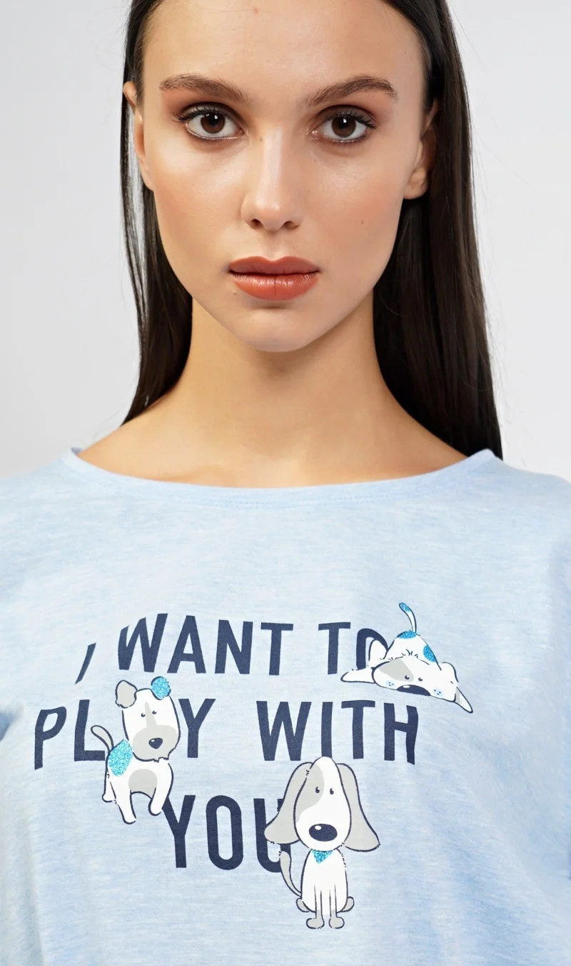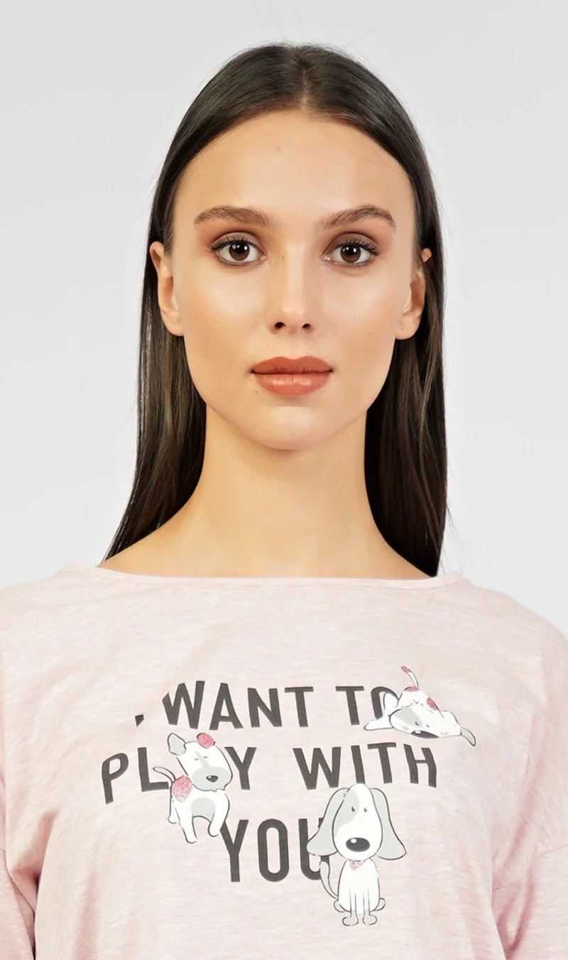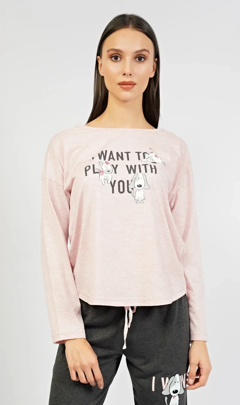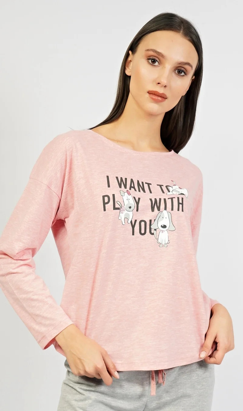 Dámské pyžamo dlouhé Veronika. Dámské pyžamo se skládá z trika s dlouhým rukávem a dlouhých kalhot. Pyžamo je ve třech barevných kombinacích Triko je jednobarevné s potiskem pejsků s nápisem I WANT TO PLAY WITH YOU. Tmavé kalhoty jsou do gumy, se šňůrkou na stažení v pase .Na nohavicí se opakuje motiv pejsků. Použitý materiál je poddajný a příjemný na dotek. Pyžamo je vhodné na denní nošení.