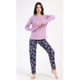 Dámské bavlněné dlouhé pyžamo Violetta. Dámské pyžamo se skládá z trika s dlouhým rukávem a dlouhých kalhot. Triko je jednobarevné, zdobené obrázkem květů a drobným nápisem 'Never stop exploring'. Květinový potisk se opakuje i na kalhotách, které mají v pase gumu a šňůrku na stažení, nemají kapsy. Použitý bavlněný materiál je poddajný a příjemný na dotek.