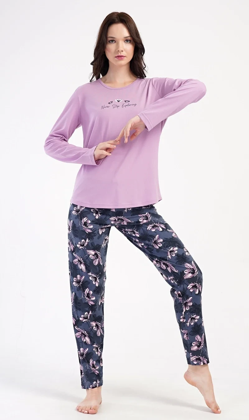 Dámské bavlněné dlouhé pyžamo Violetta. Dámské pyžamo se skládá z trika s dlouhým rukávem a dlouhých kalhot. Triko je jednobarevné, zdobené obrázkem květů a drobným nápisem 'Never stop exploring'. Květinový potisk se opakuje i na kalhotách, které mají v pase gumu a šňůrku na stažení, nemají kapsy. Použitý bavlněný materiál je poddajný a příjemný na dotek.