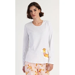Dámské pyžamo dlouhé Žirafa. Dámské pyžamo se skládá z trika s dlouhým rukávem a dlouhých kalhot. Triko je jednobarevné, zdobené drobným nápisem a obrázkem spící žirafky. Stejný motiv se opakuje i na kalhotách, které mají v pase gumu a šňůrku na stažení, nemají kapsy. Světle šedé triko je složeno ze 70-ti % bavlnou, kalhoty jsou čistě bavlněné. Použitý materiál je poddajný a příjemný na dotek.